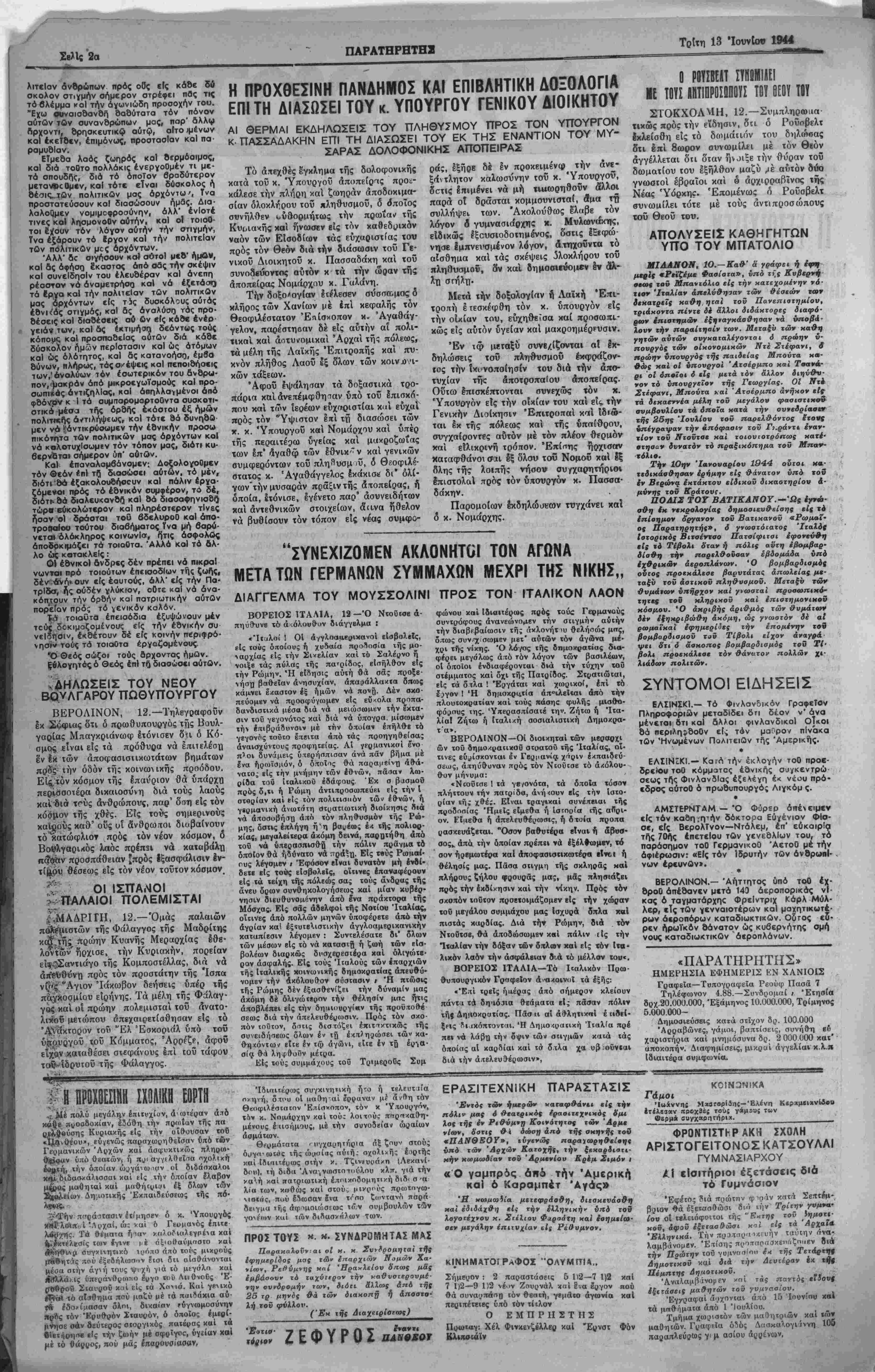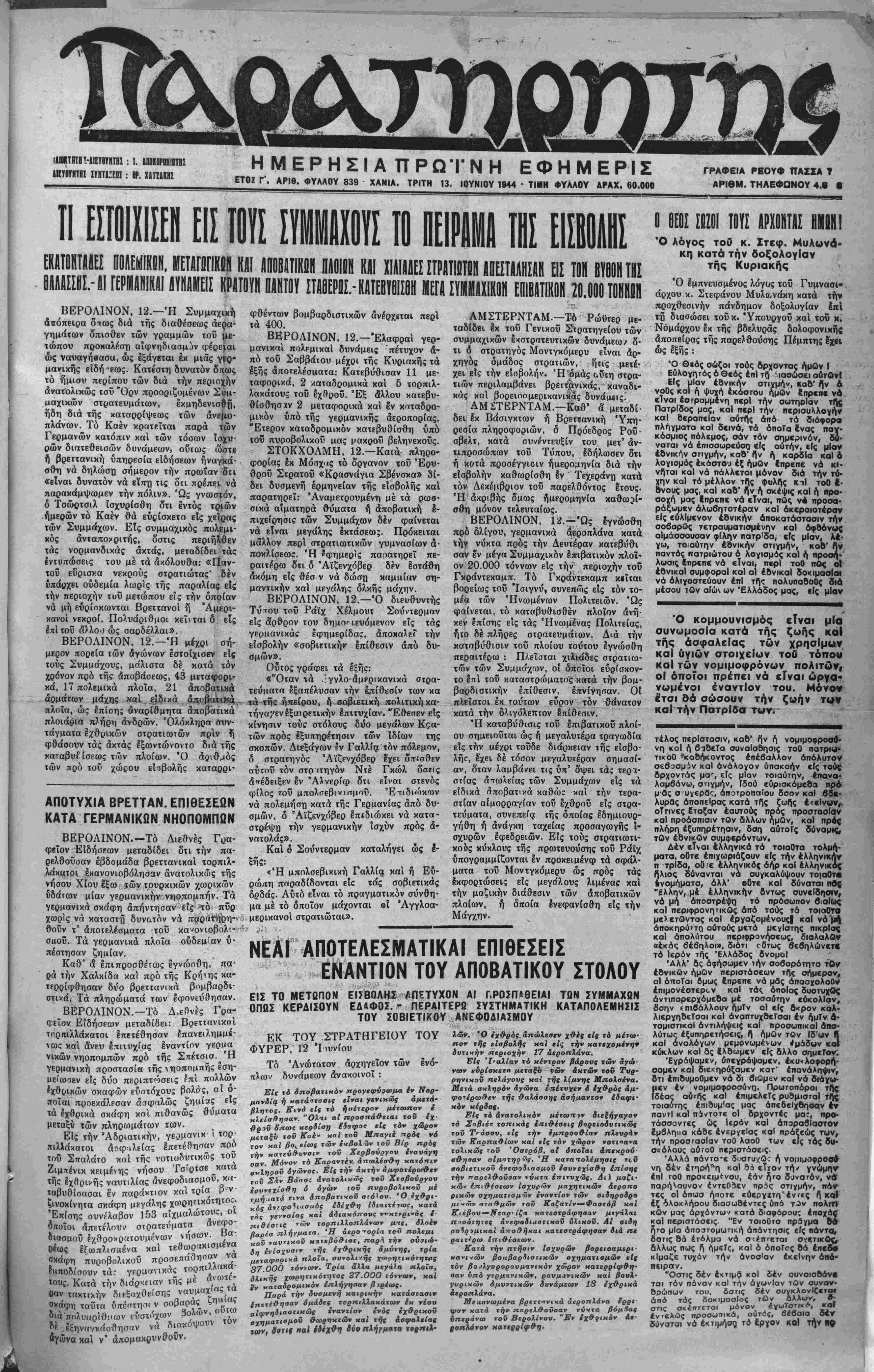 ΕΤΟΣ Γ'. ΑΡΙΘ. ΦΥΛΑΟΥ 839 ΧΑΝΙΑ. ΤΡΙΤΗ 13. ΙΟΥΝΙΟΥ 1944 - ΤΙΜΗ ΦΥΑΑΟΥ ΔΡΑΧ. 60.000