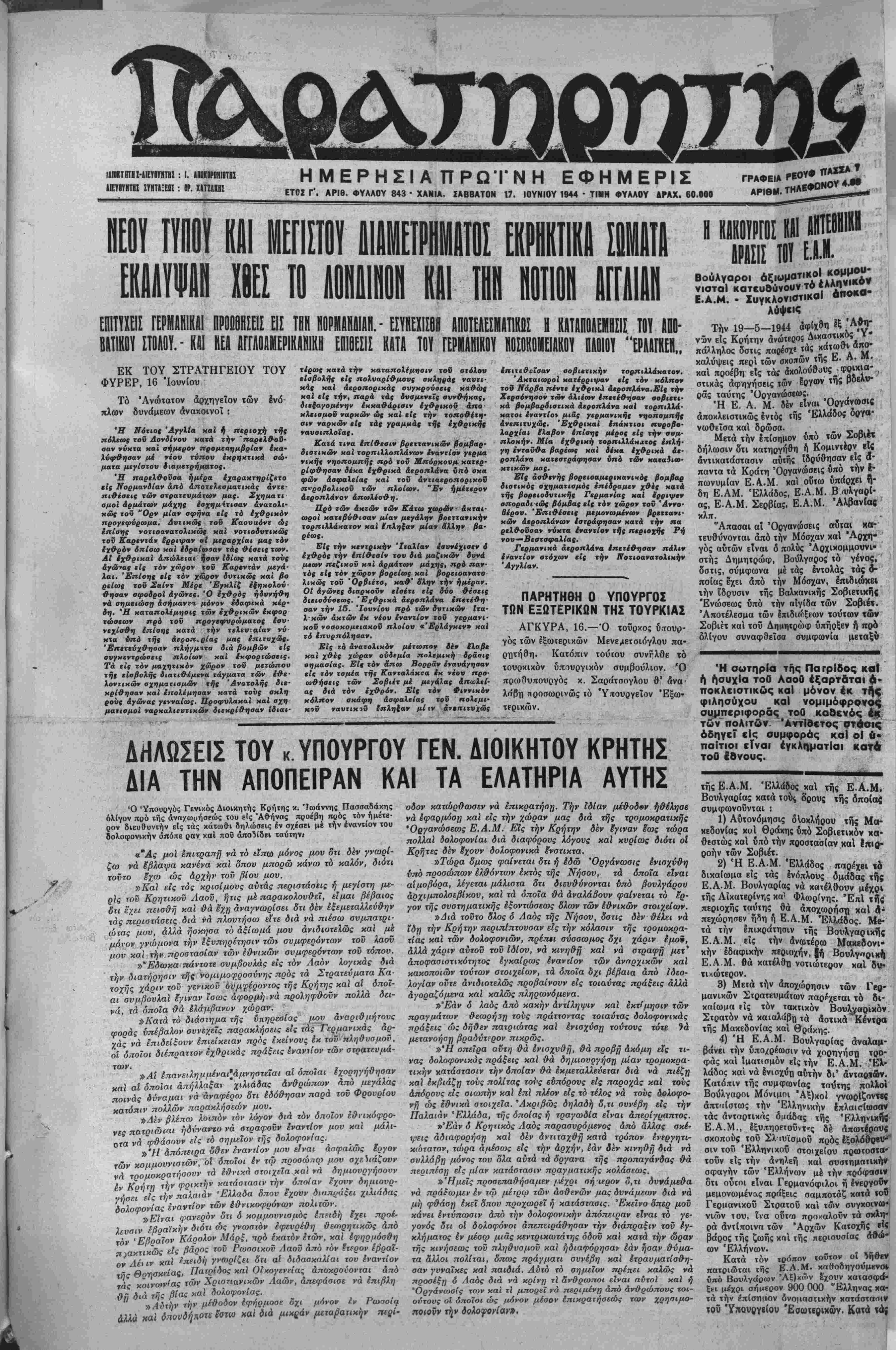 ΕΤΟΙ Γ'. ΑΡΙΘ. ΦΥΛΛΟΥ 843 · ΧΑΝΙΑ, ΣΑΒΒΑΤΟΝ 17. ΙΟΥΝΙΟΥ 1944 · ΤΙΜΗ ΦΥΑΑΟΥ ΔΡΑΧ. 60.000