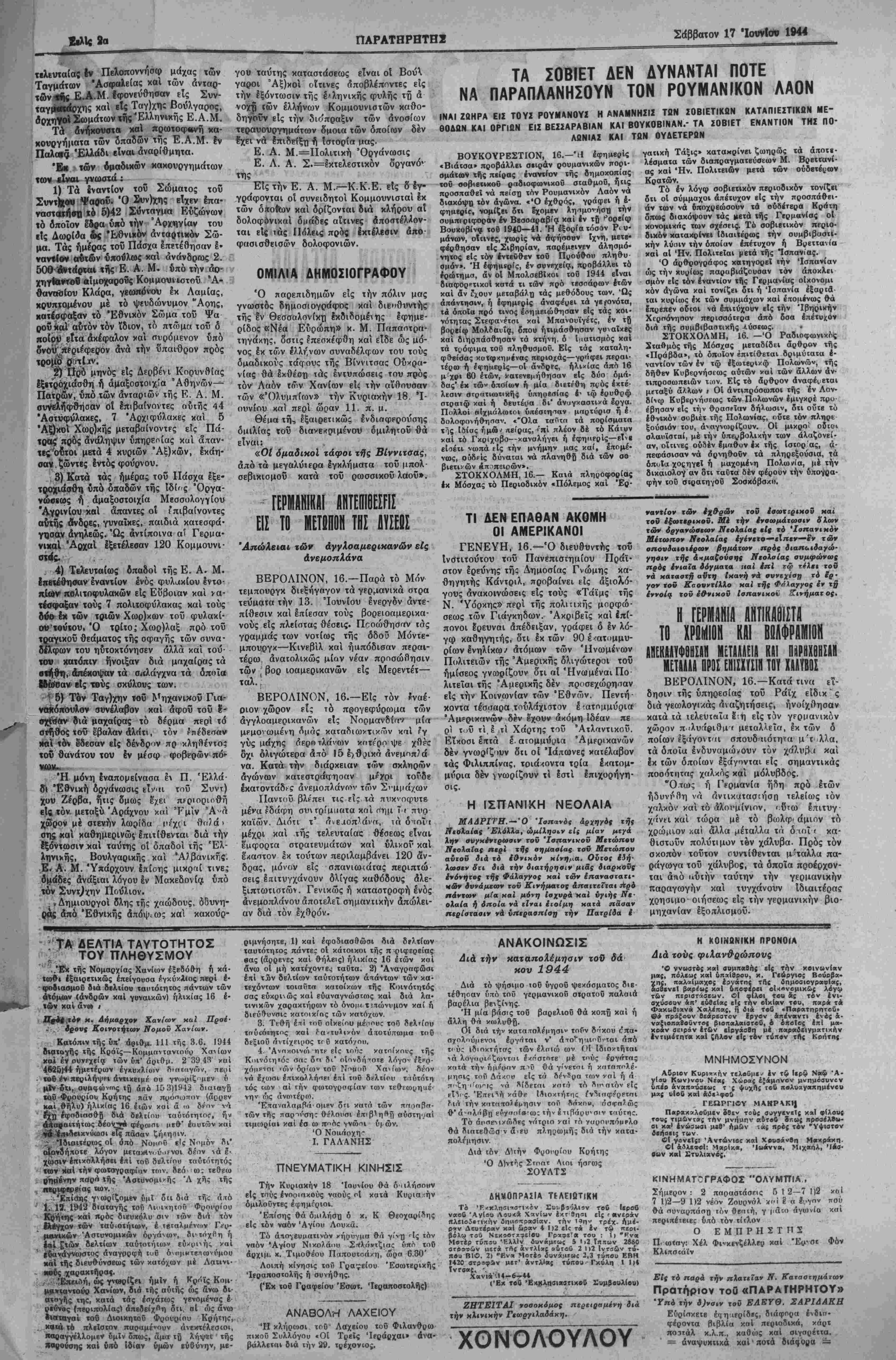 χρώμιον /-.αί άλλα μέταλλα τα δ ιοΐ < κα· θιστοΰν πολύτιμον τβν χάλυβα. Πρός τόν σκοπόν τούτον τυντίθενται μ'ταλλα πα- ράγωγα τού χάλυβος, τα όποΐα προέρχον- ται άηό αυτήν ταύτην την γερμανικήν παραγωγήν καί τυγχάνουν Ιδιαιτέρας χρησιμο οιήΐΈως είς την γερμανικήν βιο¬ μηχανίαν έξο,τλισμοΰ- "'ΤΑγ ΔΕΛΤΙΑ ΤΑΥΤΟΤΗΤΟΣ ΤΟΥ ΠΛΗΘΥΣΜΟΥ '*' ',.'βκ τής Νομαρχίας Χανίων έξβοόθη ή κά· τωθι έξαιοΐΐικώς έπείγουοα ργκΰνλΐος περί έ- -φοοιασμοϋ διά δίλιίου ταιιτόΐηΐος πάντων των όΛόμων (άνδρών χαΐ γοναικών) ήλικίας 16 έ- , Των χαί άν» ι Πΐίί,τΑ* Η. Δήμαρχον Χανίων χαί Προέ- δρονς Κοινοτήΐων Νομόν Χανίων. Κατόπιν τής ύιτ' άβιθμ. 111 τής 3.6. 1944 διοταγής τής Κράϊς—Κομμα>τανιουο Χανίων