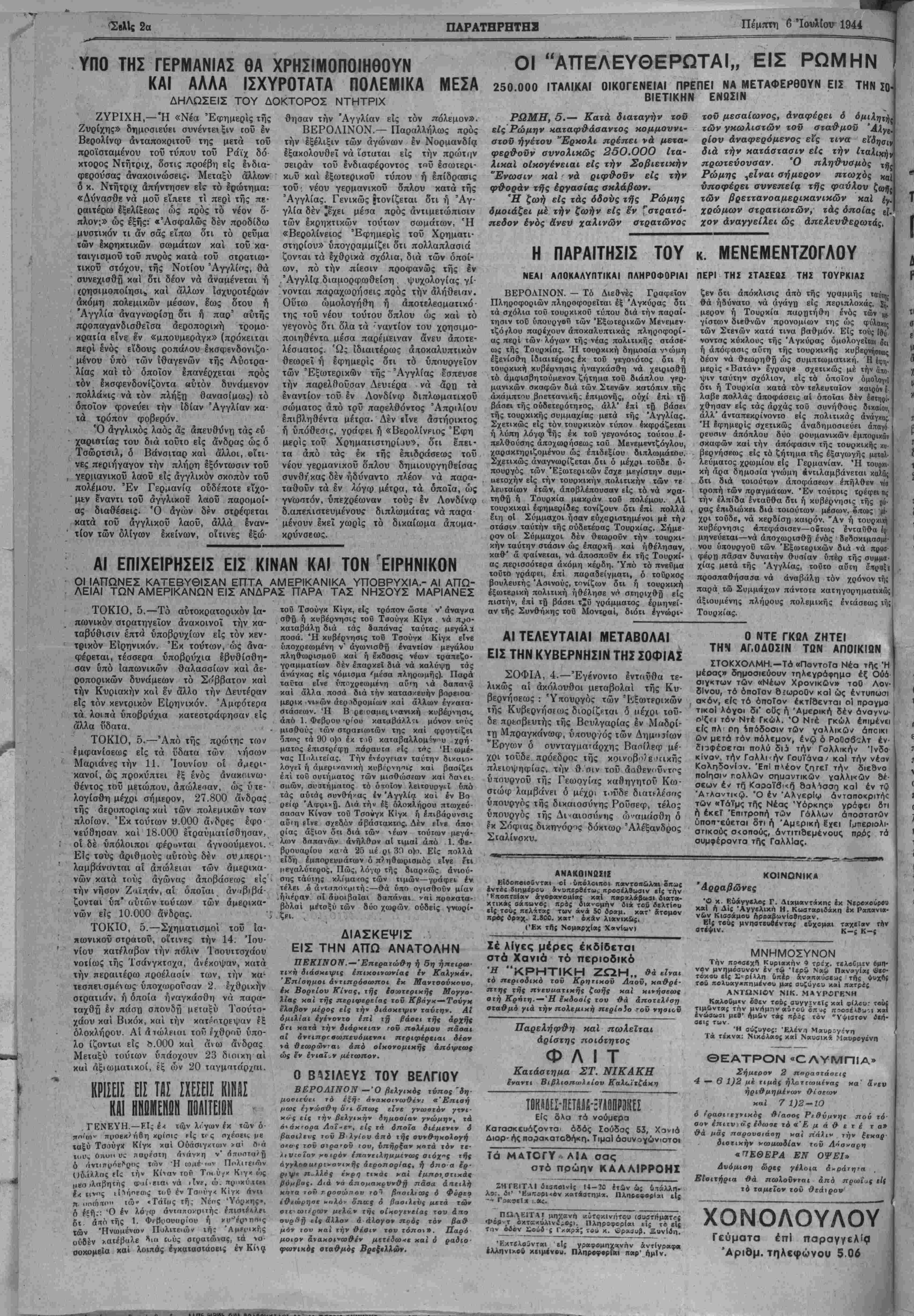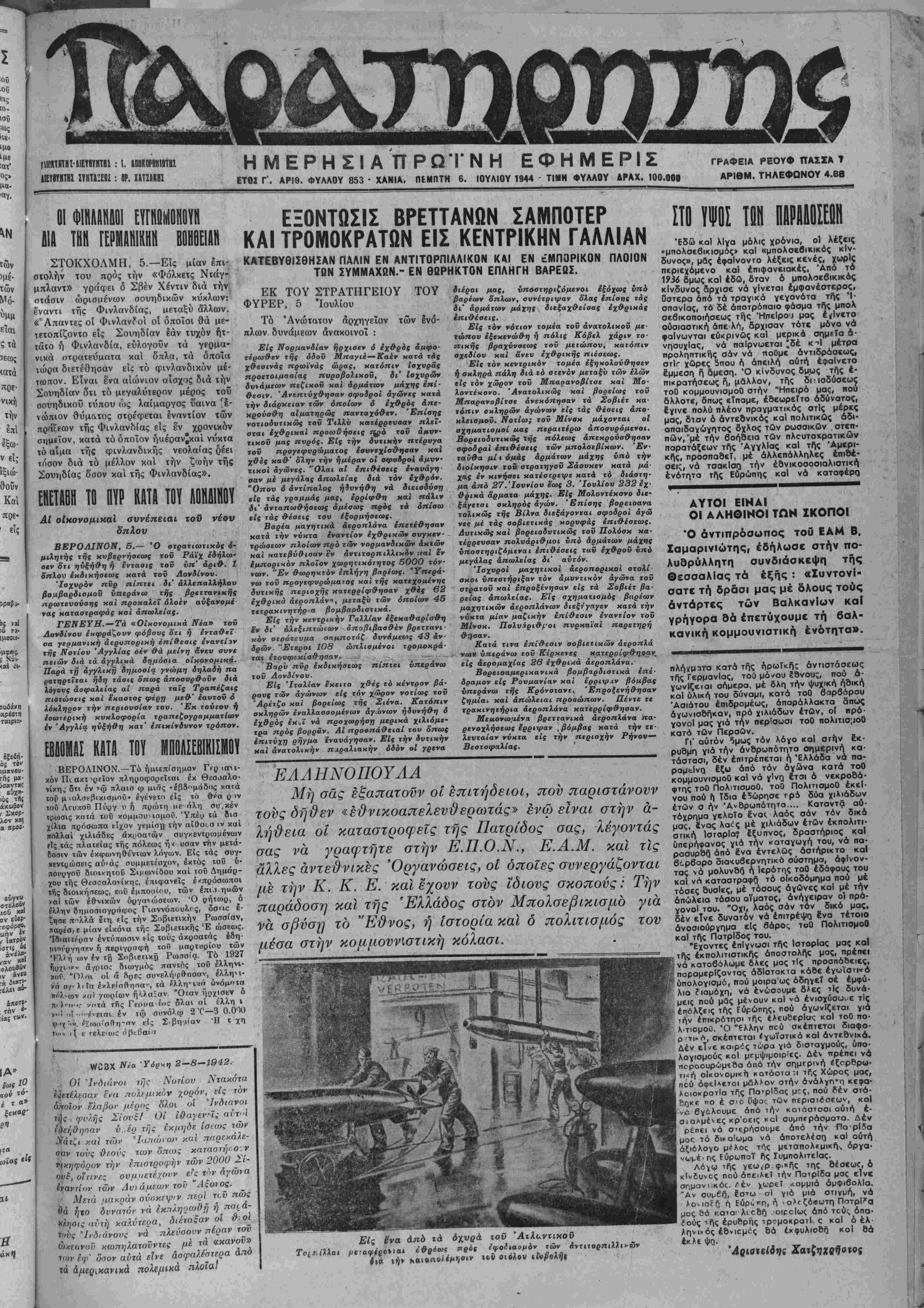 ΓΓΟΣ Γ'. ΑΡΙΘ. ΦΥΛΛΟΥ 853 · ΧΑΝΙΑ, ΠΙΜΠΤΗ 6. ΙΟΥΛΙΟΥ 1944 - ΤΙΜΗ ΦΥΛΛΟΥ ΔΡΑΧ. 100.000
