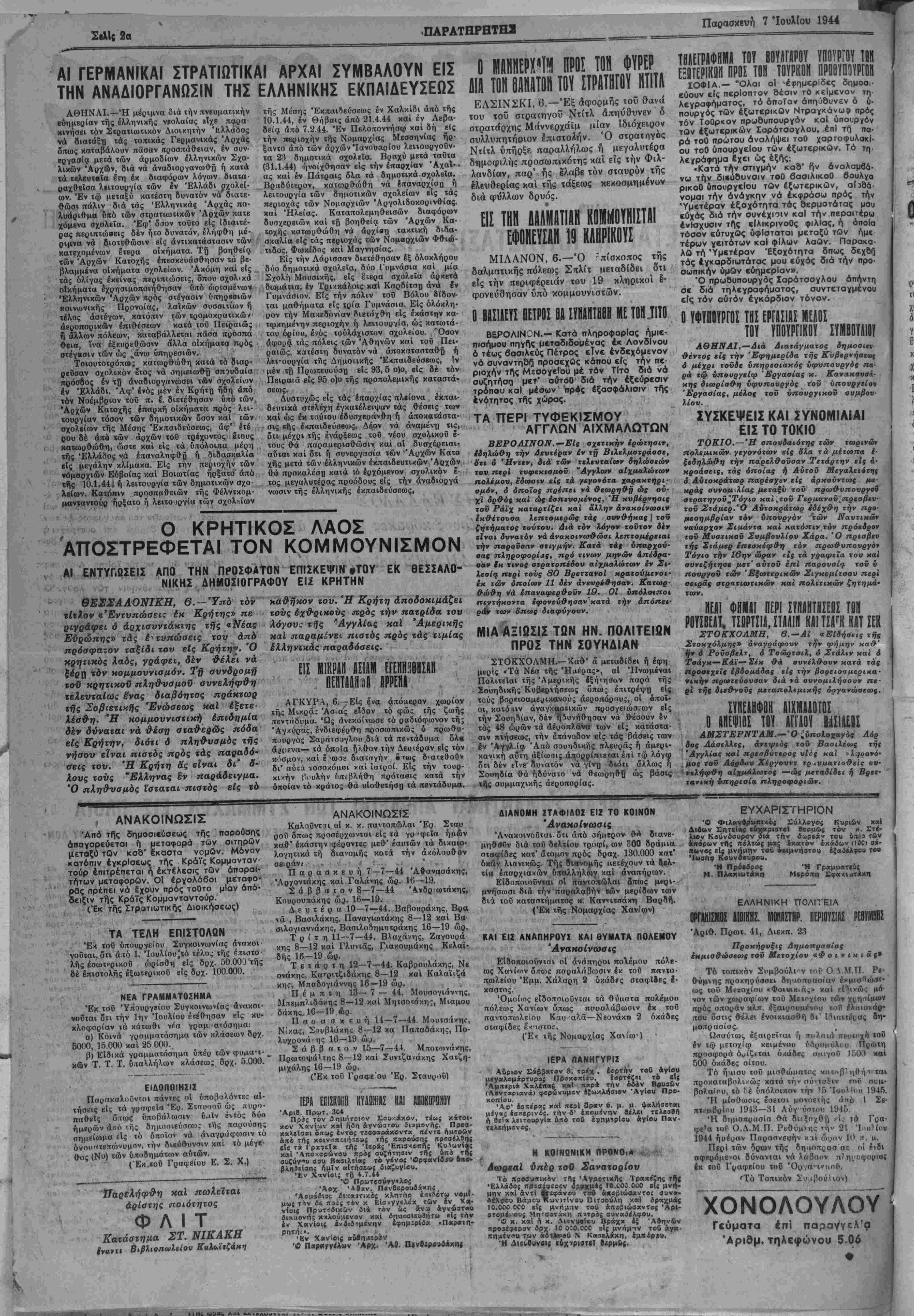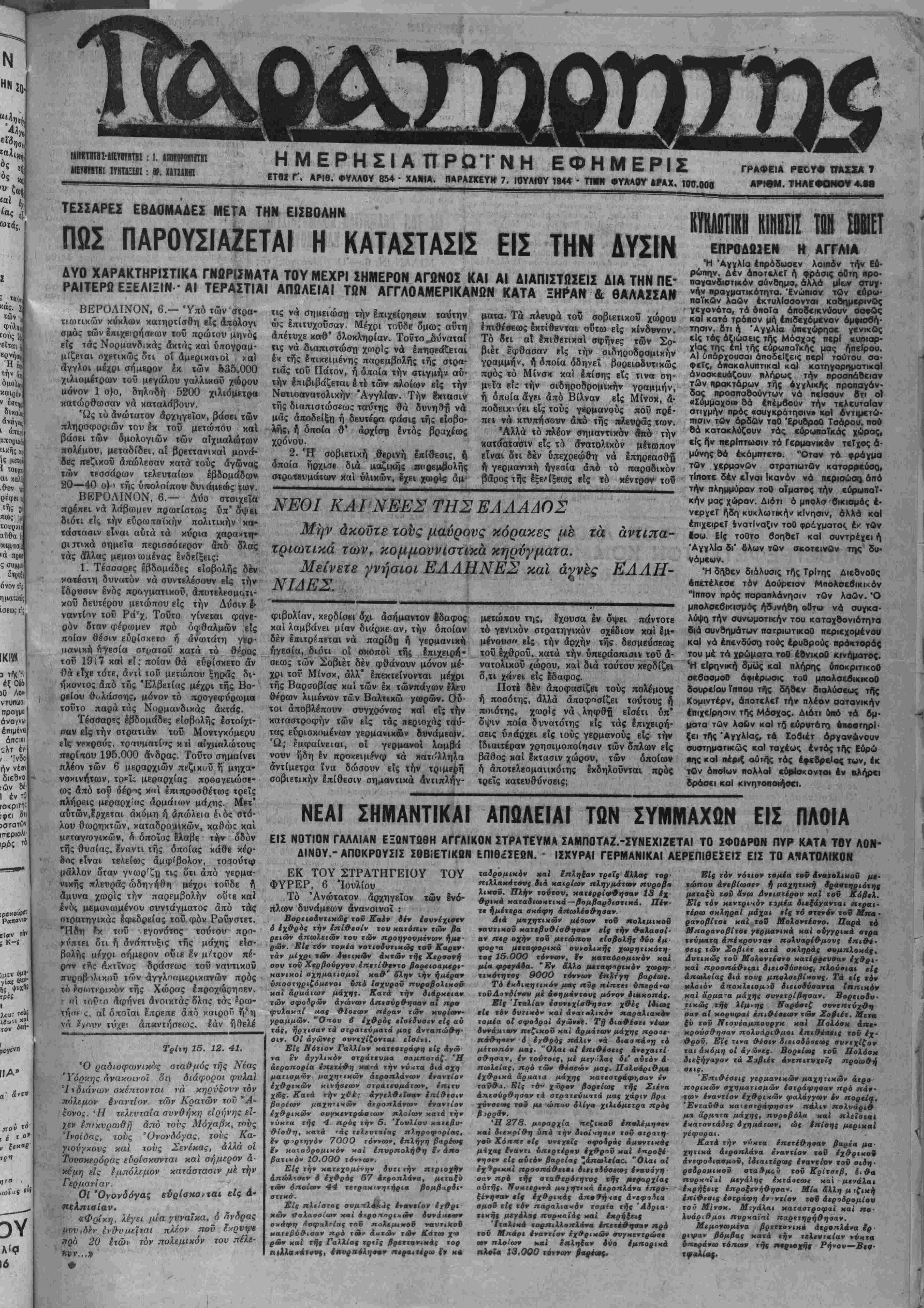 ΕΤΟΙ Γ'. ΑΡΙβ. ΦΥΛΛΟΥ 854 ■ ΧΑΝΙΑ, ΠΑΡΑΙΚΕΥ» 7. ΙΟΥΛΙΟΥ 1944 ■ ΤΙ·* ΦΥΑΛΟΥ ·»ΑΧ. 100.000