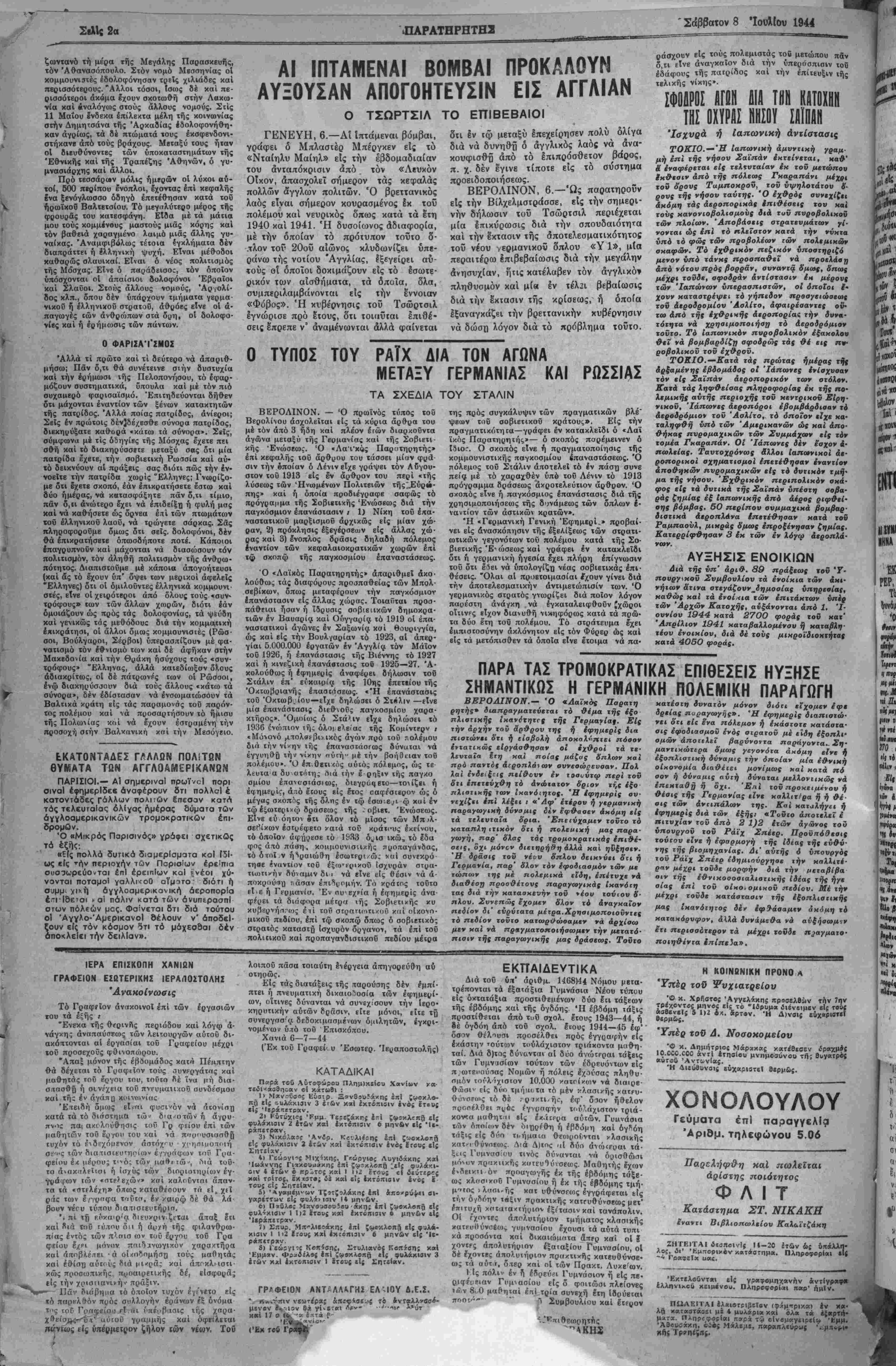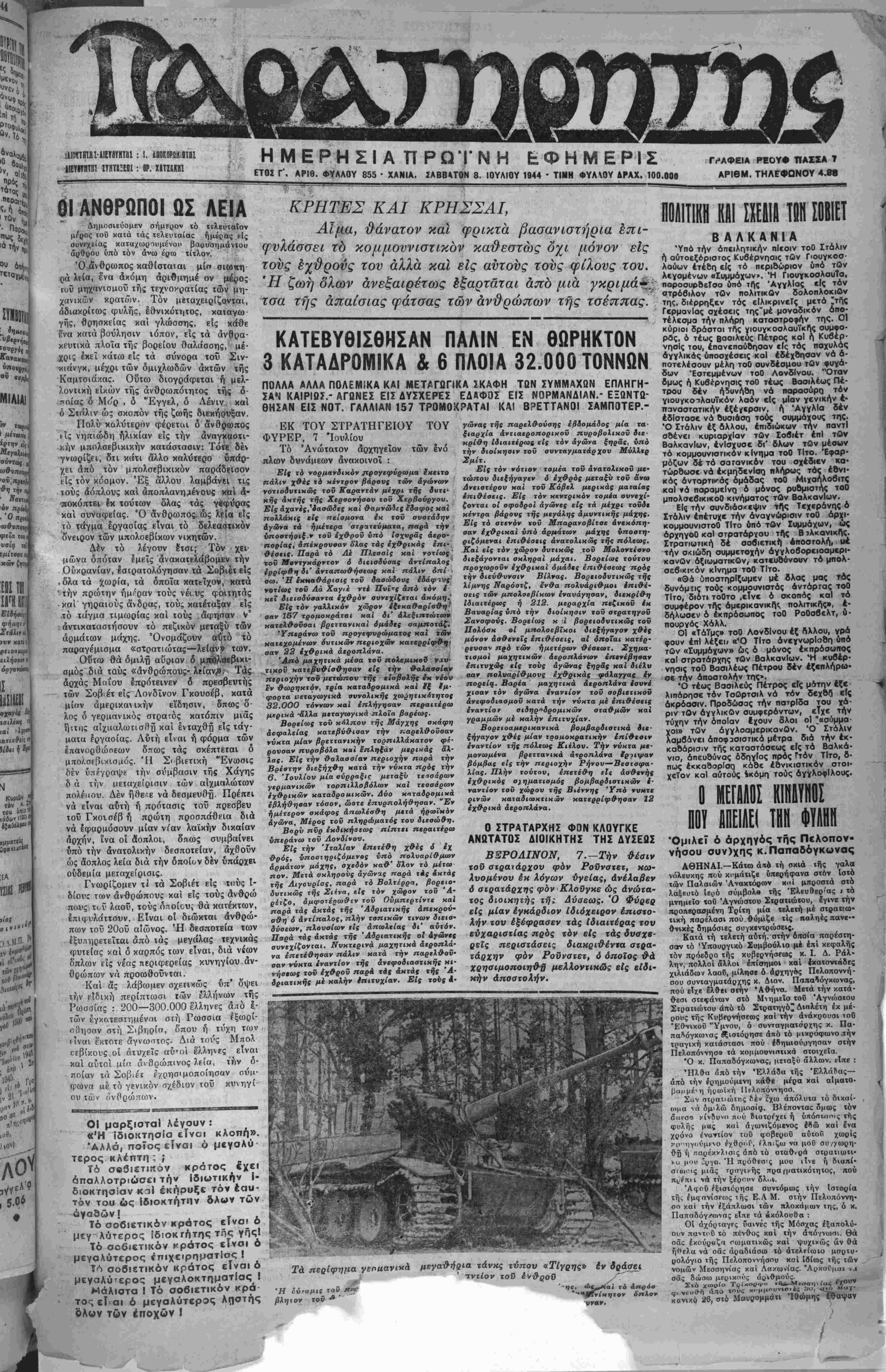 ΕΤΟΣ Γ'. ΑΡΙΘ. ΦΥΛΛΟΥ 855 - ΧΑΝΙΑ, ΣΑΒΒΑΤΟΝ 8. ΙΟΥΛΙΟΥ 1944 - ΤΙΜΗ ΦΥΛΝΟΥ ΔΡΑΧ. 100.000