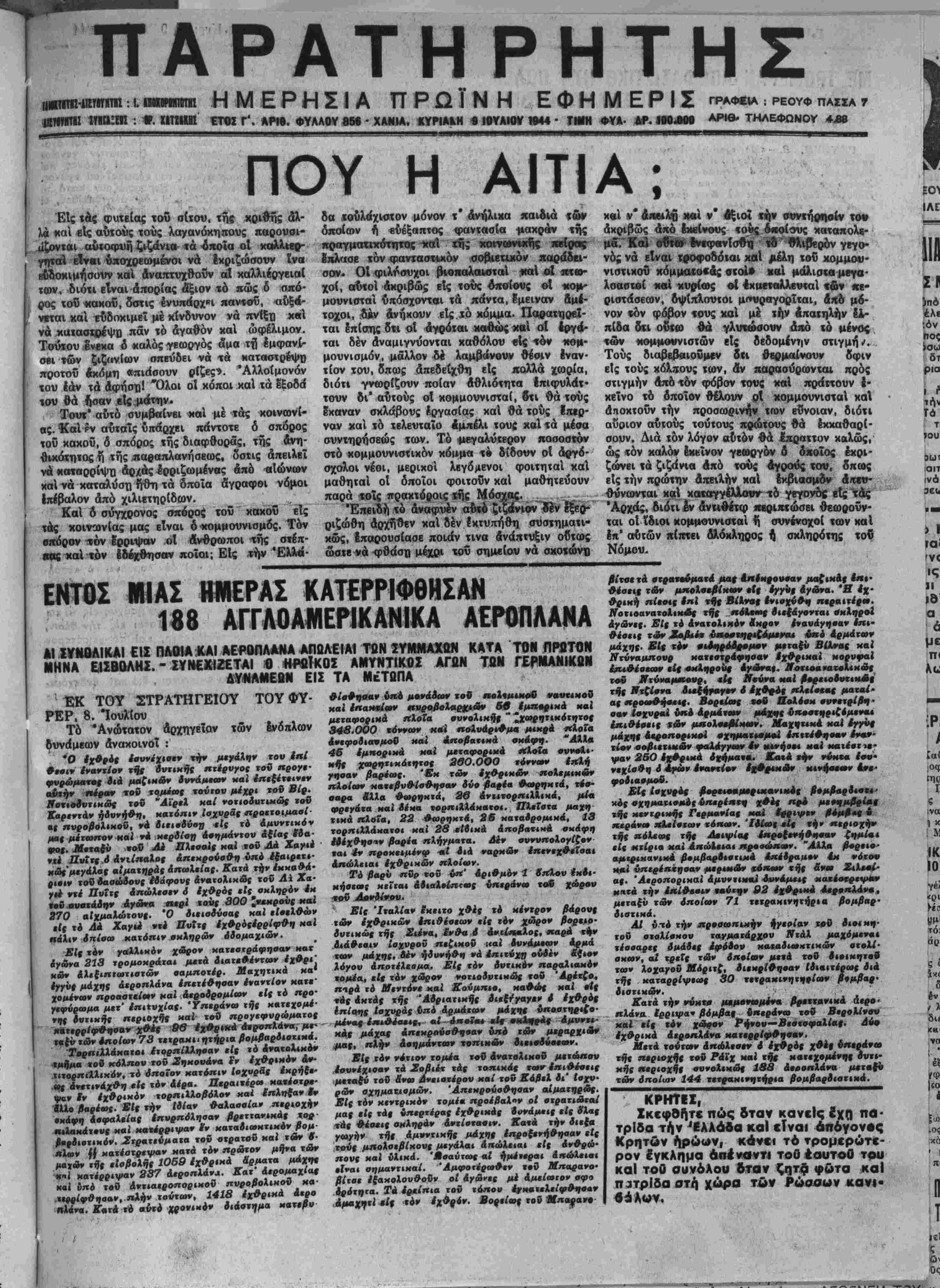 λοαβτβί «αί «υοίος «Ι 4κι»τ«λλ«υταί «£ν <κ· ριστάσεων, δψΐπλσυτοι μ(~ραγοοΐται, ά/ιδ μό¬ νον «όν φόβον «ούς χαί μέ την βπατηλήν ελ- πίδα δϊΐ ο&τω θά γλυτώσουν άπό τό μένος ϊ&* Νομ#ο«νισιων είς δεδομένην στιγμήν Τούς διαββββιονμεν δή θβομαίνουν δφιν είς τούς κολπους των, &ν παρασύρωντα; πρός στιγμήν απδ τόν φόβον τονς χαί ποάττουν I- χεΐνο τό οποίον θέλουν οί χομμουνκπαΐ χαί άποκτοΰν την προσωριντίν των εΰνοιαν, διότι αΰοιον αύτούς τούτους ποώτους θά έκκαθαοί- σονν. Διά τον λόγον αυτόν θά έπραττον καλώς, ώς «όν καλόν εκείνον γβωργόν δ δχοΐος έκρι- ζώνει τα ζιζάηα άπό «ούς άγοούς τον, όπως είς την πρώτην απειλήν χαί εκβιασμόν Αιτεν- θύνωνται χαί χαχο^τγελΐονττδ νεγονος είς τάς Αρχάς, διότι έν άνιιθέτω ΐιεοΐΛϊωο-Εΐ θεωοοΰν- ται οί ΐδιοι κομμουνισταί ή συνένοχοί των χαί Ιη' αυτών πίπτει όλόκληρος ή σκληοότης τοΰ Νόμον. ΕΝΤΟΣ ΜΙΑΣ ΗΜΕΡΑΣ ΚΑΤΕΡΡΙΦΘΗΣΑΝ 188 ΑΓΓΑΟΑΜΕΡ1ΚΑΝΙΚΑ ΑΕΡΟΠΛΑΗΑ ΑΙ ΣϊϋΟΑΙΚΑΙ ΕΙΣ ΠΑΟ1Α ΚΑΙ ΑΕΡβΠΛΔΝΑ ΑΓΙΟΛΕ,ΑΙ ΤΩΝ ΣΥΓτΙΜΑΧαΝ ΚΑΤΑ ΤΟΝ ΠΡΟΤΟΝ ΜΗΝΑ Ε.ΙΣΒΟΛΗΣ. - Σ¥Ν€ΚΙ2ΕΤΑΙ β γΙΜγΚΟΣ ΑΜΥΝΤΙΚΟΣ ΑΓΩΝ ΤΟΝ ΓΕΡΜΑΝΙΚΟΝ ΔΎΚΑΜΕΟΝ ΕΙΣ ΤΑ ΜέΤΩΠΑ ΕΚ ΤΟΥ ΣΤΡΑΤΉΓΕΙΟΥ ΤΟΥ ΦΎ- ΡΕΡ. 8. Ιουλίου Τό Ανώτατον αρχηγείαν των ενόπλων δυνάμεων ανακοινοί : Ό έχθρός εσυνέχισεν την μεγάλην τον ίηΐ 9·οιν έναντ/ον τής δντικής ητέρυγος τοδ προγε- φυρώμα«·ς διά μαζικων δυνάμεων καϊ έπεξέτεινεν α&τήν ηέραν τοϋ ταχέως τούτον μέχρι τοΰ Βίρ. ΑοτισΟυτικ&ς τοδ Άϊρελ καί νοτιοδυτιχώς τοΰ Χαρεντάν ηδυνήθη, κατόπιν Ισχυράς «ΐροετοιμασί •ς πυροβσλιχοΰ, νά διειβ<3ύβ# είς τό άμυντικόν μας μέτωπον καί νά κερδίση ασημάντου άξίας ί3α· ωος. Μεταξΰ »οδ Αό Πλεσαις καί τοΰ Δα Χαγιέ ν»έ ΙΖνϊτς ,δ άνιίπαλος απεκρούσθη ΰηό ίξαιρετι- κως'μεγάλας αιματηράς απωλείας. Κατά την εκκαθά¬ ρισιν τοθ Λαοώ&ους ίίάφονς ανατολικώς τοΰ Λΐ Χα· γ·* ντέ ΖΓυΐτς δπώλεσεν δ εχθράς είς σκληρόν έκ (οΰ«υατάδην άγωνα Αερϊ «ούς 300 ^νεκροϋς καί 270 αΐχμαλώτους. Ό διεισδύσας καί εισελθών είς τό Δα Χαγιέ ντε Πυΐΐς έχθρόςέρρίφθη καί πάλιν σπίσω κατόπιν σκληριβν δδομαχιών. £Ις τόν γαλλικόν χώρον κατεστράφησαν κατ αγηνα 2ϊ3 τρομοχράται μετά διατεθέντων έχθρι' κων άλεξιπτωτιστών οαμποτέρ. Μαχητικά κα' 'νγνς μάχης άεροπλάνα επετεθησαν εναντίον κατε¬ χομένων προασΐείων καί Οεροδρομίων είς τό προ- γεφύρωμα μετ' επιτυχίας. Υπεράνω τής κατεχομέ¬ νας δντικής περιοχής καϊ τοΰ προγεφνρώματος κβΐερρίφθηοαν χθίς ββ έχθρικά άεροπλάνα, με· (βξντών οποίων 73 τετρακιιητήρια βομβαρδιστικά. Τορπιλλάκατοι έιορπίλληοαν είς τό άνατολΐΗΟν ■τ/ιήμα τοδ κόλπον τον Σηκουάνα Γν εχθρικόν άν- τιτορπιλλικόν, τό δποίον κατόπιν Ισχυράς έχρήξε' ως άνετινάχθη είς τόν 4ίρα. Περαιτέρω χα*έοτρ«- φαν IV εχθρικόν τορπιλλοβόλον χαί ίπληξαν έν αΊΙο βαρέως. £Ις την Ιδίαν θαλασοίαν περιοχήν σκάφη ασφαλείας έπυρπόλησαν βρεττανικάς χοβ ηιλακάτσνς χαί κατέρρινκχν ίν καταδιωκτικόν βομ 'νρδιστικόν. Στρατεύμαΐα τοΰ οτρατοΰ καί των β- Λλβον ^ κατέοτρεναν κατά τόν πρώτον μήνα των μαχων τής είσβολής Ι05Ρ έχθρικά Ηρμαχα μάχη< ««ι κατέρριυ/ον 2^7 άεροπλάνα. Κατ' άερομαχίας καί υπό τοδ άντιαεροπορικοδ πνροβολικοδ κα· .«(ρρίφθηααν, πλήν τούτων, 1415 έχθρικά άερο «λονα. Κατά τό αυτό χρονικόν διάστημα κατεβυ βίτσε τα βτρα—νματά μας €η|κρο»«αν μαίικα· εει«· θέσεις των μπολσεβίκων είς ένΗν «γωνα. Ή <χ· θρική πίεσις Ι»} τής Βίλνας ενισχυθή περαιτέρω, ^νοτιοανατολικώς τής ετόΙε«ς διεξάγονται «κληροΐ άγωνες. £ΐς τό άνατολιχόν Χκρσν Ινανάγηααν ίπι- θέοεις τ«8ν Ανβ>έ« «ν«ο#ΜΤρ<<£άμ<να