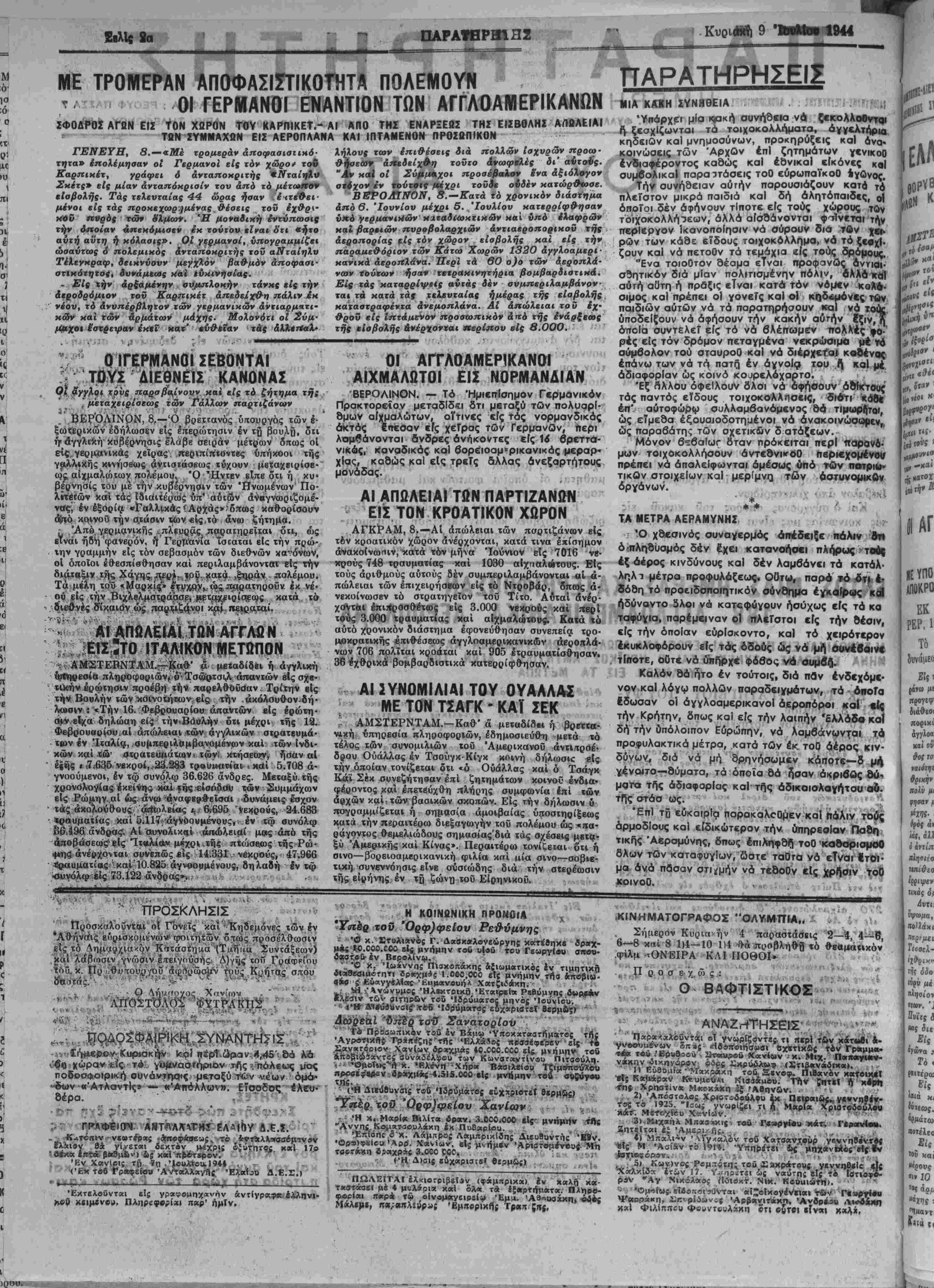 καί ίπαΗΐίων ετυρ<«βολαρ^ιων 56 ^ίμπβρικά καί μεταφορικα πλοΓα συνολικήν " Χωρητικότητος 343.000 τόννων κ·ϊ εΐολνάρι^μα μικρά «λοΓα άνεφοδιανμοΰ καί 4ετοβα«Μβ σκάφη. *Άλλ« 46 έμπ-ορικα καϊ μεταφορικα Πλοΐα συν«λι- κης χωρητικότητος 200.000 τόννων ίηΐή γησαν βαρέως. Έχ των έχθρικ«5ν πολεμικήν πλοίων κατεβυθίσθησαν δύο βα§ία θωρηκτά, τίσ- σαρα ίλλα θα>ρηκ<ά, 26 άνιιτορπιλϊικά, μί« ς)ρεγάτα καϊ δέκα νορπιλλάκατοι. ΠΓλεΓστα μαχη τικά πλοΐα, 22 Αωρηκτά, 25 καΐαίρομικά, 13 τορπιλλάκαΐοι καί 28 είίικά άποβατικα σκάφη Μέχ^ησιν βα$ί* πλήγματα. Δέν συνυπολογίζ·ν ■αι <ν προκειμένφ «ί διά ναρκών έπενεχ#εΓοαι άετώλειαι Ιχθρικων πλοίον. Τό βαρύ πΰρ τοΰ νπ' αριθμόν 1 ϊπλου εκδι¬ κήσεως κείται άίιαλείπϊβς υπεράνω το© χώρβν ««ν Α·νδ/*ου. £ίς Ιταλίαν εΤκειτο χθές τό κέντρον βάρους των έχθρικών έπιθέσεων είς τόν χώρον βορειο· δυτικώς τής Σιένα, ένθα δ ά«<είΛ«λος, καρά την διάθεσιν ίσχυροΰ πεζικοΰ καί ίυνάμεων δ,ρμά των μάχηι, Λέν ήδυνήθ») νά ^πιτνχο ουδέν α^ι«ν λόγον άποτέλεομα, £ίς τόν δυτικόν παραλιθΝΟ» «ομέα, εί< τόν χώρον νοτιοδυτικως τοδ Άρέτζο. πιρά τό Μεντόνε καί Κούμπιο, καθώς καϊ ·ίς ■τας ακτάς τής Άδριατικής διεξ^γαγεν 4 έχθρός έπίΐεης Ισχυράς υπό δ,ρμάτων μάχικ νπσ.στηρι{ο- μένας έηιθέα··», «ί όχοϊ·« ·Ι« «κ>ε;ρ·< άμυντι- κάς μάχας άπεκρούσθησαν υπό »ι3ν μεραρχιΑν μας, πλήν άσημάνταν τοπικδν δ·ε··δν·«ων. ί/ς τόν νότιον τομέα τοΰ άνατολικοΰ μετώπου Ιβννέχισαν τα Σοβιέτ τάς τοπικάς των Ιπιθέοεις μεταξΰ τοΰ 3νω Δνειοτέρου καί τοΰ ΚάβιΙ δι* ίσχυ· ρων σχημαΕΐβμών, Άπεκρούσθησαν αίματηρώς. £ίς τόν κεντρικόν τομέα προέβαλην οί βτρατιώτα/ μας είς τάς ύπερτέρας έχθρικάς βανάμεις είς όΊας τας #έσεις σχληράν άντίοτασιν. Κατά την διεξα γα>γήν τής άμ»ντικής μάχης έπροξενήθηοαν είς