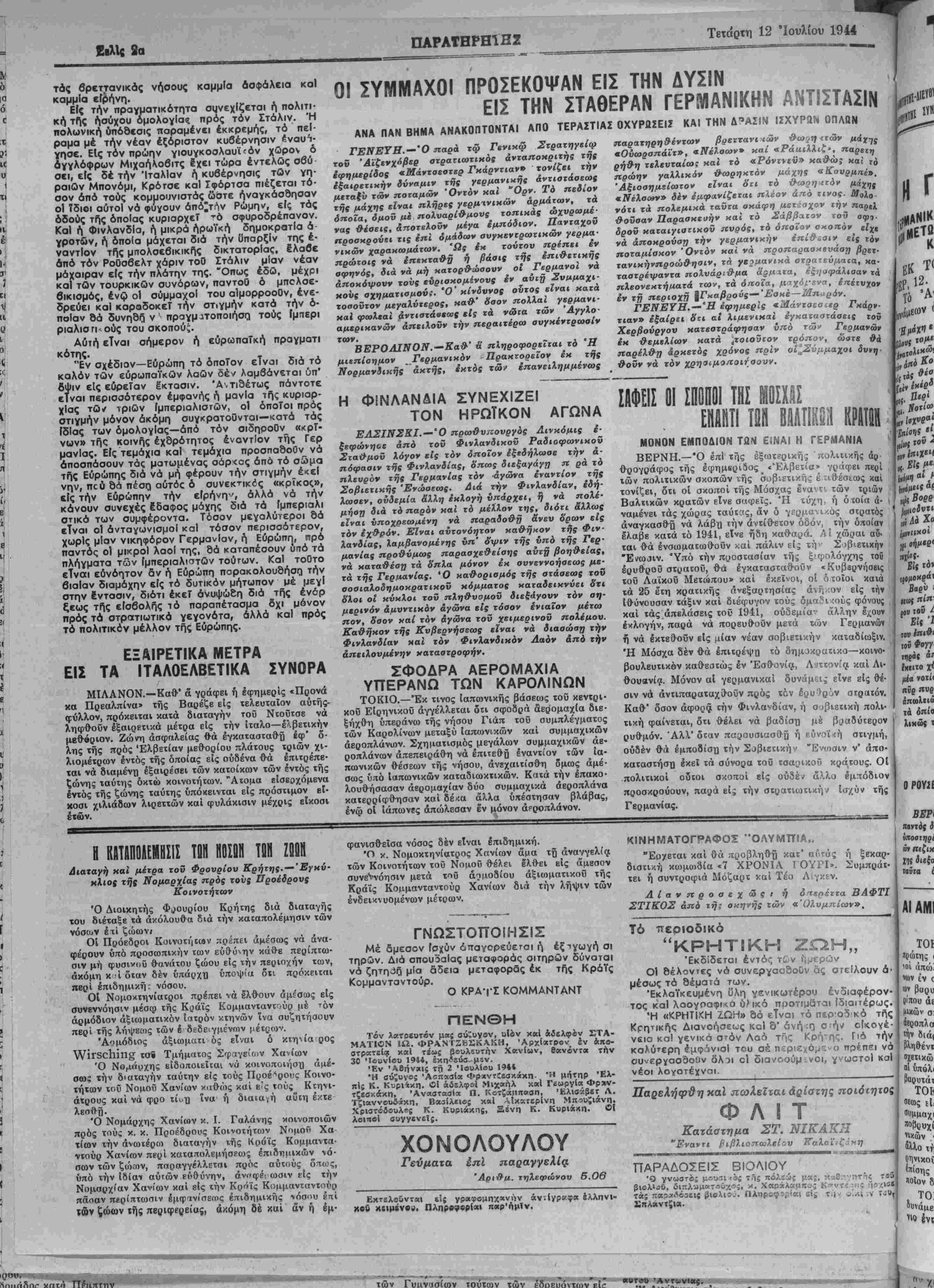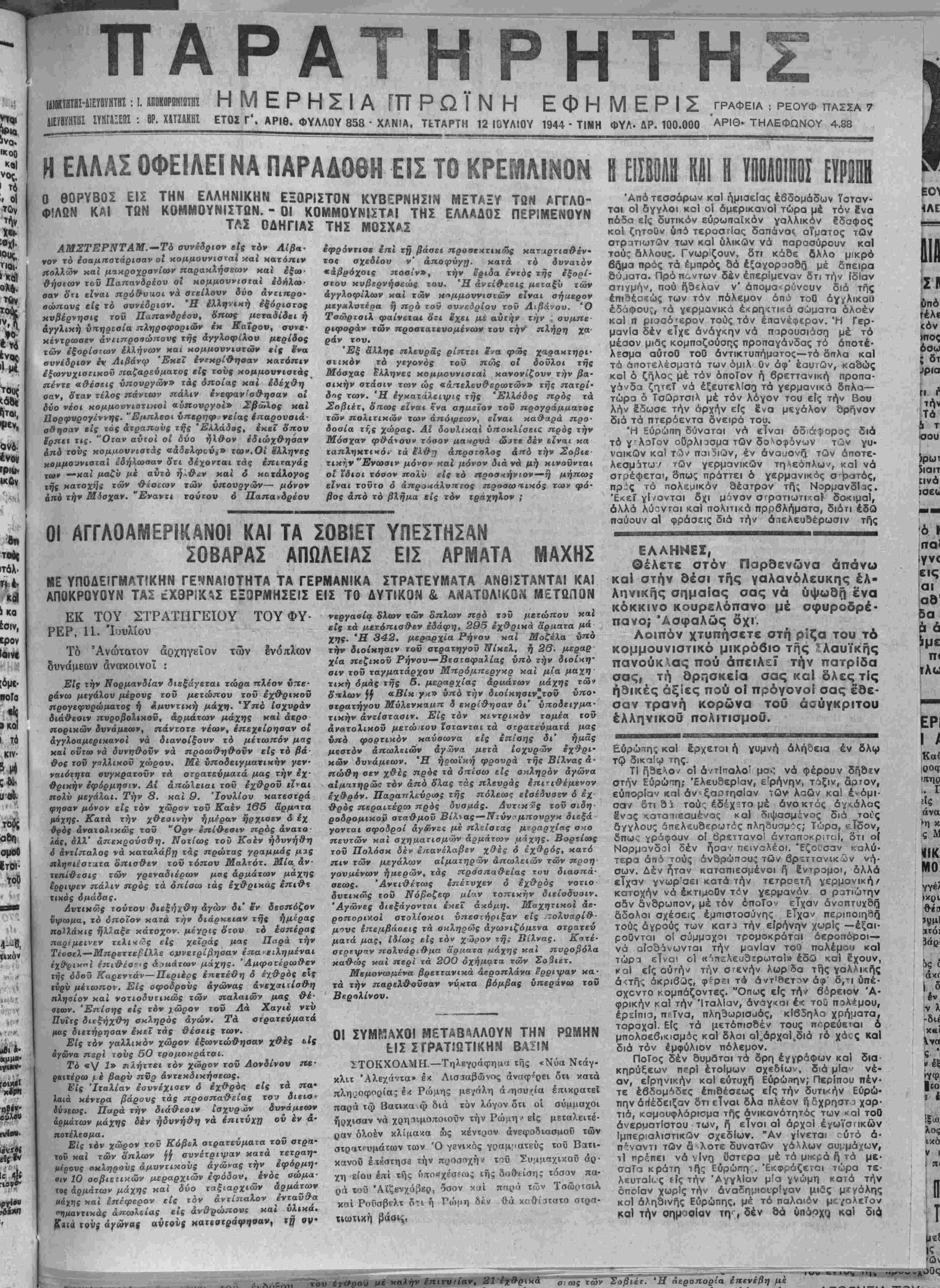 ΧΑΤΖΑΚΗΣ ΕΤΟΙ Γ'. ΑΡΙΘ. ΦΥΛΛΟΥ 858 - ΧΑΝΙΑ, ΤΕΤΑΡΤΗ 12 ΙΟΥΛΙΟΥ 1944 - ΤΙΜΗ ΦΥΛ· ΔΡ. 100.000 ΑΡΙΘ· ΤΗΛΕΦΩΝΟΥ 4.88