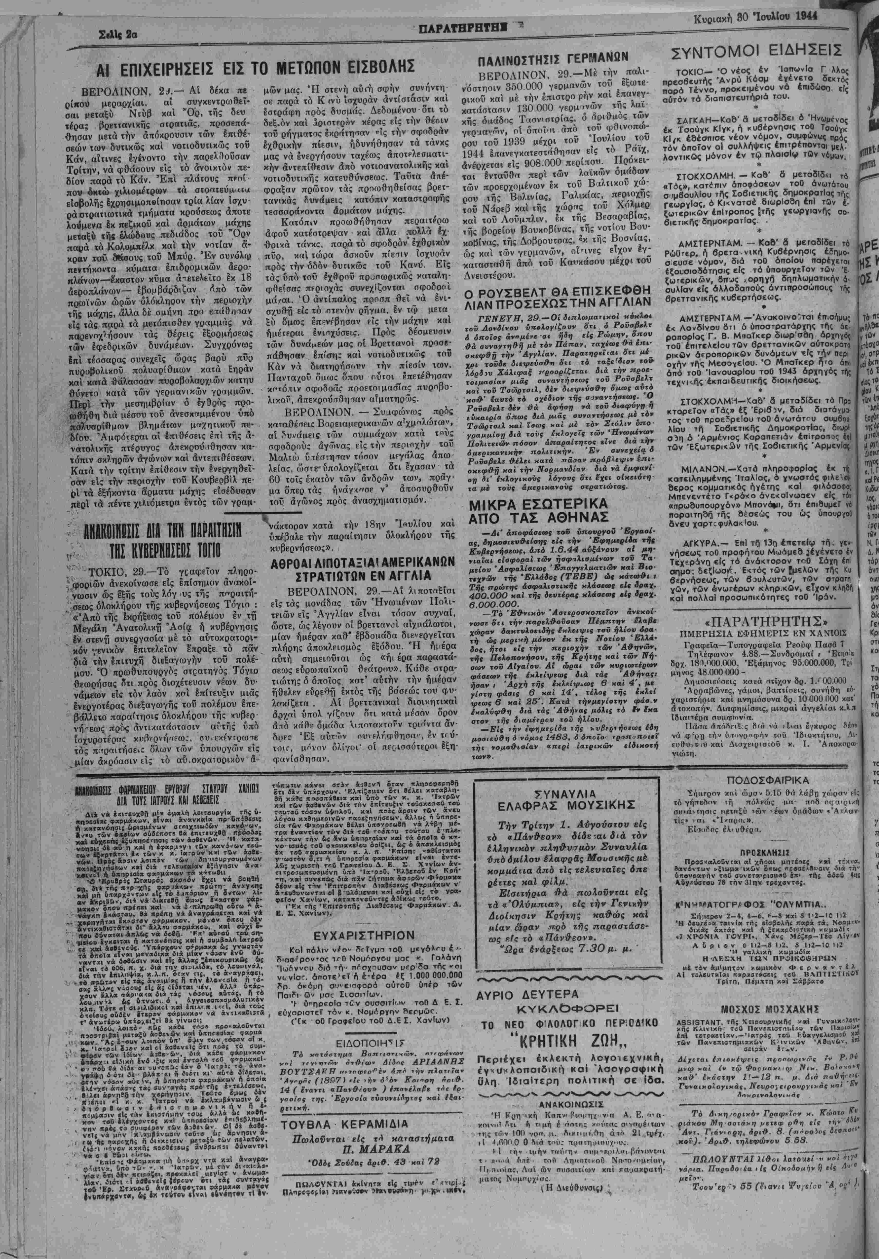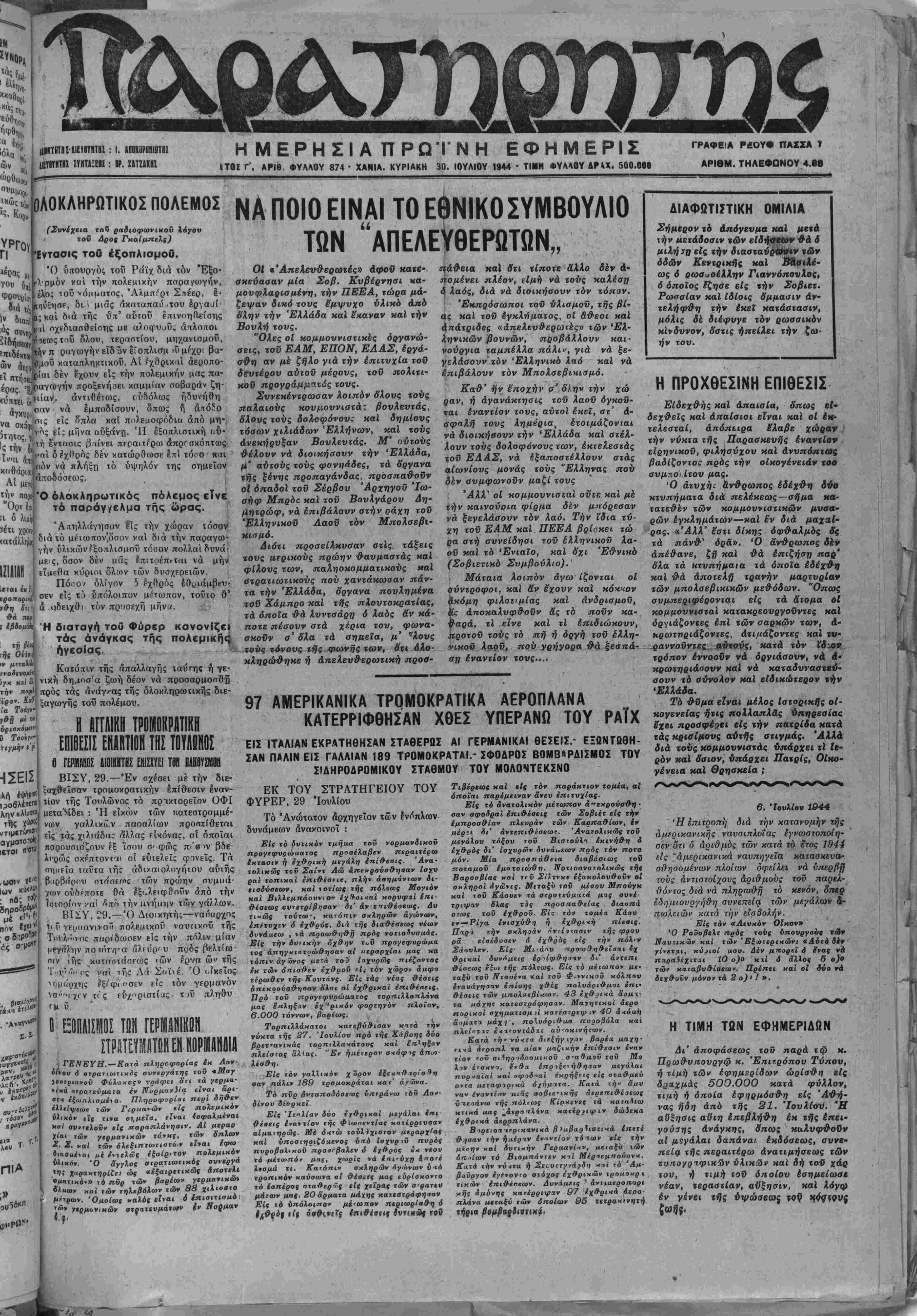 Ι ΤΟΣ Γ'. ΑΡΙΘ. ΦΥΛΛΟΥ 874 · ΧΑΝΙΑ. ΚΥΡΙΑΚΗ 30. ΙΟΥΛΙΟΥ 1944 - ΤΙΜΗ ΦΥΛ4ΟΥ ΔΡ