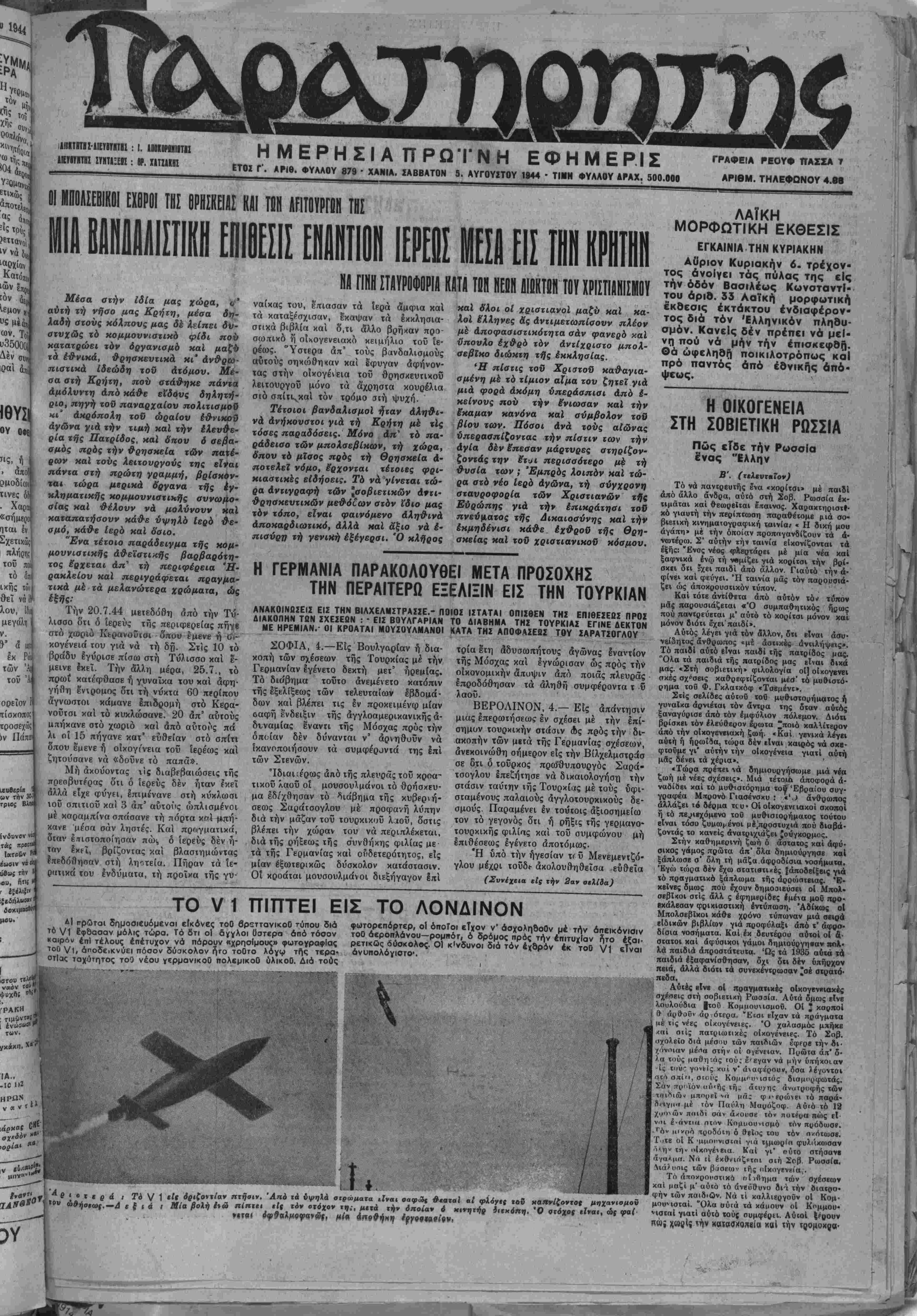 ΕΤΟΣ Ι". ΑΡΙΘ. ΦΥΛΛΟΥ 879 · ΧΑΝΙΑ. ΣΑΒΒΑΤΟΝ 5. ΑΥΓΟΥΪΤΟΥ 1β44 · ΤΙΜΗ ΦΥΛΛΟΥ ΑΡΑΧ. 500.000