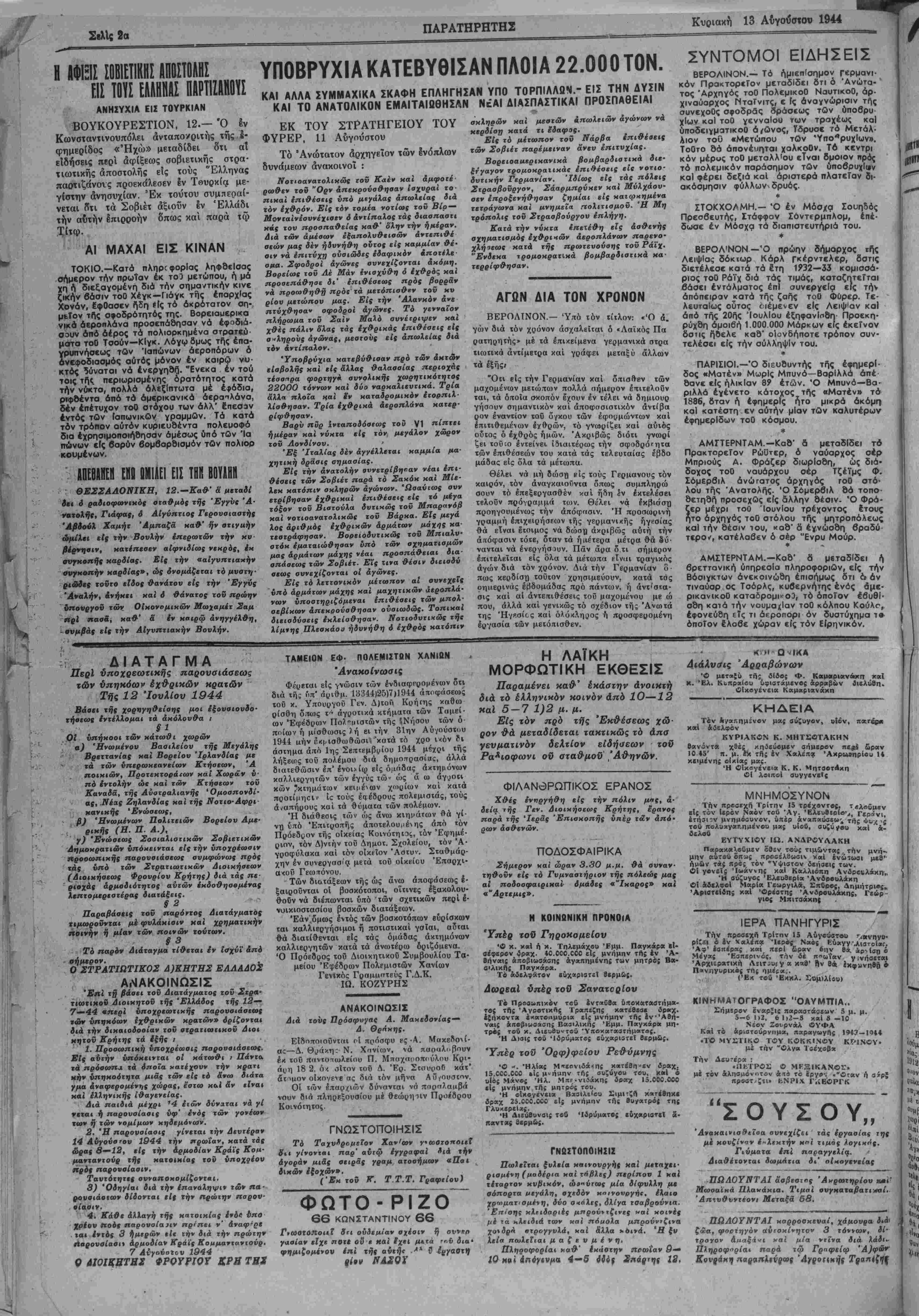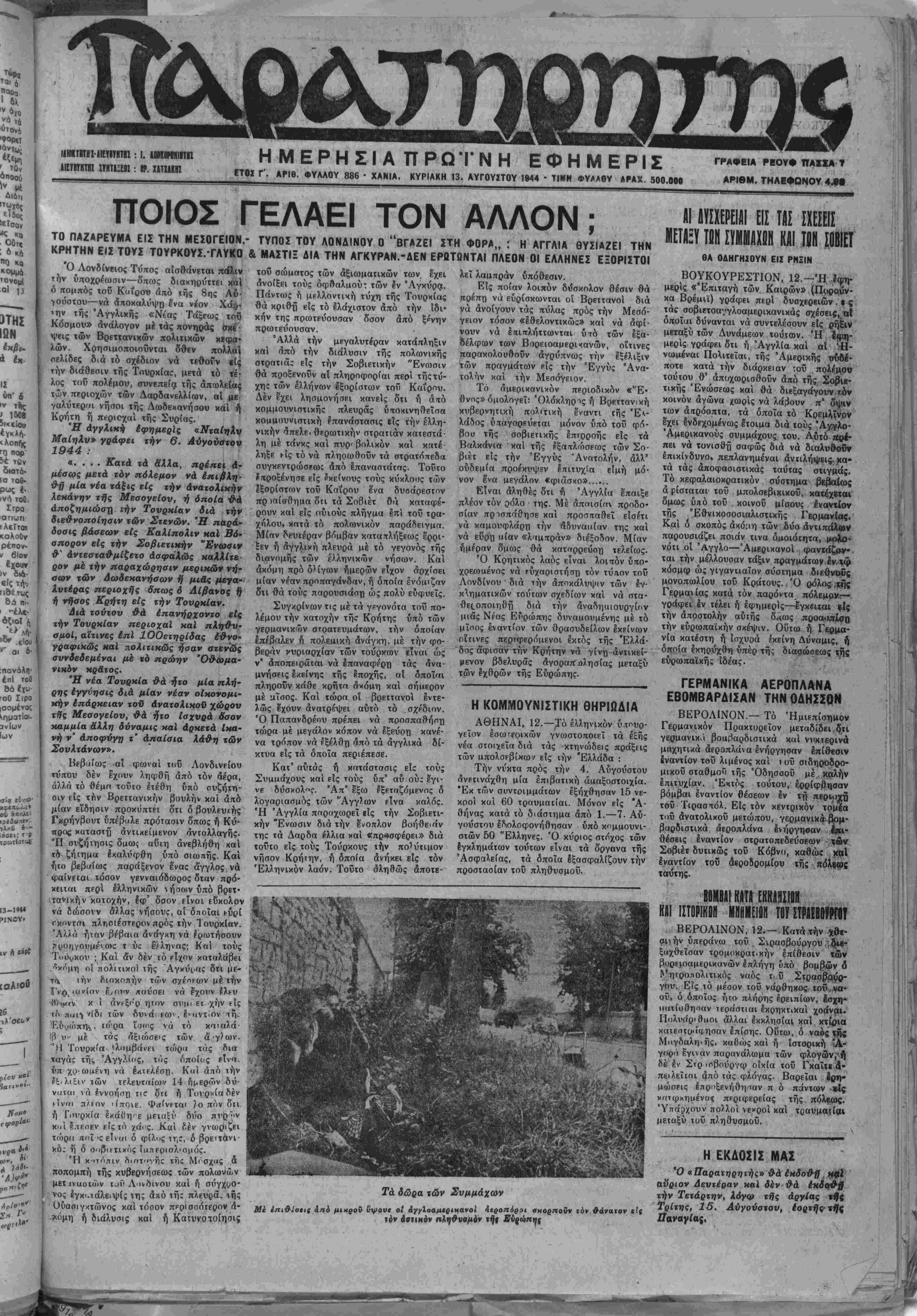 ΕΤΟΙ Γ'. ΑΡΙΘ. ΦΥΛΛΟΥ 886 · ΧΑΝΙΑ. ΚΥΡΙΑΚΗ 13. ΑΥΓΟΥΣΤΟΥ 1944 · ΤΙΜΗ ΦΥ/ΆΟΥ Α·ΑΧ- 500.000