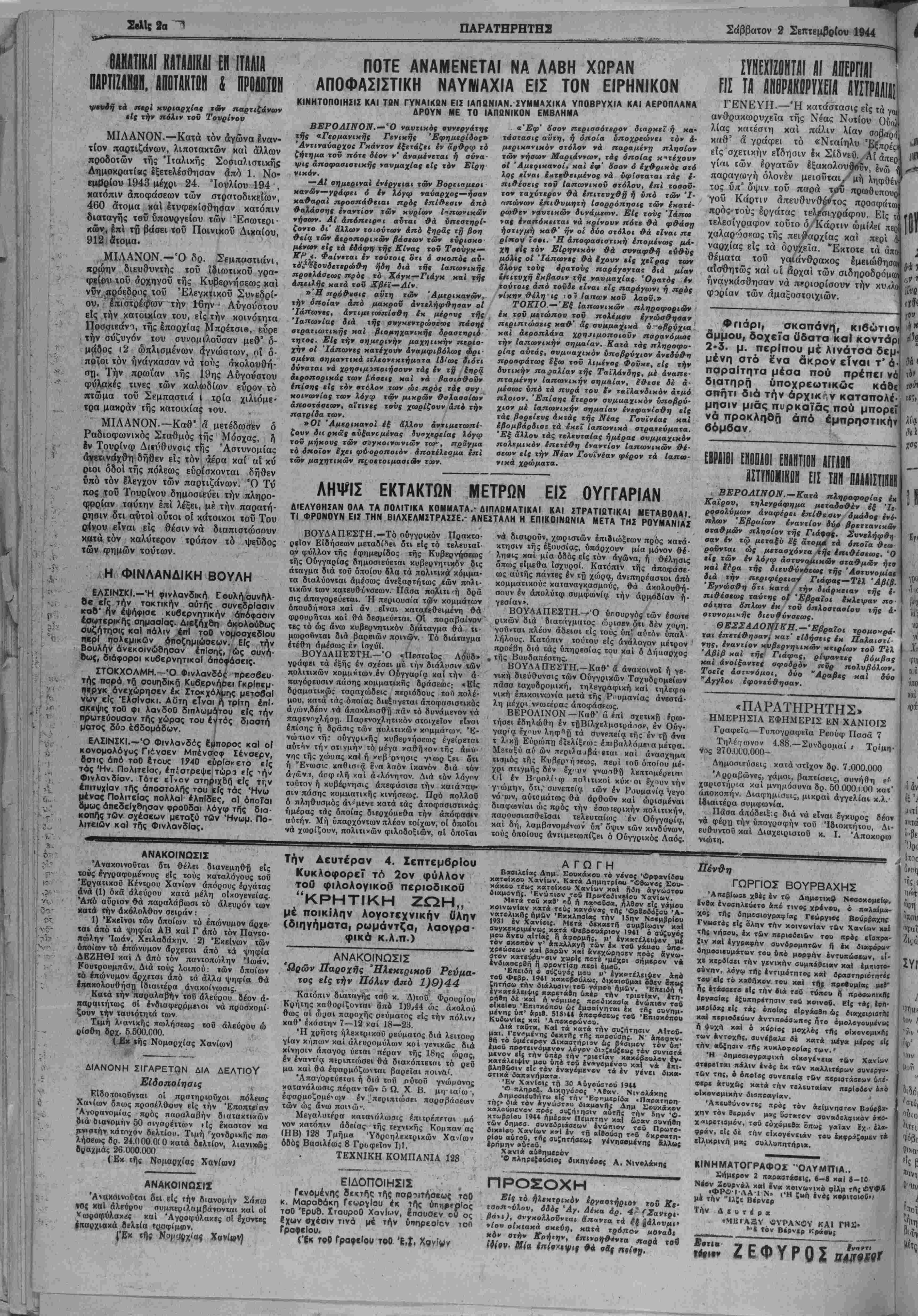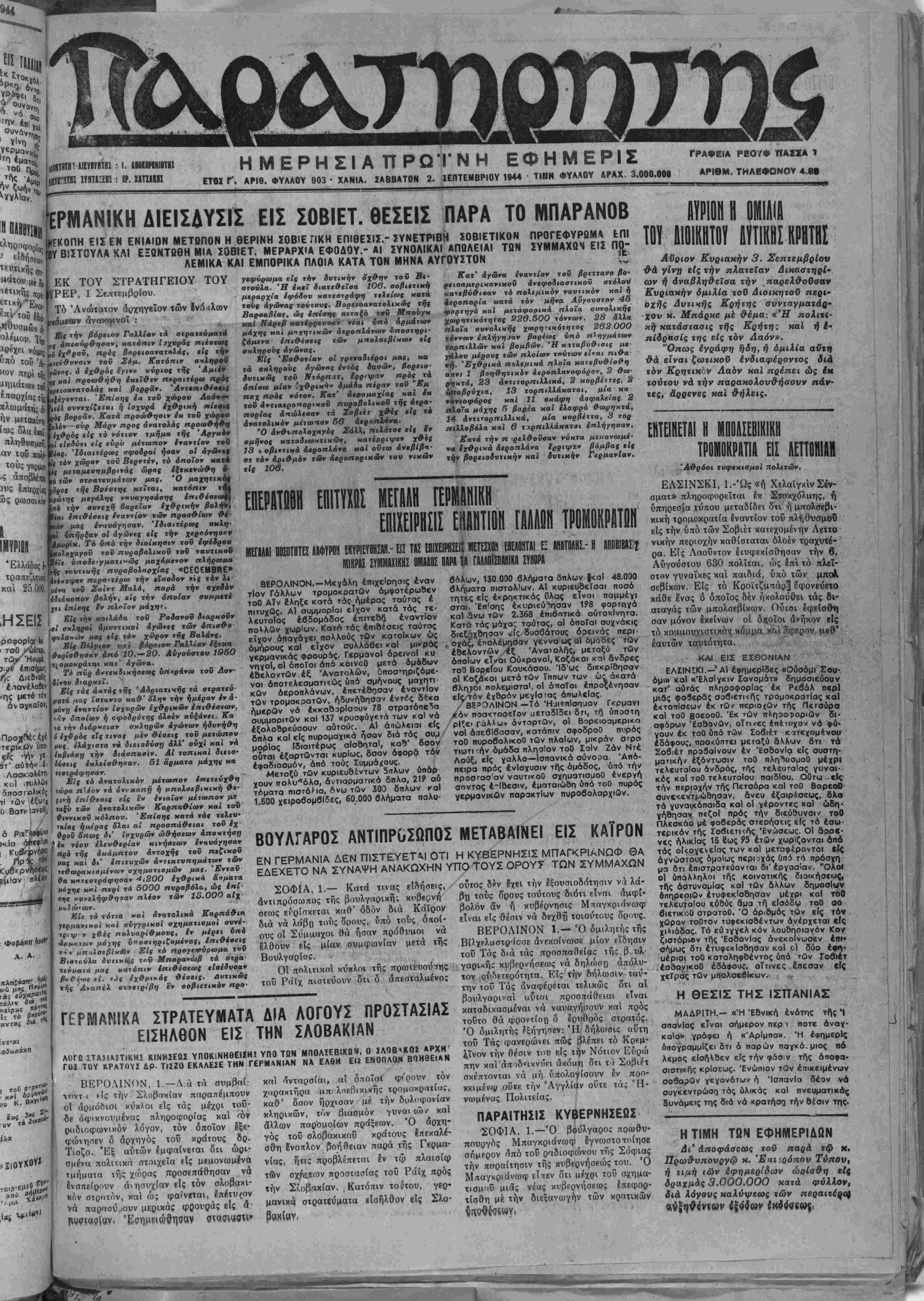 ΕΤΟΣ ΐ. ΑΡΙΘ. ΦΥΛΛΟΥ 903 · ΧΑΝΙΑ. ΣΑΒΒΑΤΟΝ 2. ΣΕΠΤΕΜΒΡΙΟΥ 1944 - ΤΙΗΗ ΦΥΛΑΟΥ ΔΡΑΧ. 3.000.000
