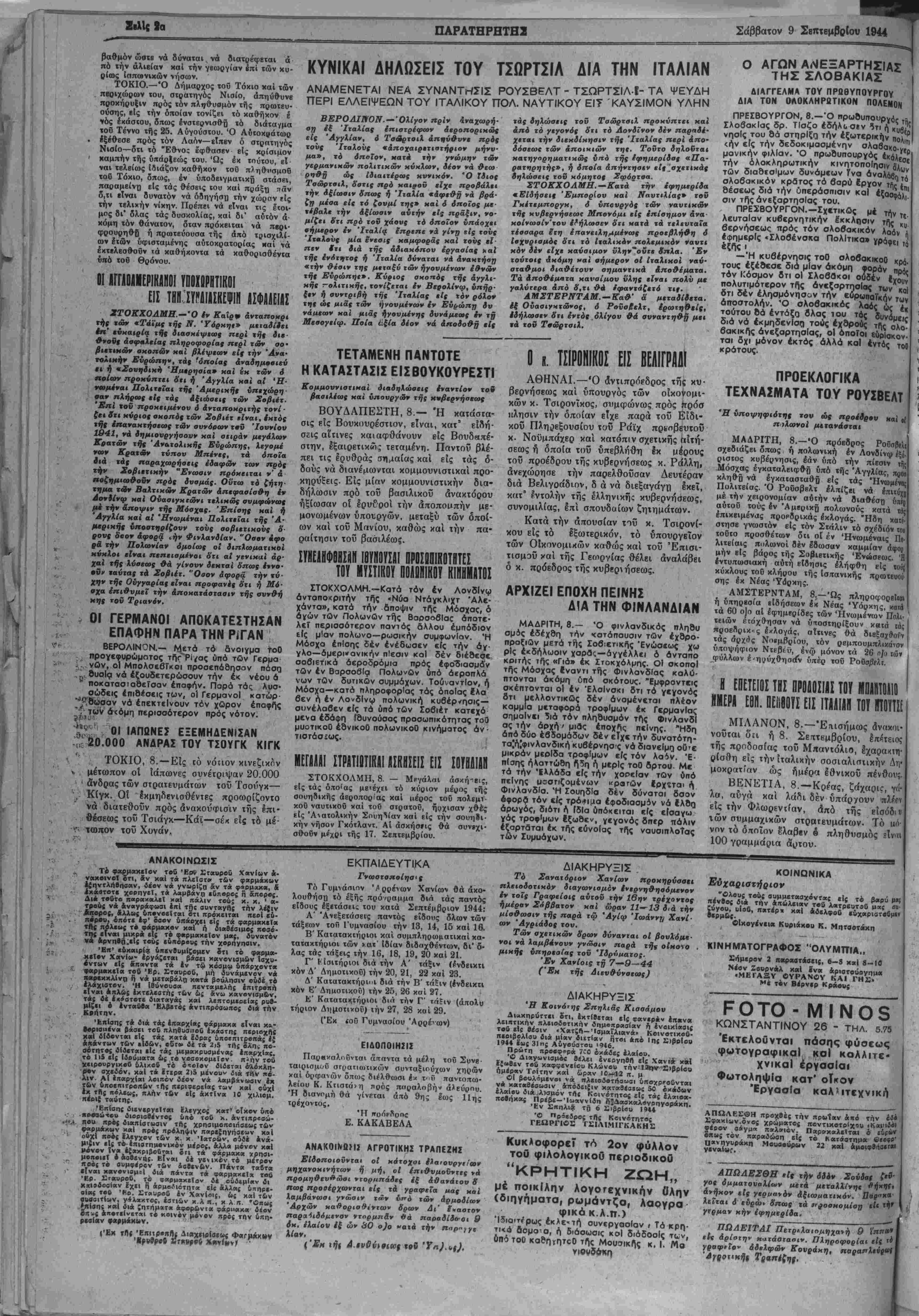 ι<&^τηοπτϊκ ΠΠΜΤΒΤΒΙ-λΐΕΥΕΤΗΤΗΙ: Ι. ΙΝΙετΙΗΙΤΙΙ ιβτιτιτη ιηιιΐίχι ·. ν. ητιιιιι ΗΜΕΡΗΣΙΑ ΠΡΩΤΝΗ ΕΦΗΜΕΡΙΣ Γ'. ΑΝΘ. ΦΥΑΛΟΥ 909 ΧΑΝΙΑ. ΣΑΒΒΑΤΟΝ 9. ΙΕΠΤΕΜΒΡΙΟΥ 1944 - ΤΙβΗ ΦΥΑΑαΥ ΔΡΑΧ. 3.ΟΟΟ.ΟΝ Ι ΡΑΦΕΙΑ ΡΒΟΥΦ ΠΑΧ ΧΑ Τ. ΑΡΙβΜ. ΤΗΛΕΦΟΝΟΥ 4.8· καΐ θλΐΤικούζ <{, II ΤΗ ΑΙΙΑΤΟΑΙΚΗΣ ΠΡΟΪΙΛΣ Όλοι είς την έβγασΐαν τόν Ιοβ,έτ ^ωΧ«Ρρν τίκ είς ΒερολΤνοϊ β,ή όποΐα 6πό >Ο τότε άουΐη