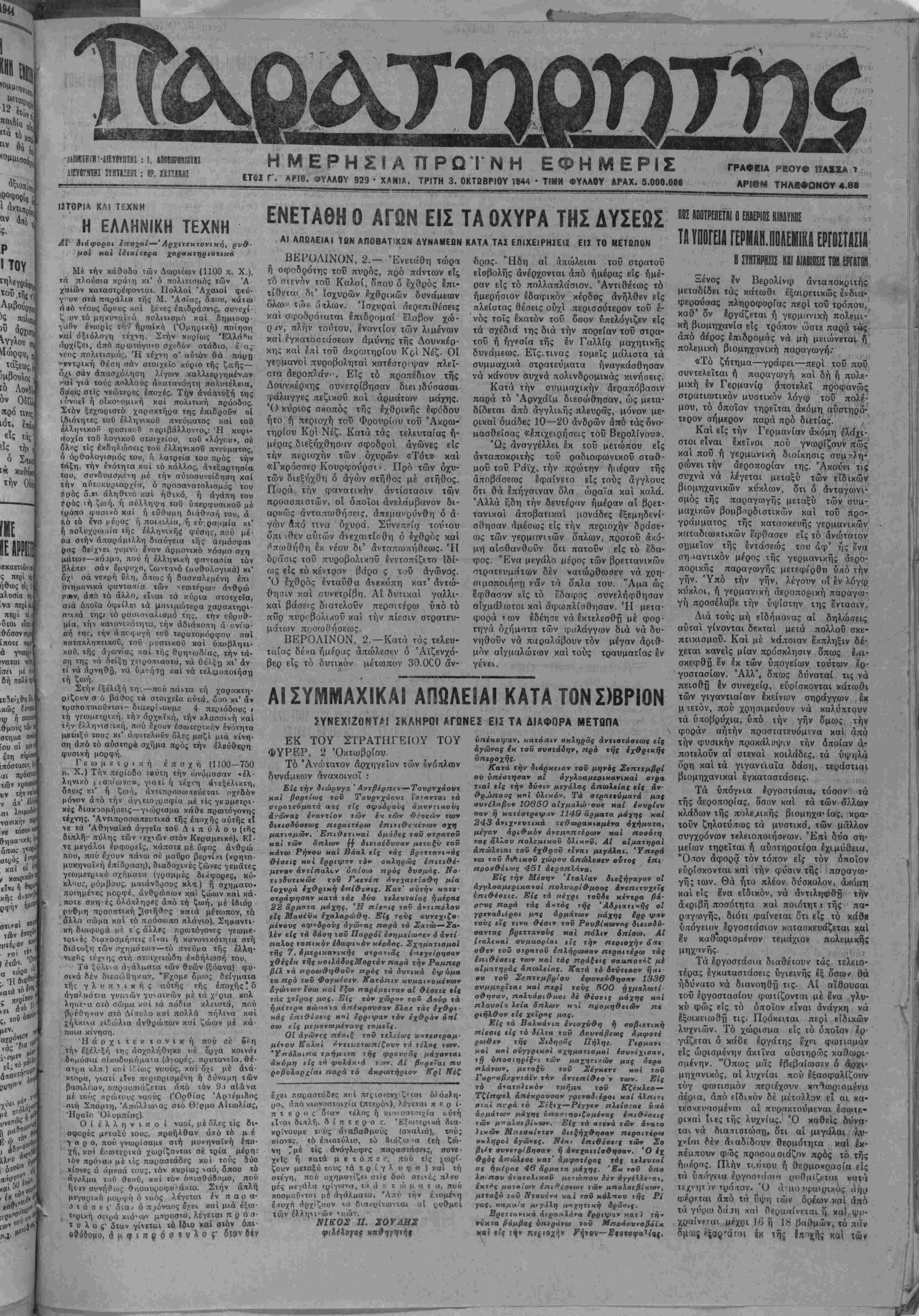 μί»< : ι. ΛΙΕΥ0Τ5ΤΗΙ ΪΤΗΙΙΞΕΕί : β?. ηΤϋΗΙΖ Η ΜΕΡΗΣΙΑ ΠΡΩΤΝΗ ΕΦΗΜΕΡΙΣ ΕΤΟΣ Γ'. ΑΠΘ. ΦΥΛΛΟΥ 929 ■ ΧΑΝΙΑ. ΤΡΙΤΗ 3. ΟΚΤΩΒΡΙΟΥ 1944 · ΤΙΗΝ ΦΥΛΛΟΥ &ΡΑΧ. 5.000.001 ΓΡΑΦΕΙΑ ΡΒΟΥΦ ΠΑΣΣΑ τ ΑΡΙβΜ ΤΗΛΕΦΟΝΟΥ 4.8· ΙΙΤΟΡΙΑ ΚΛΙ ΤΕΧΝΗ Η ΕΛΛΗΝΙΚΗ ΤΕΧΝΗ Αί διάφοραι ίποχαί-~Άρχιτεχτονιχή, ρν&- μοί καϊ ιδιαιτέρα χαραχζηριατικα Μέ την κάθ-οδο των Δωριέων (1100 π. Χ ), τή πλοΰσια χοάτη κι' ό πολιτισμός των 'Α χηιών κιιταστρέφονται. Πολλοί Άχαιοί φεύ- γ υν στά πηράλια τής Μ. Άσίας, δπου, κάΐω άιΐό νρους όρους κπί ξενες επιδράοεις, συνεχί ζ υν τό μη/<υνο,ϊ>·ό πολιτιαμη καί δημιουρ¬