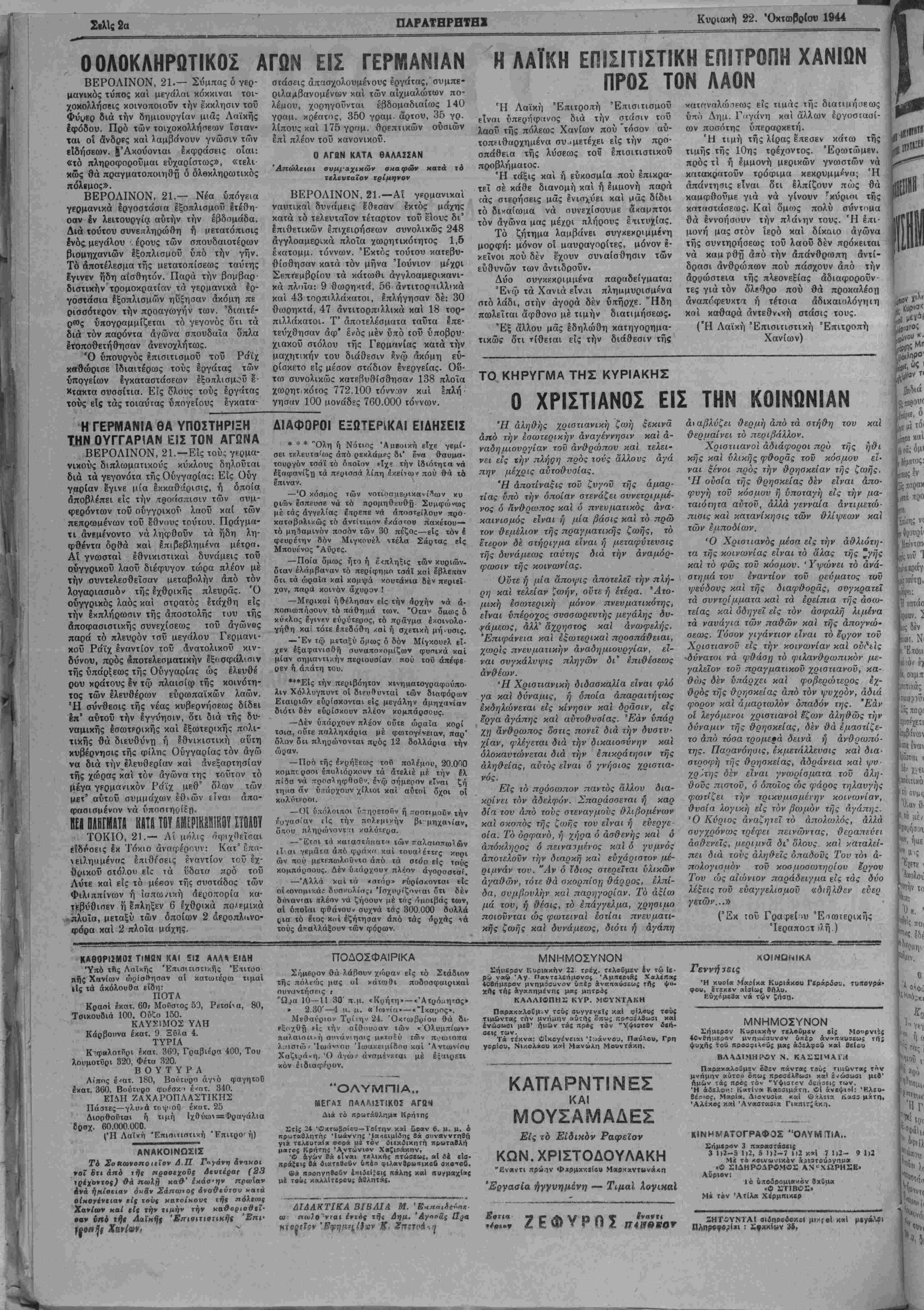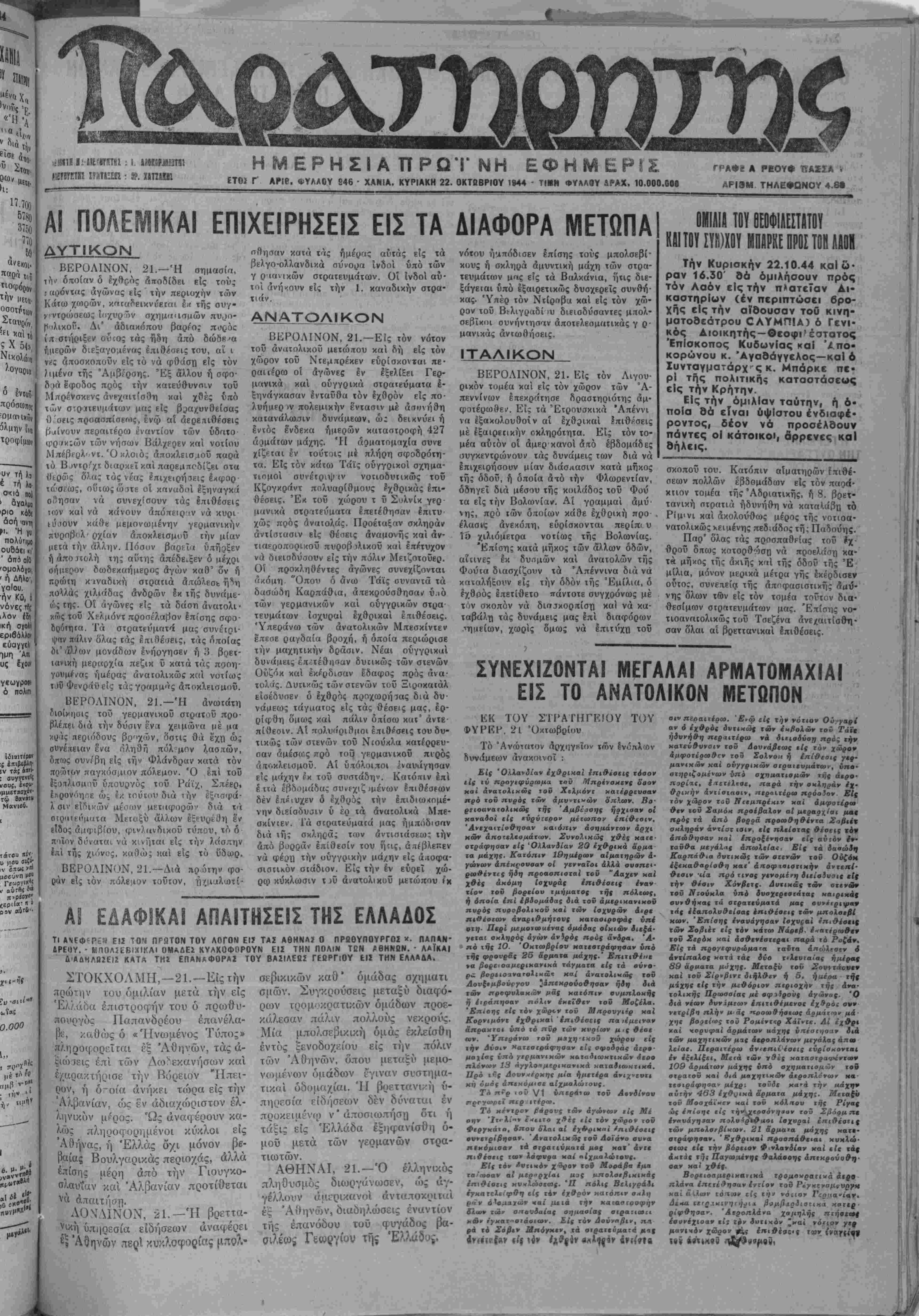 ΕΤΟΪ Γ ΑΡΙβ. ΦΥΛΛΟΥ 846 · ΧΑΝΙΑ. ΚΥΡΙΑΚΗ 22. ΟΚΤΟΒΡΙΟΥ 1944 - ΤΙΗΗ ΦΥΑΑΟΥ ΔΡΑΧ. 10.000.00·