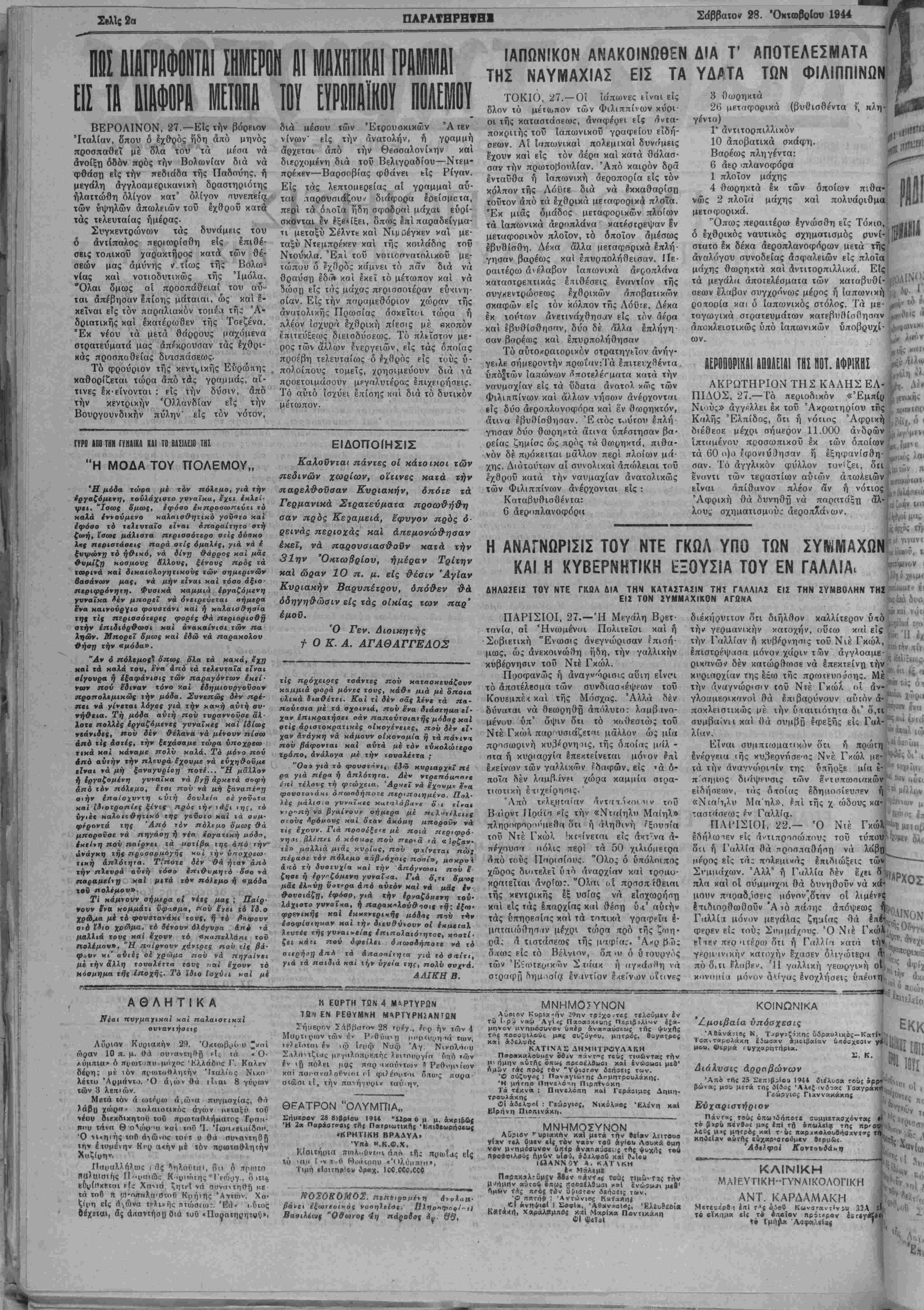 άιια εβυθίσθηααν. Έ <τός τούτου έπλή γησαν δύο θωρηχτά άτινα ύπέστησαν βα· ρείας ζημίας ώς πρός τα θαιρηκτά, πιθα¬ νόν δέ πρόκειται μάλλον περί πλοίων μά· χης. Διάτουτίον αί συνολικαι απώλειαι τού Ιχθρού κατά την ναυμαχίαν ανατολικώς των Φιλιππίνων άνέρχονιαι είς : Καταΐσυθισΰέντα: Ο άεροπλανοφόρκ (βυθισθέντα ί', «λη 3 θωρηκτά 20 μρταφορικά γέντα) 1* άντιτορπιλλικόν 10 άποβατικά σκάφη. Βαρέως πληγέντα: 6 άε,ρ ιπλανοφόρα 1 πλοΐον μάχης 4 θωρηκτά εκ των οποίων πιθα νώς 2 πλοΐα μάχης καί πολυάριθμα| μετοφορικά. ] Όπως περαιτέρω εγνώσθη εις Τόχιο, δ έχθρικός ναυτικός σχηματισμός ρυνί-| στατο έκ δέκα άεροπλανοφόρων μετά τής άναλόγου συνοδείας άσφαλειών είς πλοΐα μάχης θωρηκτά καί άντιτορπιλλικά. Είς τα μεγάλα άποτελέσμαΐα των καταβυθί- σεων έλαβον συγχρόνως μέρος ή ίαπωνική ροποοία και ό ϊαπωνικός στόλος. Τα με- ταγωγικά στρατευμάτων κατεβυθίσθησαν αποκλειστικώς υπό ϊαπωνικών ύ/τοβρυχί- ών. ΑΕΡ0Ι10Ρ1ΚΑΙ απαΑΕΙΑΙ ΤΗΣ (10ι. ΑΦΡ1ΚΒΙ 10 """ ΑΚΡΩΤΗΡΙΟΝ ΤΗΣ ΚΑΛΗΣ ΕΛ- η Δέ» ΠΙΔΟΣ, 27.— Γό περιοδικόν «Έμπίρ ίνιχής Νιούς» αγγέλλει έκ τού Άκρωτηρίου τϋς Καλής Έλπίδος, ότι ή νόΐιος Άφρική διέθεσε μέχρι σήιιερον 11.000 άδρων ιπταμένου πςοσωπικοΰ έκ των οποίων τα 00 ο)ο ?φονεύί)ησοιν ή έξηφανίσθη- σαν. Το αγγλικόν φύλλον τονΐζει, ότι έναντι των τεραστίων αυτών άτωλειών είναι απίθανον πλέον άν ή νότιος Άφρική θά δυνηθή νά παρ«τάξη άλ-; λους σχηματισμούς άΧά κχϊο(ι α/, ό ' ι< ο Η ΑΝΑΓΝΩΡΙΣΗ ΤΟΥ ΝΤΕ ΓΚΩΛ ΥΠΟ ΤΩΝ ΣΥΐνίΜΑΧΩΝ ΚΑΙ Η ΚΥΒΕΡΝΗΤΙΚΗ -ΞΟΥΣίΑ ΤΟΥ ΕΝ ΓΑΛΛΙΑ. ΔΗΛΩΣΕΙΣ ΤΟΥ ΝΤΕ ΓΚΟΛ ΔΙΑ ΤΗΝ ΚΑΤΑΣΤΑΣΙΝ ΤΗ! ΓΑΛΛΙΑ! ΕΙΣ ΤΟΝ ΣΥΜΜΑΧΙΚΟΝ ΑΓΩΝ Α ΕΙΣ ΤΗΝ ΣΥΜΒΟΛΗΝ ΤΗΣ ΠΑΡΙΣΙΟΙ, 27.—Ή Μεγάλη Βοετ- τανία, αί Ηνωμεναι Πολιτειαι καί ή Σοβιετική Ένωσις άνεγνώρισαν ίπισή- μως, ώς ανεκοινώθη ήδη, την γαλλικήν κυβέρνησιν τοϋ Ντέ Γκώλ. Προφανώς ή άναγυώρισις αΰιη είνο*ι τό άποτέλβσμα των συνδιασ·<έψρων τοϋ Κουεμπέ* καί τής Μόσχας. Άλλα δέν δύναται νά θεωρηθή άπόλυτο: λαμβανο διέκήρυτιον ότι διήλθον καλλίτερον ύιό την γερμανικήν κατοχήν, ούτω καί είς " ■ · την Γαλλίαν ή κυβέρνησις τοΰ Νιέ Γκώλ, , , επιστρέψασα μόνον χάριν των άγγλοαμε- τ '. ι * * ρικανών δέν κατώρθωσε νά έπρκτείνβ την " κυριαρχίαν της εςω της πρωτευούσης. Μέϊ ·'"'."*Α" την άναγνώρισ'ν ςοΰ Ντέ Γκώλ (ιί άν-Ιτ111*01 γλοαμεοικανοί θά έπιβαούνουν αυτόν ά-' *°ι ' „„,..«., ■-___κ-ι-ιι -......-.......τ-,____ ποκλεισιικώς μέ την ύταιτιότητα δι' δ,τι-''ι"^ μένου ύπ' όψιν ότι τό κοθεστώ; τοϋ συμβαίνη και θά συμβή Εφεξής *=ϊς Γαλ*ί?*α *ν|(· Ντέ Γκώλ παρ'υσιάζϊΤΓΐι μάλλον ώς μία λίαν. "»(α<»λ ι<5 πρισωρινή κυβέρνηης, τής οποίας μάλ - σία ή κυριαο-/ία έπεκΐείνεται μόνον ρπ,ί έκείνων των γαλλικών εδαφών, είς 'ά ό- ποΐα δέν λαμβάνρι χώρα καμμιά σιρα- τκϋΐική ε ιιχείρησις. "Λπό τε-λε,υΐαι'αν αντατ ί«οι ιιν τοΰ Βαιρντ ΙΙράίσ ρίς την «Χταίηλυ Μαίηλ» πληοοφορ'>ΰμρθΓ< ότι ή (ΗηίΚνή τξουτία τοϋ Ντέ Γκώλ ^κ^ίνεται εις άκτ'·ν« α¬ πέχουσα ιιόλις πεοί τα 50 χιλιόμετρα πίΐό τούς Παρισίους. Όλος δ υπόλοιπος χώρος διατελεί υπό άναρχίαν καί τροαυ- κραΐεΐται άνρίακ. Όλαι οί πρσσπ ίθειηι τής κϊντρικίϊς έΕ υσίας νά είσχωρήση καί είς τάς επαρχίας καί θέση ύ.ι' αύτην τάς ύπηοεσίας κπί τα τοπικά γοΐϊκΡεΐΐί I- μΓΤταιώθησιΐν μέχρι τώρα πρό τής ζωη- ρας ά τιστάσε(»ς τής μαφίος. Άκρ βώ; όπως είς τό Βέλνιον, όπ »« ό ύτουργος των ΈίίοτερικΤιν Στιίακ ί] αγχασίιη (ά στραφίϊ δηα,ισία εναντίον έ*είνα>ν οϊπνρς