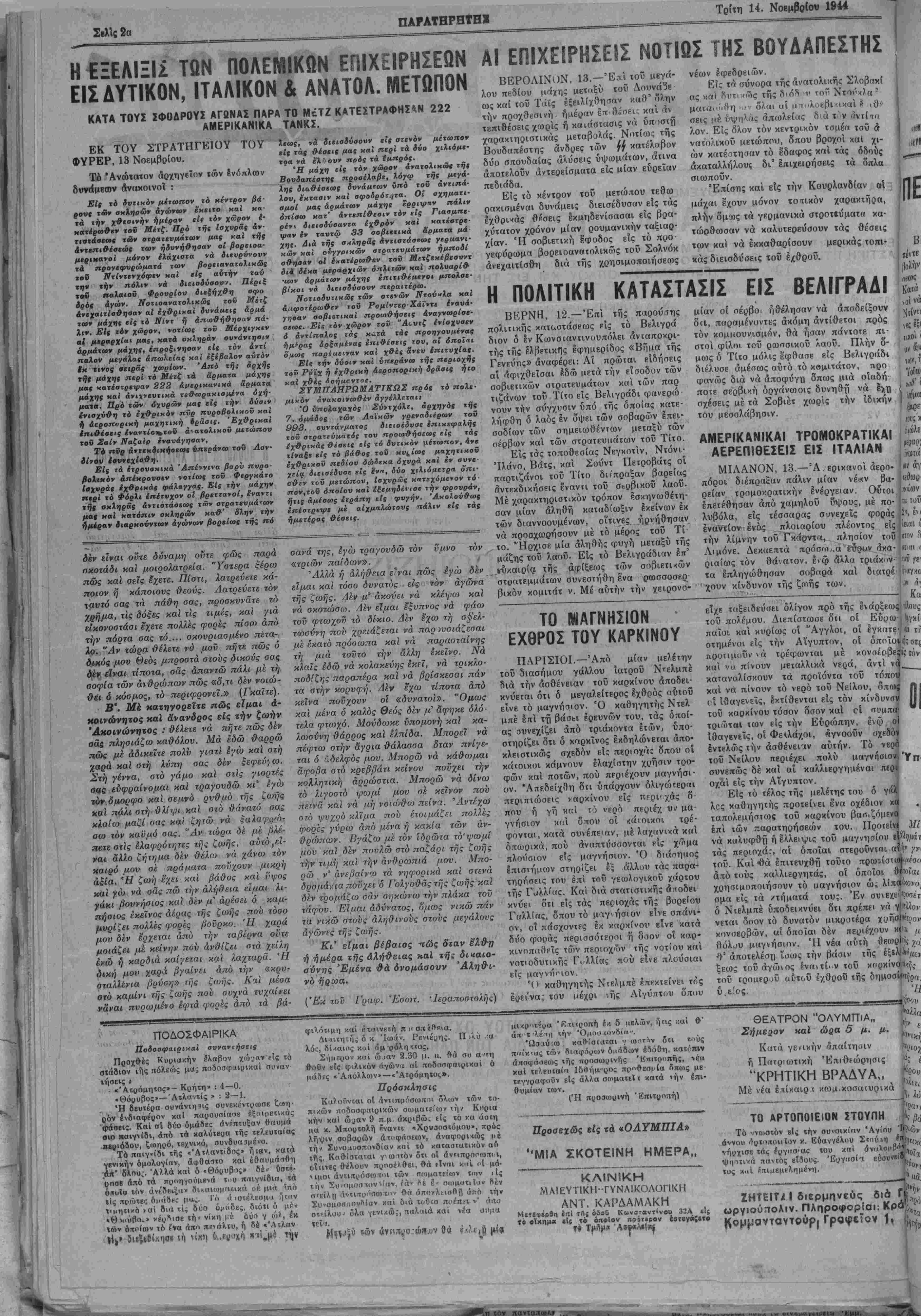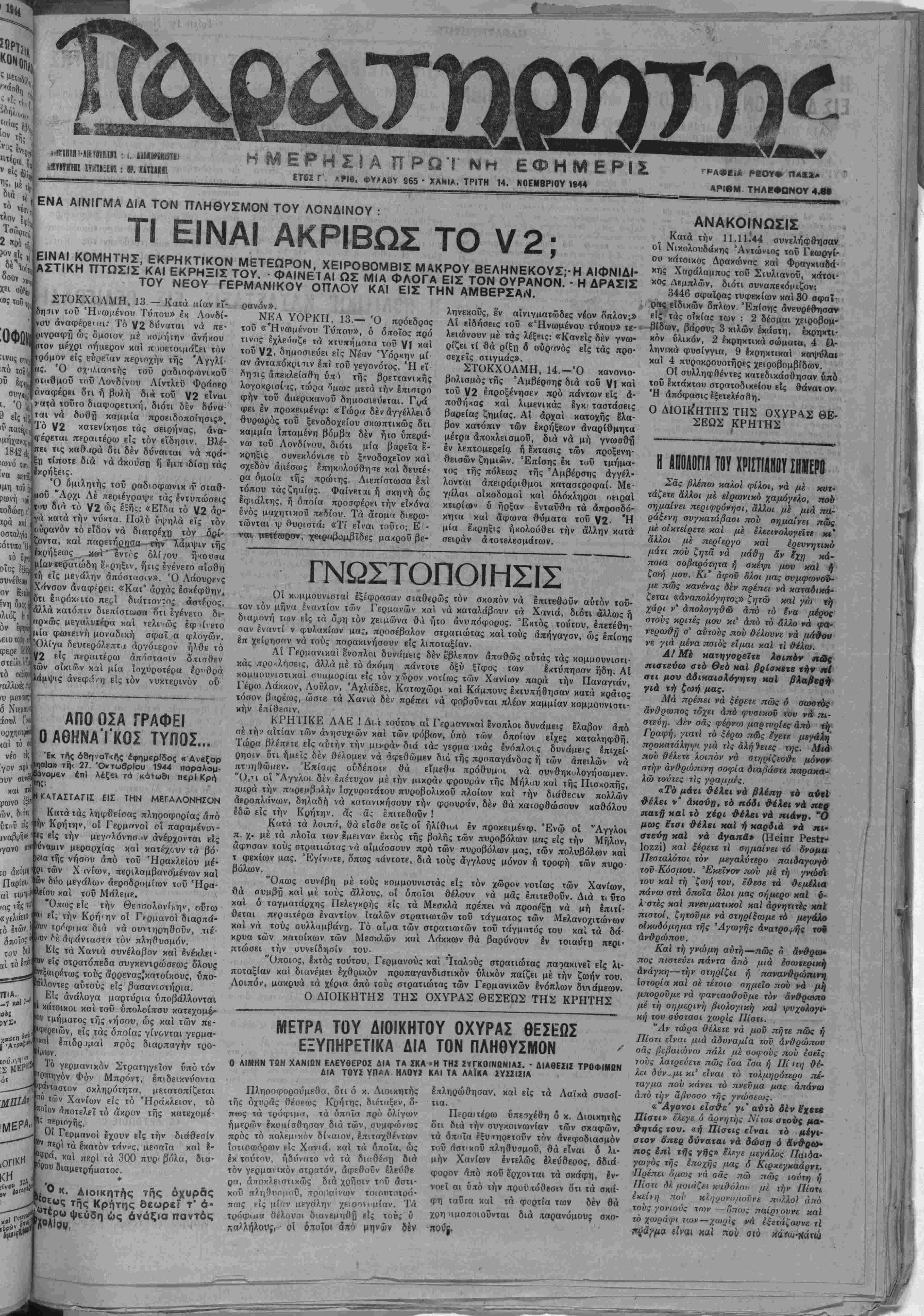ΕΤΟΖ Γ Λ·|β. ΦΥΜ9Υ 965 · ΧΑΝΙΑ. ΤΡΙΤΗ 14. ΝΟΕΜΒΡΙΟΥ 1944