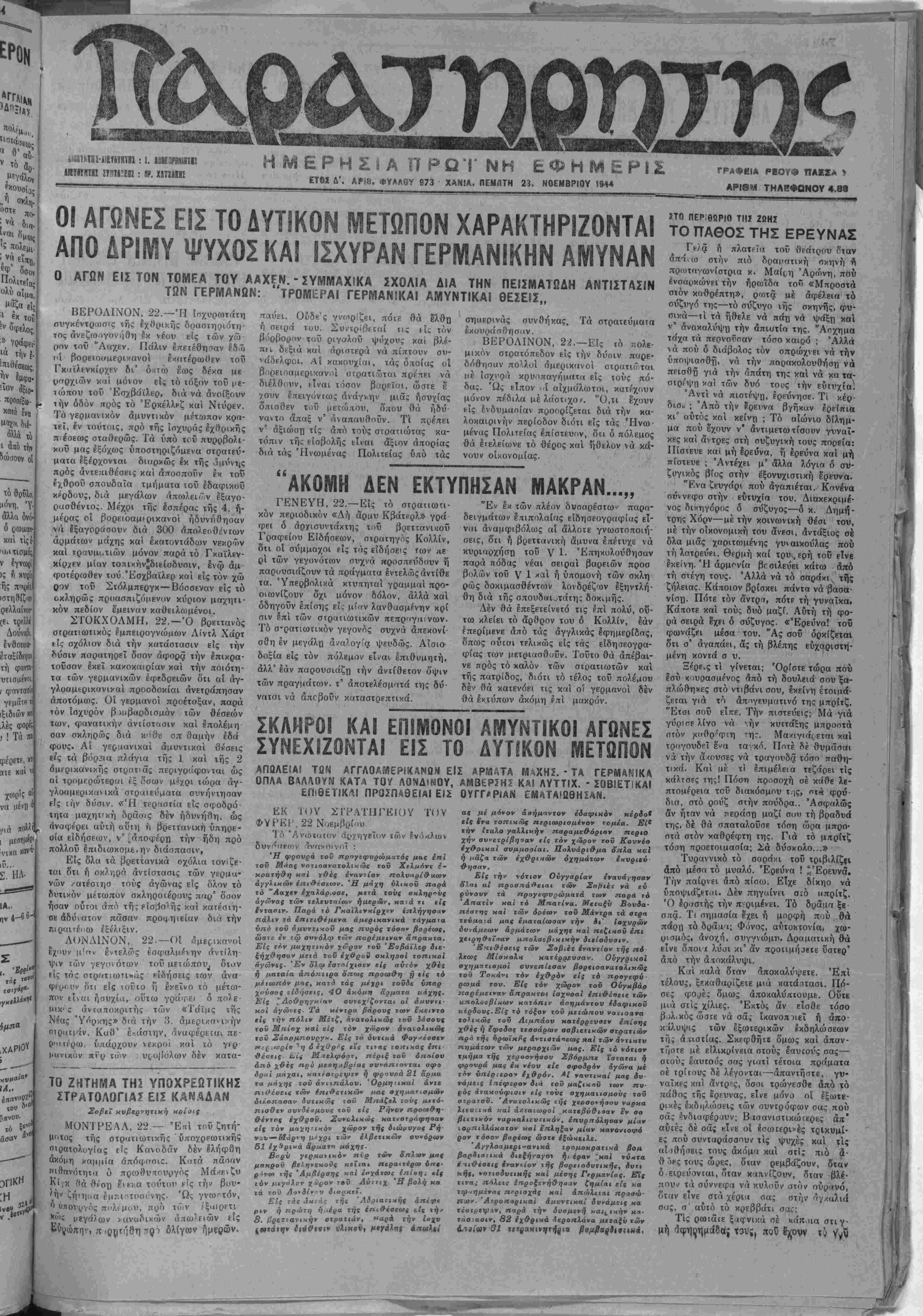 <ίγ«ν»ς. Έν όλω ίατηΐχιοεν είς αυτόν χθέί ή ματαία άπόπιιρα ό'παις προωθη § είς τό μετωπον μας, χαχά τάς μέχρι τούδε ΰπαρ χούαας ίϋί)θεις, 40 άχόιιη αοματα ιιάχης. Είς "Λο&ρηγχ·αν ουνεχ'ζονται οί αμυντι· Ηοί άγωνις. Τα κίντρα βάρονς των εχειντο είς ΐί)ν πόλιν Μέτξ, ανατολικώς ΐοΰ ίάσους τοί Μηίοχ καϊ «ίς ΐόν χΓβοον ανατολικώς τού Σάαρμηουργκ. Είς τα δυτιχά Φογ*έοσεν αΊζ.κρϊν "'η όεχΊρ^ς εΐί τιι«ς ιο^Γιχος έκι θέοεις 1ϋ» Μ τελφόοτ, πέριξ τοϋ όηοίου άϊΐό χθές προ μ«οη^/9β'α( συνηπΐο»ταΐ σφο <5ρ"ϊ μ»χαι, *αζ(θτνεψι* ή φρονβά 21 αρμα τα μάϊης τοϋ αντίπαλον. Όρμηϋκαί άνιε πιϋέοεις των ίιιιΆετιΗ&ν μας οχηιιαπσμαν ίιίαπθίοαν θ«ΐικ<»ϊ τοϋ ΜηάζεΧ ζονς μ«ΐό· πισϋεν αννδϊομονς τοϋ είς Ρηνοτ ηροαι&ΐ)- θέντπς έχθροΰ. ΣυνοΙΐΜιϊς Ηατ^οτράφηοαν είς τόν μαχηηχόν χώρον τής διώμνγος Ρή- νόν — δίάριη μ'Χ?ι τω» εΐβετιχών ουνόραιν 51 έχ'βΐκά όίρματη μάχη!- Βνρν γερααιιχύ* πιρ τα>ν ό'πλοίν μ««