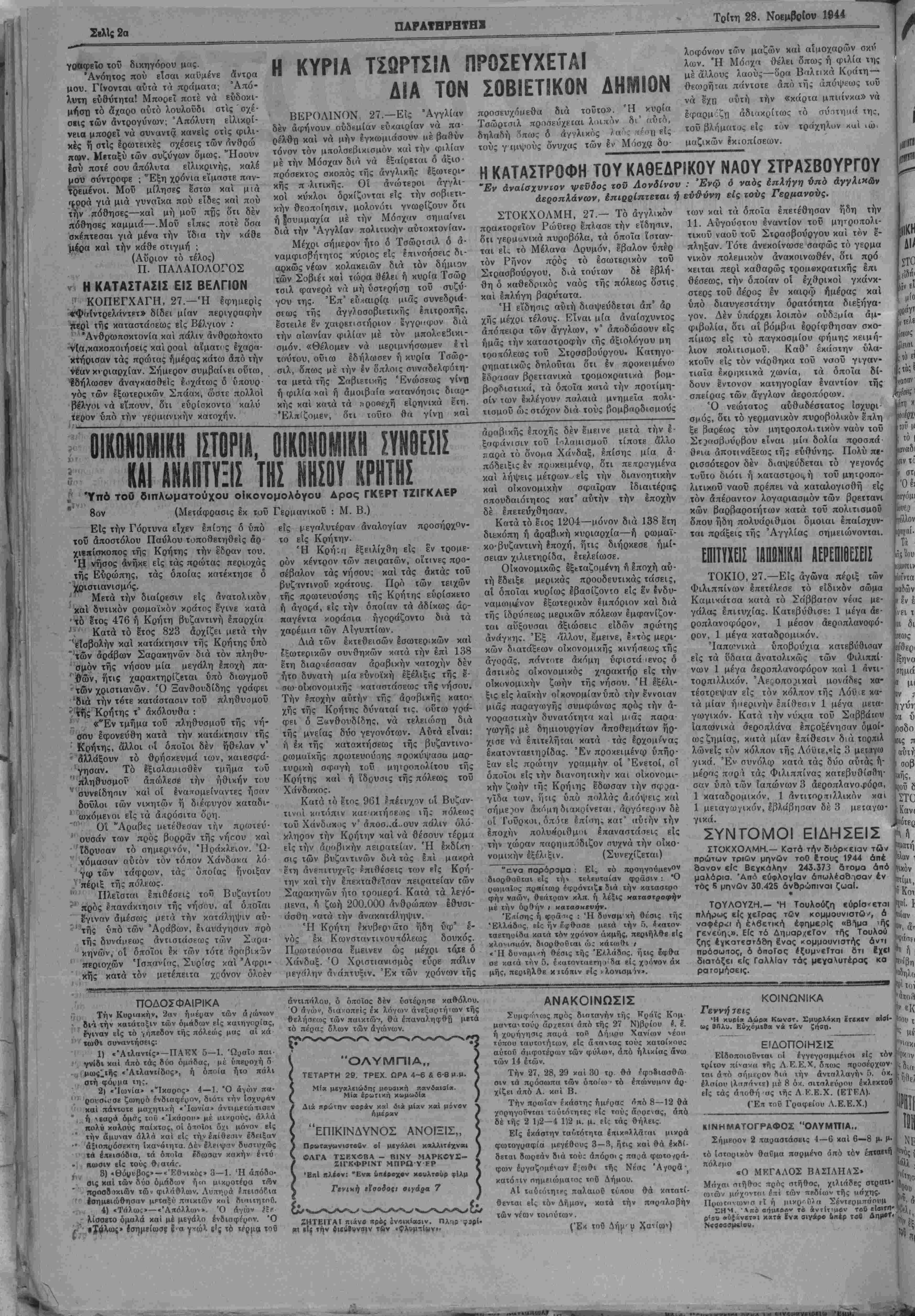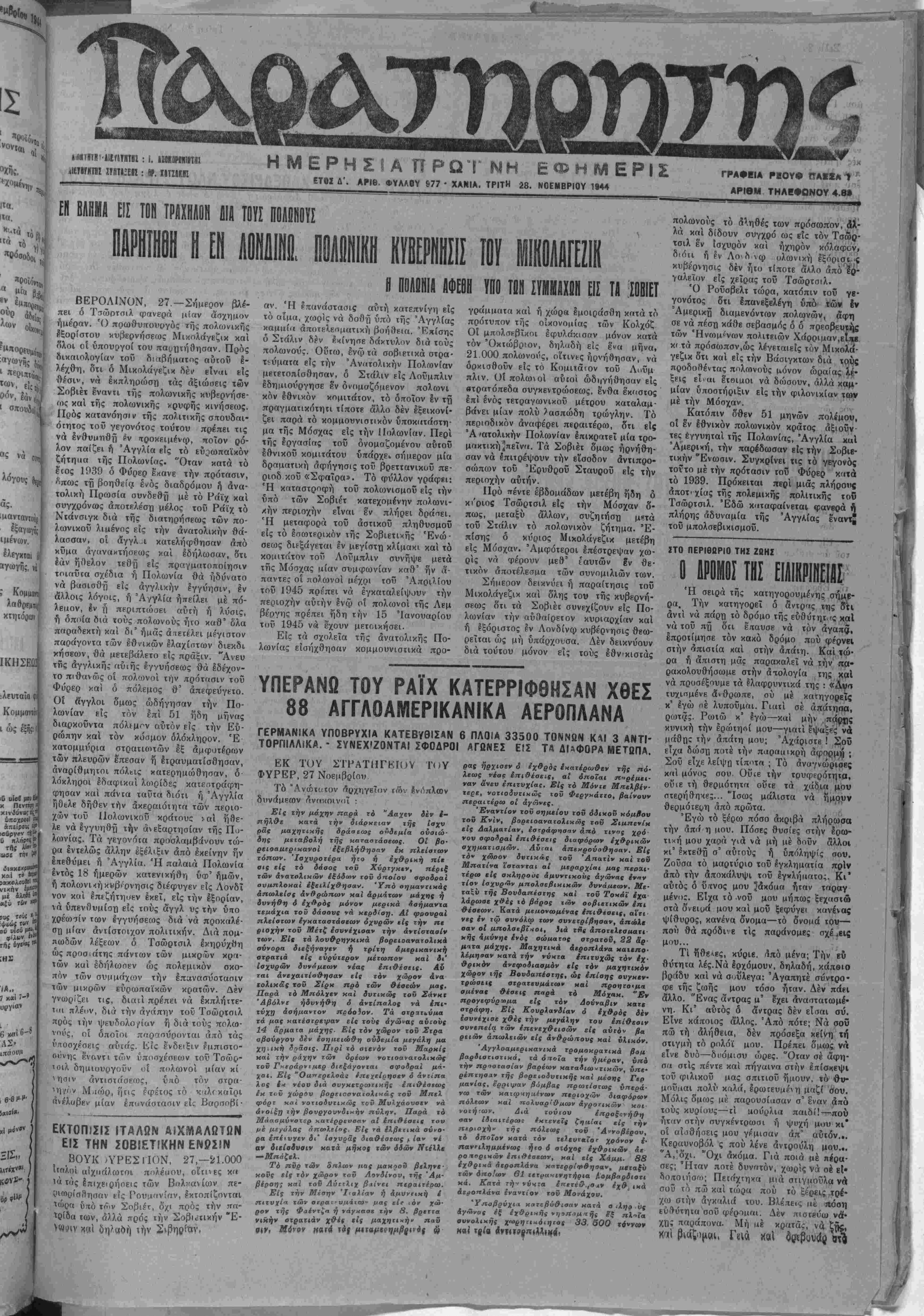 ΕΤΟΖ Δ'. ΑΡΙΘ. ΦΥΛΑΟΥ 977 · ΧΑΝΙΑ. ΤΡΙΤΗ 28. ΝΟΕΜΒΡΙΟΥ 1944