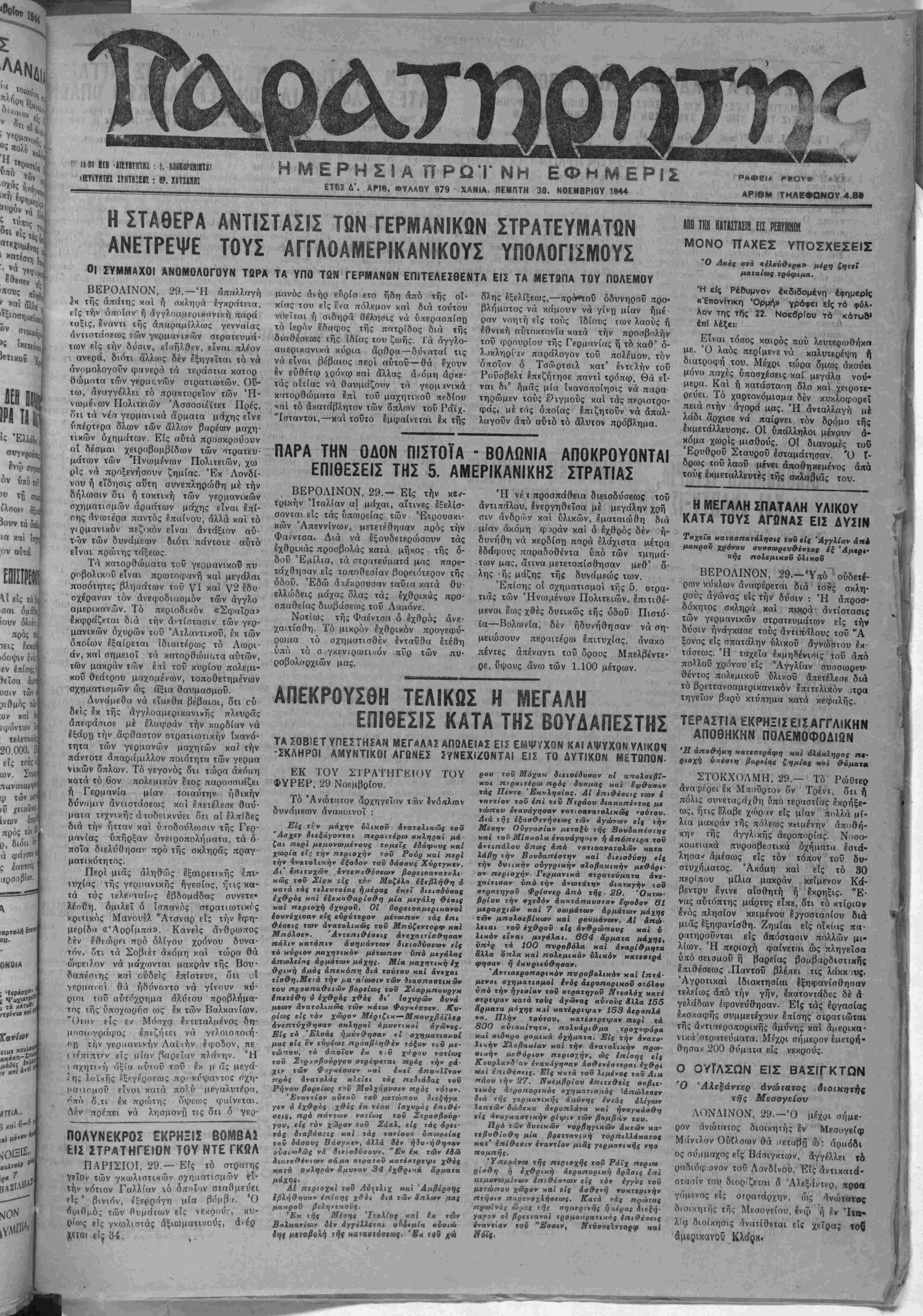 ΕΤΟϊ Δ'. ΑΡΙΘ. «ΥΑΛΟΥ 979 ΧΑΝΙΑ. ΠΕΜΠΤΗ 30. ΝΟΕΜΒΡΙΟΥ 1944
