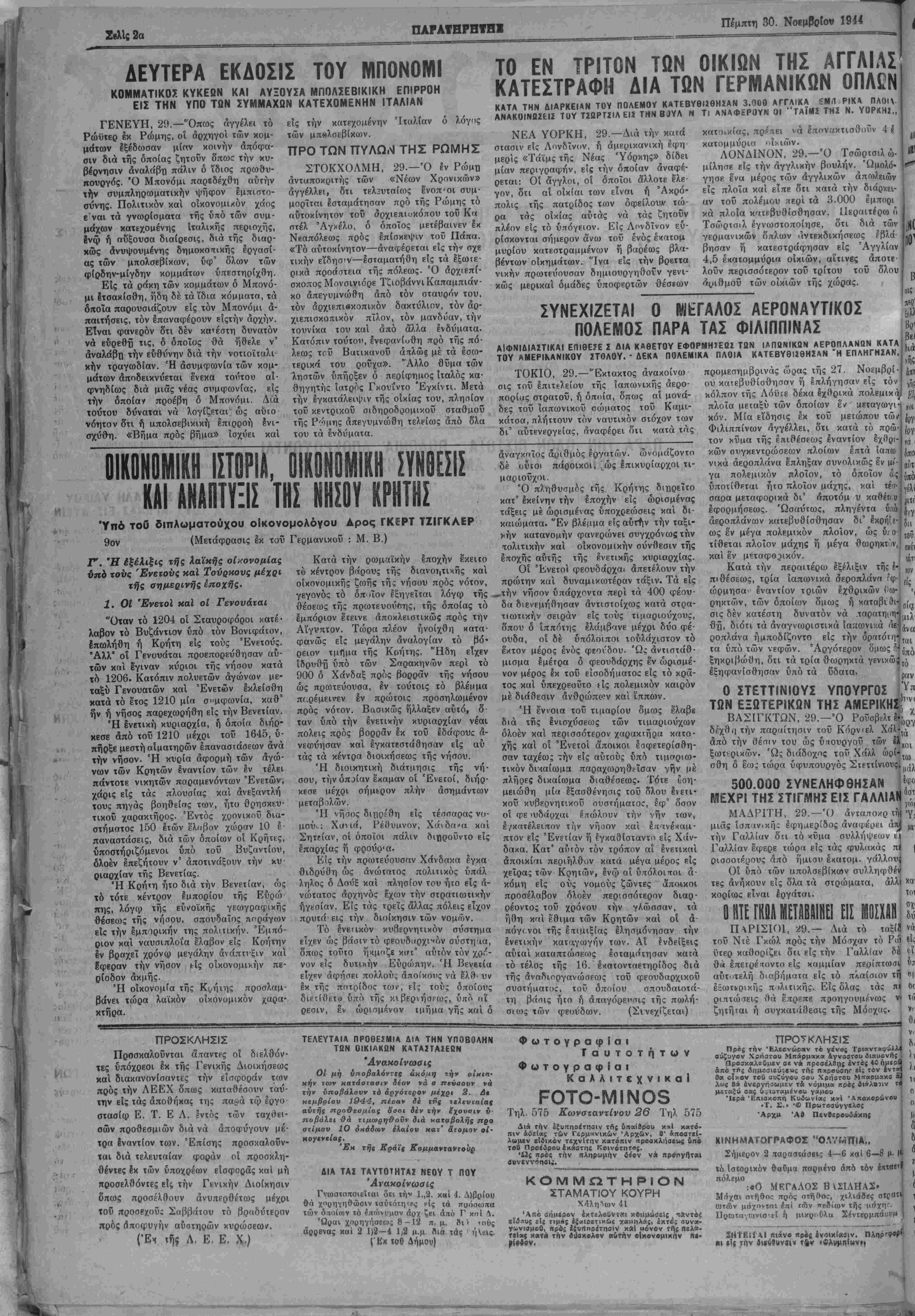 έΕωτιρικής π<>λιτικής. Είς όλας τάς π< ριπτώσεις θά έπρεπε προηγουμένως νι ζητήται ή συγκατάίίεσις τής Μόσχας. ίφο άστ "Τι ΠΡΟΣΚΛΗΣΙΣ Προσκαλοΰνται άπαντες οί διελθόν- τες ύπόχρεοι Ικ τής Γενικής Διοικήσεως καί διακανονίσανΐες την εϊσφοράν των πρός την ΛΕΕΧ όπως καταθρσουν ταύ- ττιν είς τάς αποθήκας της πα@ά τφ έργο στασίω Ε. Τ. Ε Λ. Ιντός των ταχθει- σών προθεσμιών διά νά άποψύγουν μέ- τρα εναντίον των. Έπίσης προσκαλοϋν- ται διά τελευταίαν φοράν οί προσκλη- θέντες έκ των ύποχρέων εΐσφορας καί μή προσελθόνΐες είς την Γενικήν Διοίκησιν δπως προσέλθουν άνυπΕρΰέτως μέχοι τοϋ προοεχοΰς Συββάτου τό βραδύτερον πρός αποφυγήν αύστηρών κυρώσεων. (Έμ τής Λ. Ε. Ε, Χ.) ΤΕΛΕΥΤΑΙΑ ΠΡΟΘΕΙΜΙΑ ΔΙΑ ΤΗΝ ΥΠΟΒΟΛΗΝ ΤΩΝ ΟΙΚΙΑΚΩΝ ΚΑΤΑ2ΤΑ2ΕΒΝ Ανακοίνωσις Οί μή υποβαλόντες άκόμη την οίκιη* κήν των κατάστασιν δέον νά σ πεύσονν νά την ΰποβάΧονν ιό αργότερον μέχρι 2. Δέ χεμβρίου 1944, πέραν δέ [Ας ΐε3ίυΐαί'σ< αυτής ηρο&εομίας δ'σοι δέν την έχουσιν ΰ ποβάλει θά τιμωρηΰονν δια ΗαταβοΧης προ άτιμον 10 οκάδων ελαίου κατ' άτομον οί· Μογενείας. Έκ τής Κράϊς ΚομμαντανζοΙΐρ ΔΙΑ ΤΑΣ ΤΑΥΤΟΤΗΤΑΪ ΝΕΟΥ Τ ΠΟΥ Ανακοίνωσις Γνωοιοιτοιεΐιαι δτ,ι τή« 1,,2. καί 4. Δ)βρίου θά χορηγηθώσιν ΐαύϊότητς ρίς τα ποόσωΐτα των όππ(ων ιό ί/τώνυμον άρχ ξει άιτό Γ κιΐί Λ. Ώραι χοοηγήσεως 8 —12 π, μ. οιν >ηύς