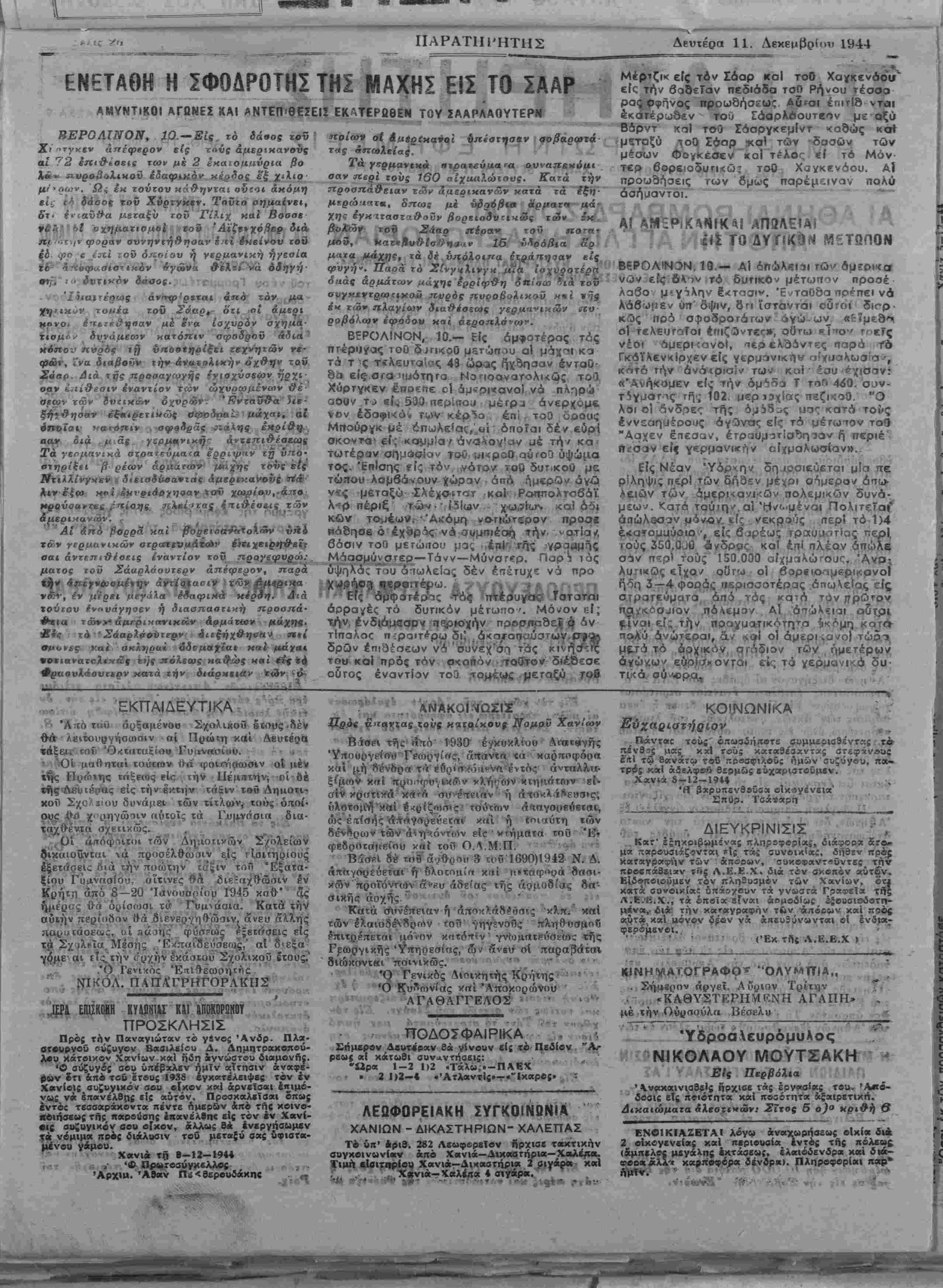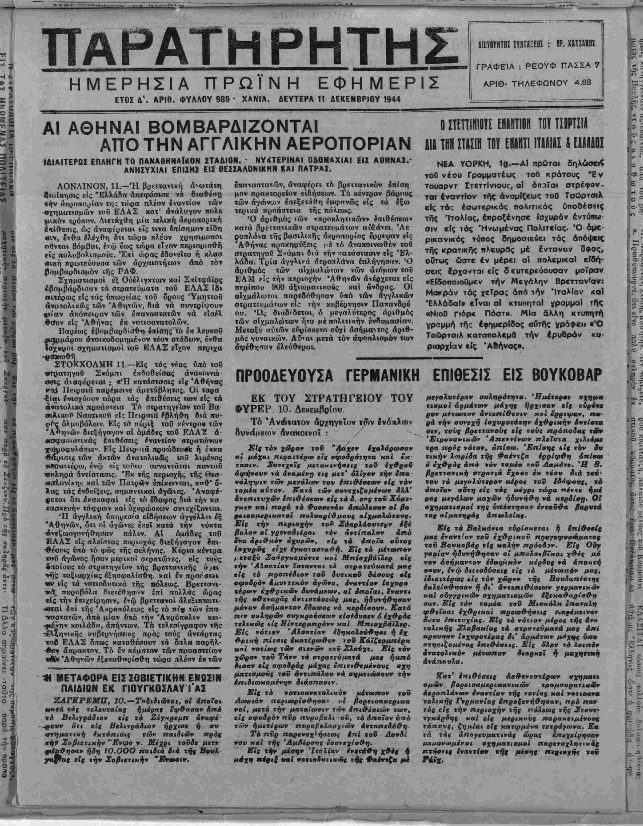 ΕΤΟΣ Δ'. ΑΡΙΘ. ΦΥΛΛΟΥ 989 - ΧΑΝΙΑ. ΔΕΥΤΕΡΑ 11 ΔΕΚΕΜΒΡΙΟΥ 1944