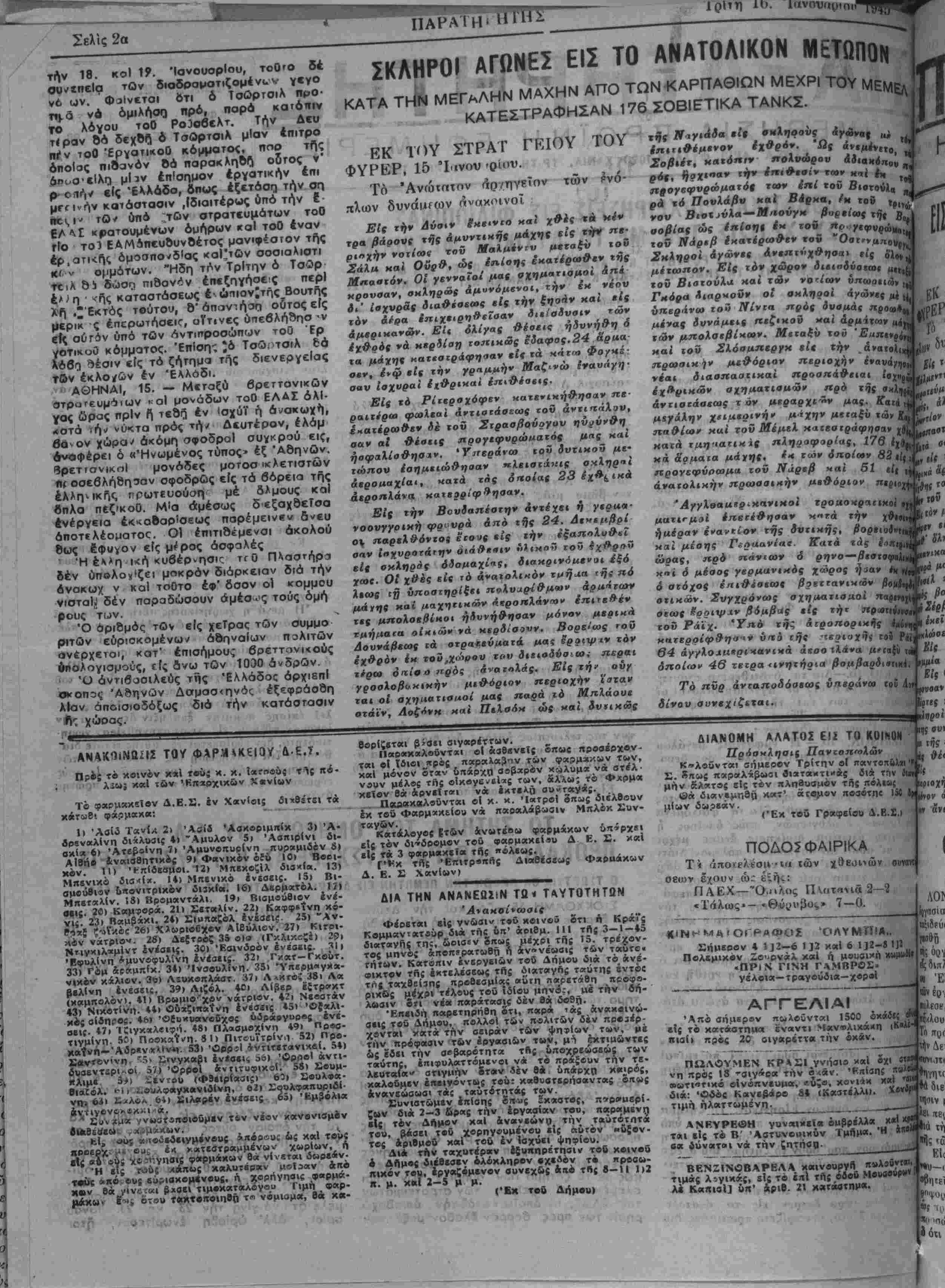λευταΐα" ατιγμήν ίτοιν ·5έν 84 υπάρχη χ«<ρός, καλούμεν έπεινόντ«ς τοΰ: χαβυβτερήααντας όπως «νανεώαωαι τάς ταΰτοτητάς των. Ευνιατώμίν (πίαης £η^( £κ«ατβς, πνρνμερί- ζ»ν διά 2—3 ώρας την έργααίαν τού, παραμένη είς τόν Δήμον χαΙ ανανχώνη την ταϋτότητί τού, βΑβει τ·ϋ χβρηγουμένου ε]; αυτόν «ΰ$ον- τος «ριβμοδ καί τού έν Ισχύϊ ι ψηφίου. Διά την ταχυτέραν εξυπηρέτησιν τοϋ κβινοΰ β ΔΑμος διέβεαεν ολέχληρον βχείβν τό χρββα- πιχόν τού, Ιργαζόμενον αυνεχως αηό της 8—11 1)2 Κ. μ. κα! 2—5 μ μ. (Έμ τοδ Δήμου) ΑΛΑΤΟΣ Είί ΤΟ ΚΟΙΝΟΝ Πρόσκλησις Πανζοπ'ολων . Κ»λβΰνται οήμεοβν Τρίτην οί παντοπϋ»!'»Ε· Σ. 3πως παραλτβωοι βιαταχτιχάς διά την ίιη·1! μην άλατος είς τόν πληβυαμον της πόλιν; @ά διαν»μηΐ() κατ' άτομον ποαότη' <ί μίων δω.ΐεάν. ('Εχ τού Γραφείον Δ.Β.ϋ,ι ν; ιρι 130 1| ^(Ο ΠΟΔΟ5ΦΑΙΡΙΚΑ Τ< άποΐϊλεσιι ·ΐί< ιών ουνανι σεων εχουν ώ; έ^ηί: ΠΑΕΧ—Ό.'ΐλος ΠνπτκΜά2—ΐ «Τάλως»— «θΐρυβος» 7—0. [II ( ι οχ^ι ^( 10" : β" ΚΙς »"« Είς ι , ανι ΑΌΪ ΌΛΥΜΠΙΑ,, Σήμερον 4 112—6 1 ]2 καί 6 112—β 111 Πολεμικον Ζο^ονάλ καί ή μοιιβική χ»μ»& ΠΡΙΝ ΓΙΝΗ ΓΛΜΒΡΟΣ» έ—τρ»γβύδια—χορβΐ ΑΓΓΕΛΙΑΙ 'Από σήμερον πωλοΰνται 1500 οχ£ίί{ είς τό κατάοτηιιαι έναντι Μ«ν»λιχάκη '""; ηια(ι πρός 20 οιγαρέττα την οκάν. ΠΩΛΟΥΜΕΝ ΚΡΑΣΙ γνήαιο νη πρός 18 ·Όΐγ*ρα την Α*άν. ' οαωτι^τιχό οΐνόκνειιμα, εδςο, ^------ διά: 'Οδός Κανεβάρο 81 (Καΐτέλλυ. τιμή ήλαττωμένη. ΑΝΒΥΡΕβΗ γ---------------.-___ ται είς τό Β' 'Αστϋνορικΰν Τμήμα βα δύναται νά την *—* — ΒΕΝΖΙΝβΒΑΡΕΛΑ χαινβυργη "Βλ»δ1ΐ' τιμάς λογικάς, είς το έ«1 τής ββοθ Μοι>αβι,ρο.ν