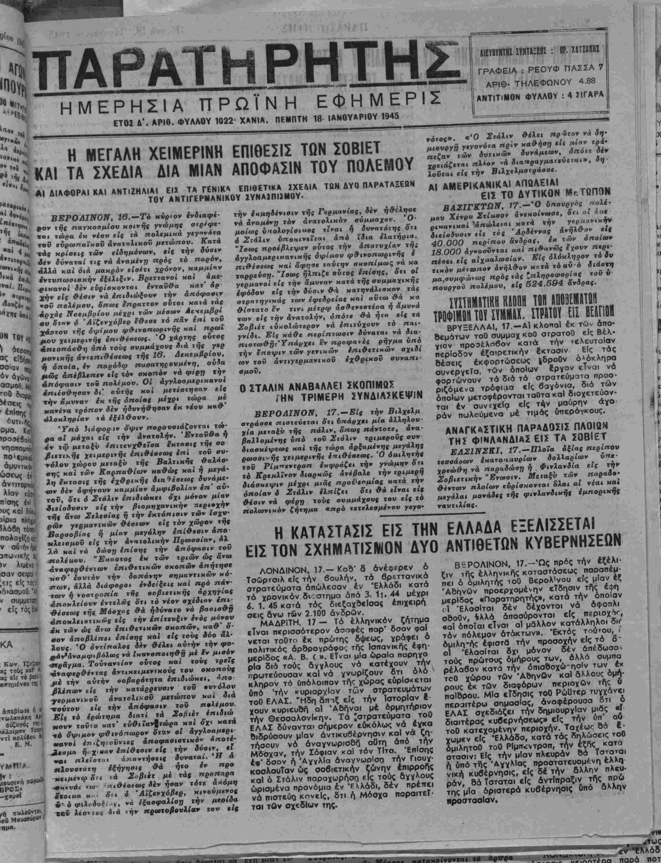 ΕΤΟΣ Δ'. ΑΡΙΘ. ΦΥΛΛΟΥ 1022- ΧΑΝΙΑ. ΠΕΜΠΤΗ 18 ΙΑΝΟΥΑΡΙΟΥ 1945