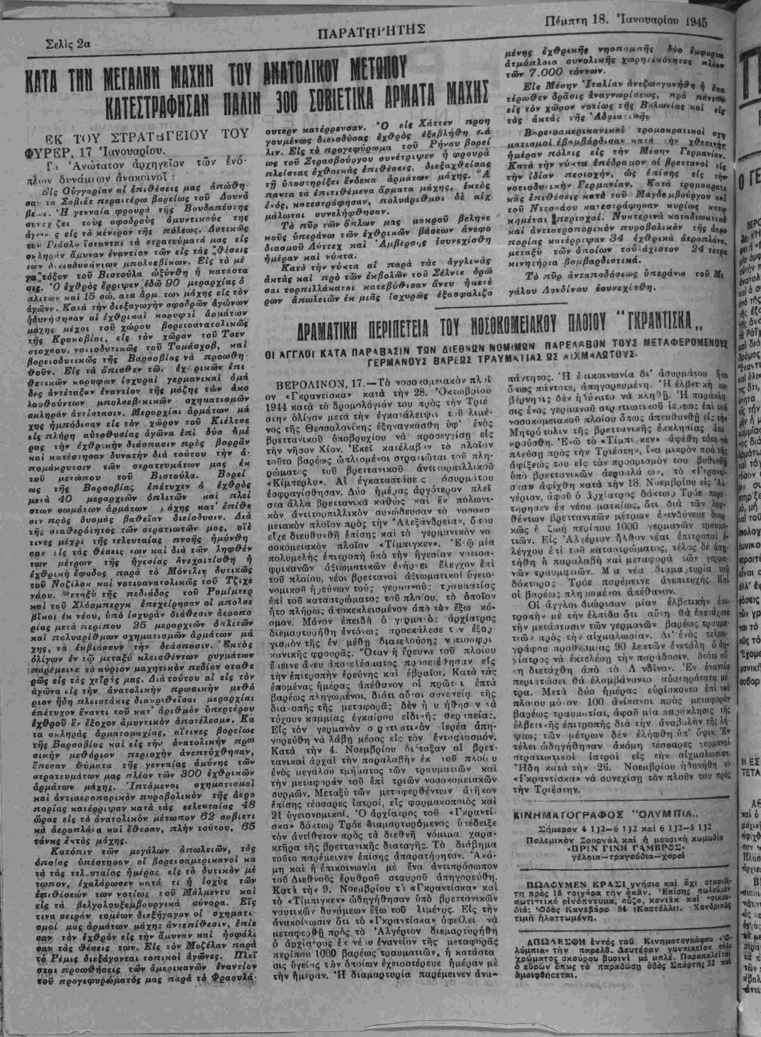 οτρατευμάτοαν μας πλέον τ<3ν 300 έχθρικώκ άρμάιοον μάχηι, Ίπτάμενοι οχηματιααοΐ καΐ άντιαεροπορικόν πυροβολικόν τής άερο ηορίας χατέρριψαν κατά τάς εελευταίας 48 ώρας είς τό ένατοΧικόν μέτωπον 62 σοβιετι κα άεροπλάια καϊ ίί&εοαν, πλήν τούτου, 65 ΐάνκς ειΐός μάχης. Κατόπιν των μιγάΧοίν απώλειαν, τας όπο'ας νηίατηααν οί βαρειοαμεριχανο'ι κα ΐά τάς τελ-υταίας ημέραι είς τό δυτικόν μέ ΐωκον, έχαλάρωοεν κατά τι ή ίοχΰς των ίαιθεσεών των νοτι'ω; τοΰ Μάλμεντυ καϊ εις τα βελγολουξεμβουργικά σύνορα. Είς τίνα σειράν τομίιον διεξήγαγον οί οχηματι ομοί μας άρμάτων μάχηί άντεπίθεσιν, εηΐε σαν τόν εχθρόν είς τή» άμυναν καϊ ηαφάίι οα,ν τάς ΰέσεις των. Είς ιόν Μοζίλαν παρά τό Ρέμις διεξάγονΐαι τοπικοϊ άγάϊνες. ΠΧεΐ σΐοι προωθήοεις των άμεοικανων εναντίον τοΰ προγεφνρ«6ματός μας παρά τό ΦραονΧά- ΪΟίΊΕΙΙ ΑΡΜΑΤΑ1011 ^ΆΈΖΧΖτ&ι ουτερν κα.έρρε.-οαν. Ό είς ««««ν γουμένο,ς διεισδύσας ίχθρός επεβλήθη λιν. £ίς τό πβογεφνρα,μα τον Ρήνου μ οος τοΰ Στραοβούονον οννίτριψεν η ςορουρα πλείστα* έχθοικάς ίπιθέσεις, διεξαχθεισαβ τή νχοστηρίξει ίνδεκα άρμάτων μαχης. Α παντα τα έπιτιθέμενα ά'ρματα μάχης, έκτός ε»ός, κητεοτρόφηοαν, πολυάριθμοι δέ αιχ μάλωτοι συνελήφθησαν. Τό πΰρ των ό'πλων μας μ,αποον βεληνε κοΰς υπεράνω των έχθρικΛν βάσεων άνεφθ διααμον Δύττεχ καΐ Άμβαρο,,ς Ισυνεχι'οθΐ) ημέραν καΐ νύχτα. ΙΓατβ την νύκτα αί «αρά τα< «γγλινάς ακτάς καΐ «ρό των ίκβοΧ&ν τού ΣέΧνίε Αοά>