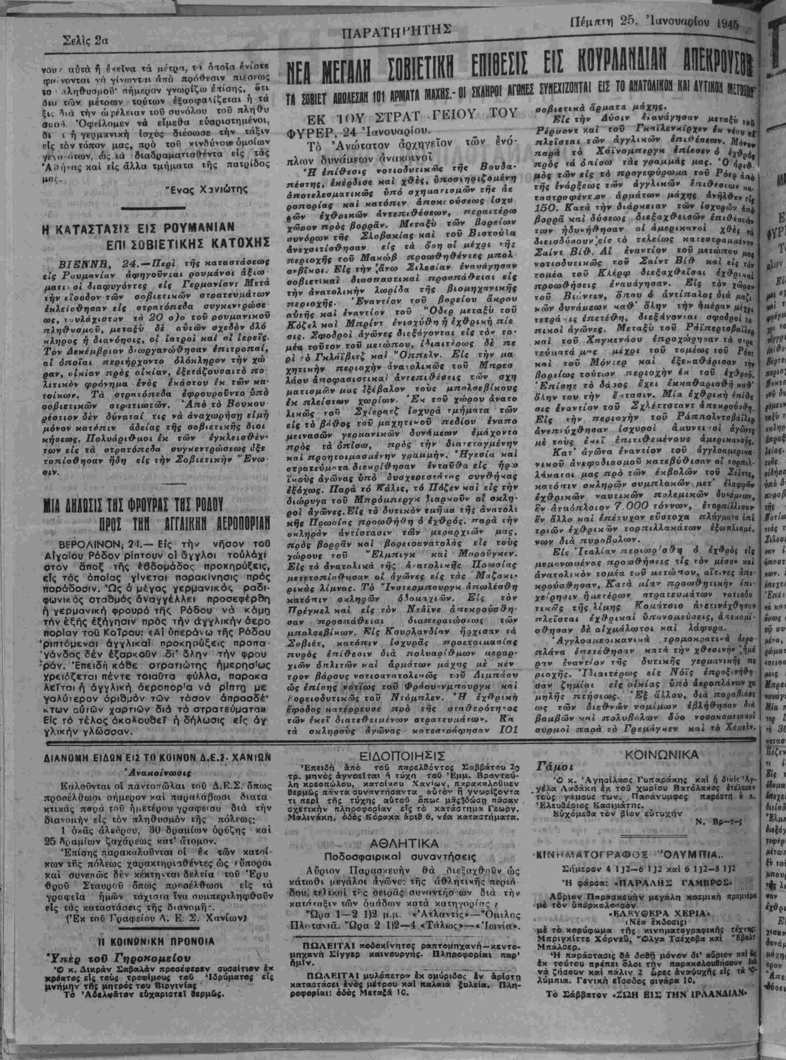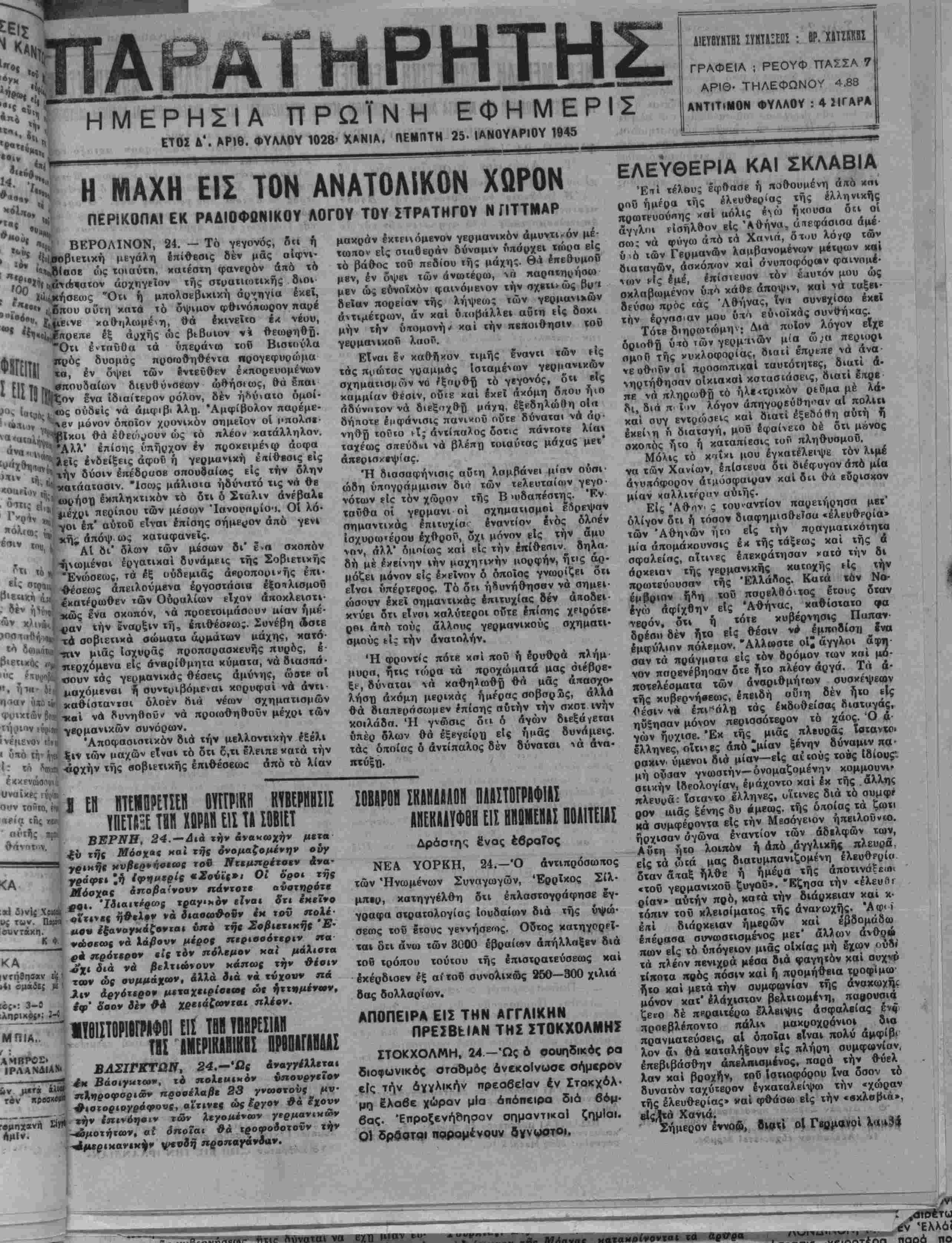 ΕΤΟΣ Δ*. ΑΡΙΘ. ΦΥΑΛΟΥ 1028· ΧΑΝΙΑ, ηΕΜΠΤΗ 25· ΙΑΝΟΥΑΡΙΟΥ 1945