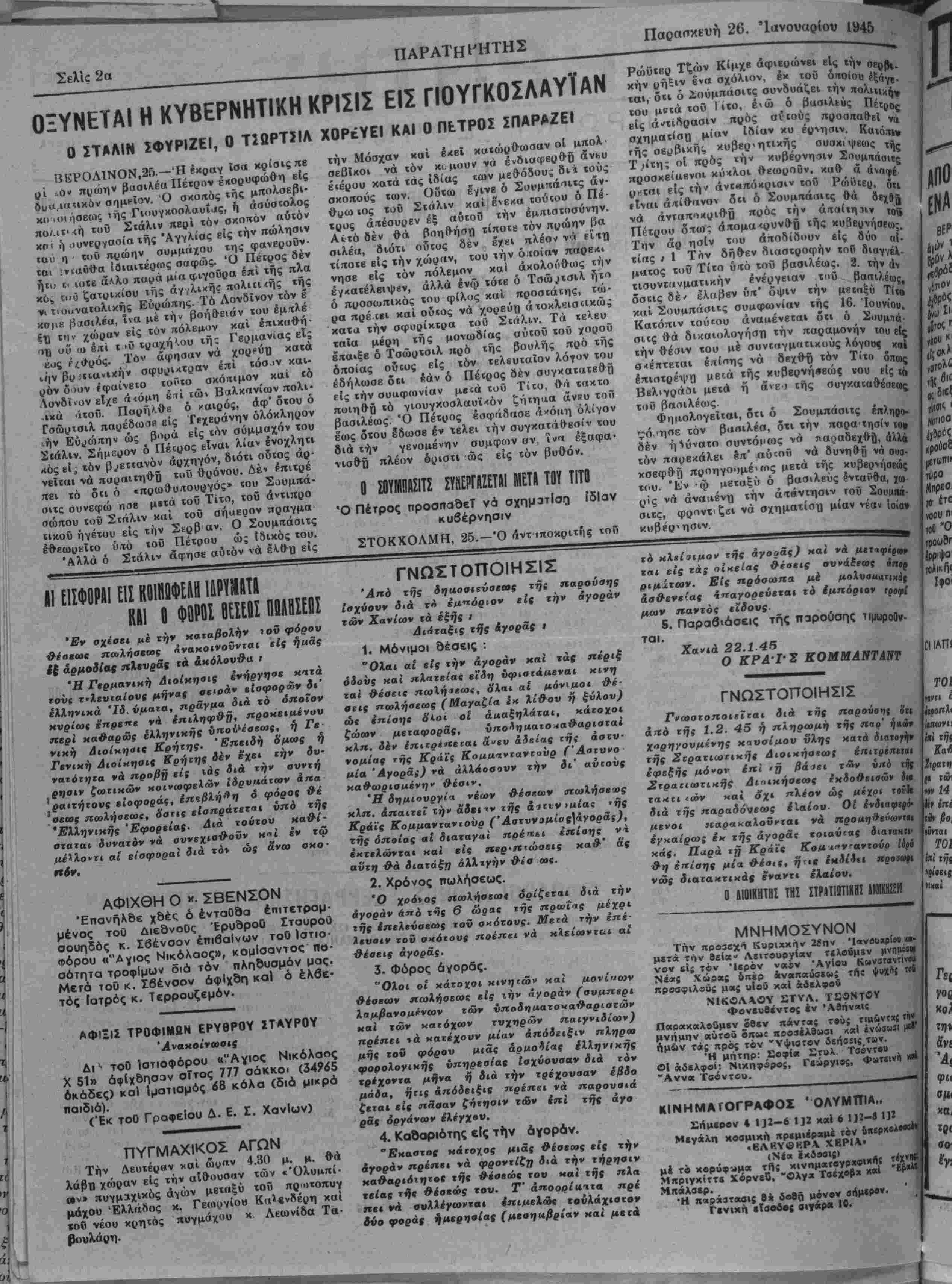 τρυς άτέσυρεν ες <·ν»«- Αιτό δέν θά Ροηθήση τίποΐε τόν . αιλέιι, διότι οδτυς δεν εχκι πλέον ν·^( τίιτοτβ είς την χώρον, τού την όιοιαν ιχαρεκι νησε είς τόν πόλεμον χαι άχολοόθιος την έγΛατέλειψβν, άλλά ένφ τότβ ό Τοώ^τβιλ ήτο ό προσωπικάς τού φίλος καί προατάιης, τώ- ρα πρέ «ι χαί οδΐος νά χορεύη άτοκλβισιικώς χατα την σφυοίκτοα τοϋ Σιήλιν. Τα τελευ ταϊα μέρη τής μονωοίας αύτοΰ τοϋ χοροΰ έηαιξε ό Τσώρτσιλ ιιρό τής 0ουλής πρό τής οποίας οίιος ρίς τόν τελβυΐαϊον λόγον τού εδήλωσε ότι ίάν ό Πέιρος δέν συγκαΐατε&ϊ) Είς την σοαφωνίαν με<·ά τυΰ Τιτο, θά τακτο ποιηθή τό γιουγκοσλαυϊ·<όν ζήιηαα άνίυ τοΰ βασιλέως Ό Πέτοος έσφάοαοε άχόιιη ολίγον εως ότου Ιδωσε έν τέλει την συγκατιίΒ-εσίν τού διά την γενομένην συμφοιν όν, ίνα έξαφα· νιοθμ πλέον έριστι ώς είς τόν βυθόν. Ο ΣΟΥΝΐηΑΣΙΤΣ ΣΥΗΕΡΓΑΖΕΤΛΙ ΜΐΤλ ΤΟΥ ΤΙΤΟ Ό Πέτρος προσπαθεΤ νά σχημοτίσΓ) ιδίαν κυβέρνησιν ΣΤΟΚΧΟΛΜΗ, 25.—Ό άντ ιποκριτής τοΰ ΓΝΩΣΤΟΠΟΙΗΣΙΣ ' Αηύ τής δηασοιεΰαεως τή; παρούσης Ιοχύονν διά τη εμπόριον είς την αγοράν των Χανίων ΐά εξής ι Διάταξις τής αγοράς ι 1. Μόνιμοι Θέσεις : "Ολαι αί είς την αγοράν καϊ τάς πέριξ οΐους και ηλατείαβ εΐ'ση υφιστάμεναι κινη ταΐ θέσειε πωλήιεαχ, όλαι αί μόνιμοι θε 0(ΐς ποολήσεοος (Μαγαζία ίκ λίθου ή ξύΐου) ώ^ ίηίαης ό'Ιοι οί άιια^ηλάται, κάζοχοι ζώων μεΐαφορας, ΰπο^ηΐιατο^αθαρισταϊ κλπ. δέν έπικρετκεεαι α»εν αδείας τής άστυ* νομίας τής Κράϊς Κοιιμ,ηνταντανρ (Άοτννο μια 'Αγοράς) »ά άΚλάοοονν την δι' αυτούς καθανριοαένη** θέσιν. Ή δημιουργία νέων θέσίοον στωΧήαεος κλπ. άπαιτεΓ τή» αδειαν ΐής αιτνν >ιχία.ς τής