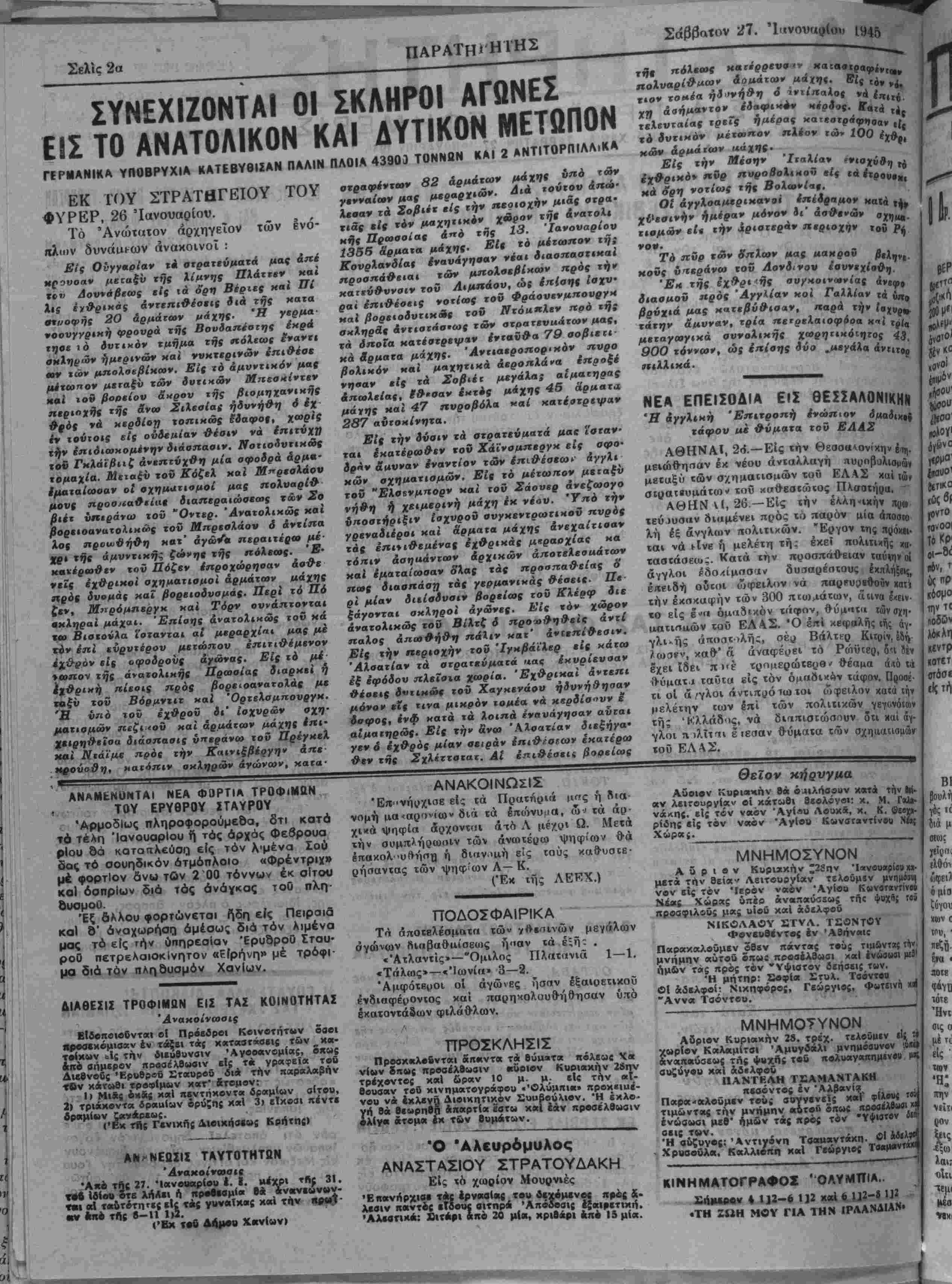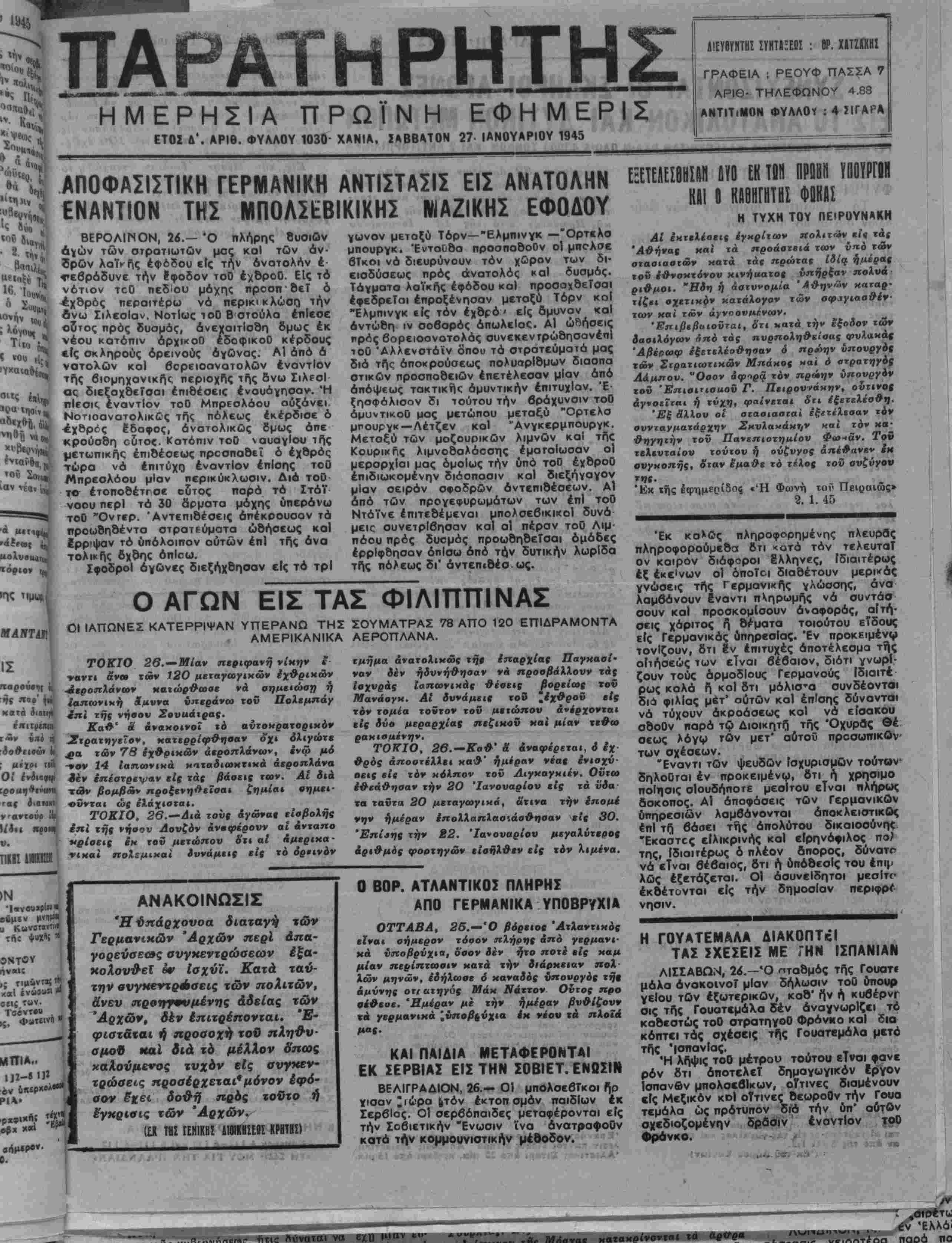 ΕΤΟΣ Δ'. ΑΡΙΘ. ΦΥΛΛΟΥ 1030 ΧΑΝΙΑ. ΣΑΒΒΑΤΟΝ 27- ΙΑΝΟΥΑΡΙΟΥ 1945