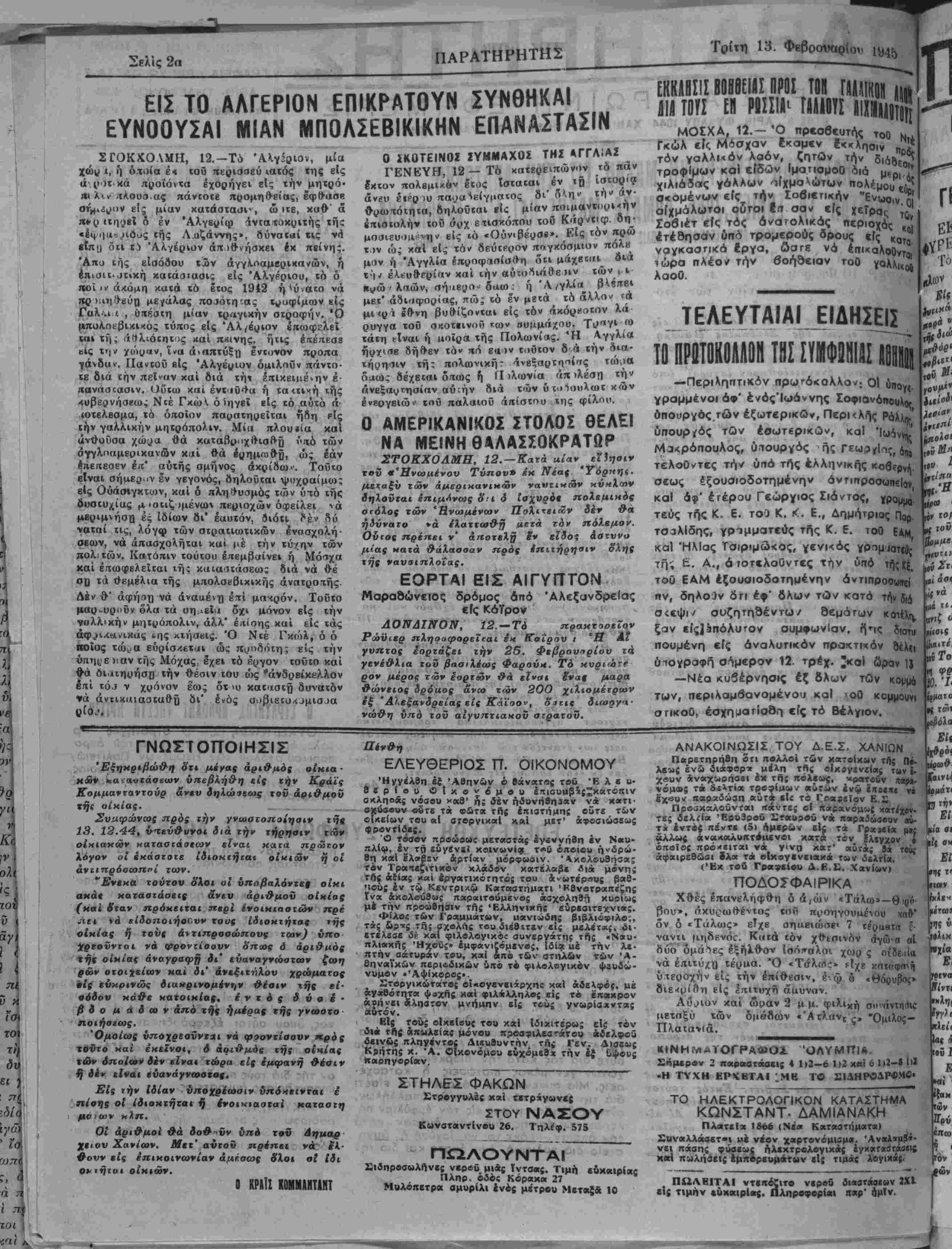 ήίαν αύΐήν διά των ΰτιΐΐοιιλωτ κ<ϋν τηϋ παλαιοϋ ΓΪπίσΐοο ΐης φίλοιι. το0 ΜΟΣΧΑ, 12.-Ό Γκώλ είς ΜΑσχαν των γαλλκόν λαόν, ζητων την τροφΐμων καί είδών ΙματισμοΟ διά μ«0ι ί' χιλιάδας γάλλων ο(χμαώτων πολίμου%£ σκομέναν είς την Σοβιετικήν "Ενωσιν οί αΐχμάλωτοι οδτοι 6ίτ σαν €(ς χείρας Τβ Σοβιέτ είς τάς άνατολικάς περιοχάς κ.1 ετέθησαν υπό τρομερούς δρους είς Κοτο' ναγκασπκά ίργα, ώοτε νά έπικαλοθντοι ιώρα πλέον την βοήθειαν τοθ γολ^ λαοθ. Π Ο ΑΜΕΡΙΚΑΝΙΚΟΣ ΣΤΟΛΟΣ ΘΕΛΕΙ ΝΑ ΜΕΙΝΗ ΘΑΛΑΣΣΟΧΡΑΤΩΡ Γ3 ΣΤΟΚΧΟΛΜΒ. ^ τβϋ «Ηνωμένον Τύπον» «κ ίΓέας Ύόρηΐ}<. μααξυ των αμερικανικόν νακτικίβν κΰκλοον δηλούται έπιμΛνως 8η ό Ιβχνρόι «ολεμικός ΟΓόΙος των Ήνωμένων ΙΤολιτεκΒν δέν θα ήίνναΐο »ά ελαττωθή ακτά τ6ν πόλεμον. Ούιος πρέπει ν" αποτελεί ι* εΐδος άστννο μίας καΐά &άΧαοοαν πρός ίπιΐήρηβιν ο'λης τής ναυβιπλοΐας. ΕΟΡΤΑΙ ΕΙΣ ΑΙΓΥΠΤΟΝ Μαραθώνειος δρόμος 6πό ΆλεζανδρεΙας είς Κάϊρον ΛΟΝΔΙΝΟΝ, 12. —Τό πληοαφοοείΐται £η /Γαΐρον ι ζ ή 25 Φβ Αι η ρ γυπτος εορζάζβι «ήν 25. Φεβρουάριον τα γενέθλια τοΰ βασιλέως Φαρούκ. Τό κυριώτε¬ ρον μέρος τ<5ν εορτήν θά είναι έ"να< μαρα θώνειος ίρόιιος άνω τ&ν 200 χιλιόμετρον έξ ΆΧΐξανίρείας εί{ Κάϊαθ", 6Ίζις διωρν·»· νώθη υπό τοΰ αιγυπτιακού αζρατοϋ. ΤΕΛΕΥΤΑΙΑΙ ΕΙΔΗΣΕΙΣ ΤΙΙ ΠΡΩΤΟΚΟΛΛΟΝ ΤΗΣ ΙΙΙΦΝΙΙΙΐ|) —ΠεριΚηπτικόν πρω'όκολλο^: ΟΙ 6πογ(. γραμμένοι ά»' ένός'Ιωάννης ΣοφιανόηουΙκν ύπουργός των εξωτερικών, Περκλής ΡώΑλι*·* υπουρ/ώς των έσωτίρικών, καί Ίωάνν«( Μςκρόπουλος, ύ^ουργάς ής Γευρ^Ι^ ^ τελοΟντες την υπό τής έλληνικής κοβερν/|. σεως έξουσιοδοτημένην άνππροσοηι|βΤι καί άτ' ετέρου Γεώργιος Σιάντος, γραμμα. τεύς τής Κ. Ε. τοθ Κ. <. Ε., Δημήτριος πΟρ. τσαλίδης, γρτμματεύς τής Κ. Ε. τοθ ΕΑΜ, καί ΉΜας Τσιριμώκος, γενκάς τή; 6. Α., άτοτβλοθντες την υπό . τού ΕΑΜ έζουσιοδοτημένην άντιπροο«ΐι£| πν, δηλοθν δπ έφ' δλων των κατό την 5^ σ<εψι/ συζητηθέ/τω/ Θεμότων κατίΧτν ζαν ίίς]3πόλυΓθν συμφωνίαν, η^ις 5ιατιι πουμένη είς άναλυπκόν πρακτικόν 8ί(, ύιογραφή σήμερον 12. τρέχ. ;<αί ώραν 11 —Νέα κυβέρνησις έζ δλων τϋν κομμά των, περιλαμβανομένου κοί ΐοθ κομμουνι σπκοθ, έσχηματίαβπ είς τό Βέλγιον. ΐο ΐν ϊίί «Κ ,ονίΐ ,ιίί»»1 ίί το' II «ΟΙ ιά "< «ιο'ί ». '/ ΓΝΩΣΤΟΠΟΙΗΣΙΣ *£|ηκριβώθη ό'π μέγας άοιθμός οίκια - καία«τάθ6«>ν υπεβλήθη είς ιήν Κράϊς
