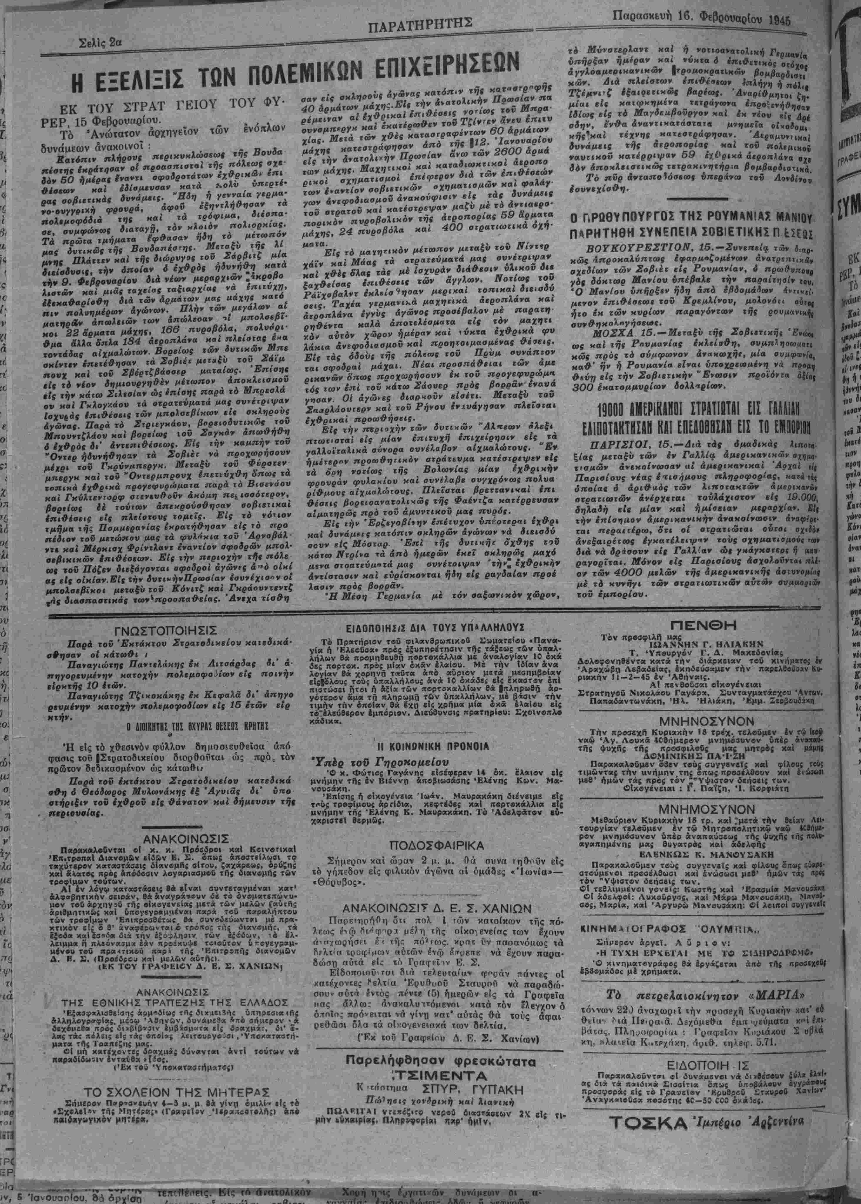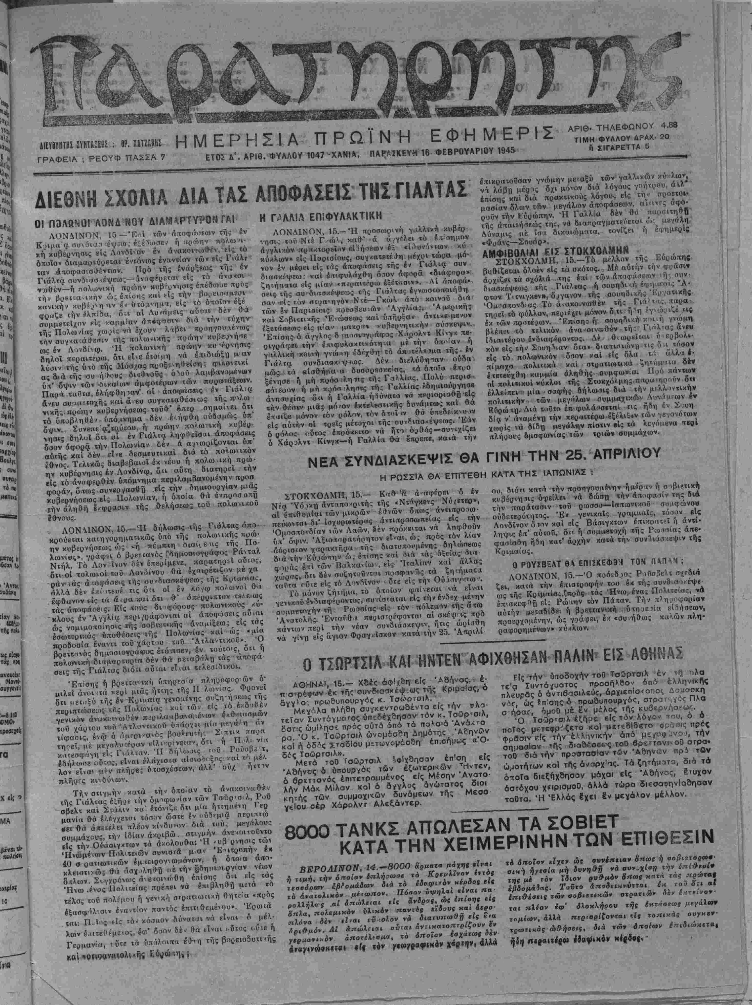 ΓΡΑΦΕ1Α ; ΡΕΟΥΦ ΠΑΣΣΑ 7 ΕΤΟϊ Α·, ΑΡΙΘ. *ΥΛΛΟΥ 1047-ΧΑΝΙΑ, ΠΑΡ-ΑΪΚΕΥ* 16 ΦΕΒΡΟΥΑΡΙΟΥ 1945