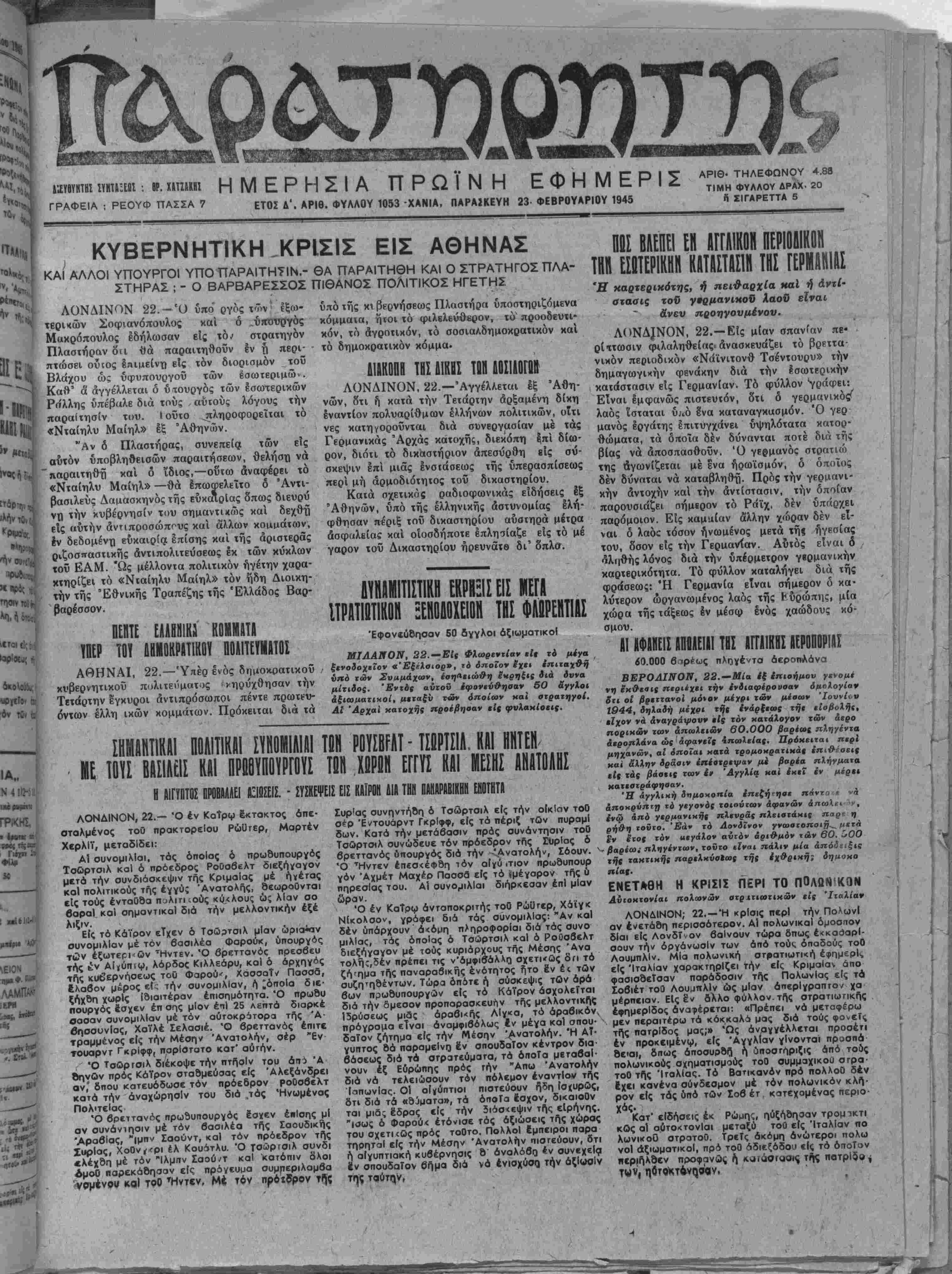 ΓΡΑΦΕΙΑ ; ΡΕΟΥΦ ΠΑΣΣΑ 7 ΕΤ0Σ Δ'. ΑΡΙΘ. ΦΥΛΛΟΥ 1053 ΧΑΝΙΑ, ΠΑΡΑίΚΕΥΗ 23 ΦΕΒΡΟΥΑΡΙΟΥ 1945