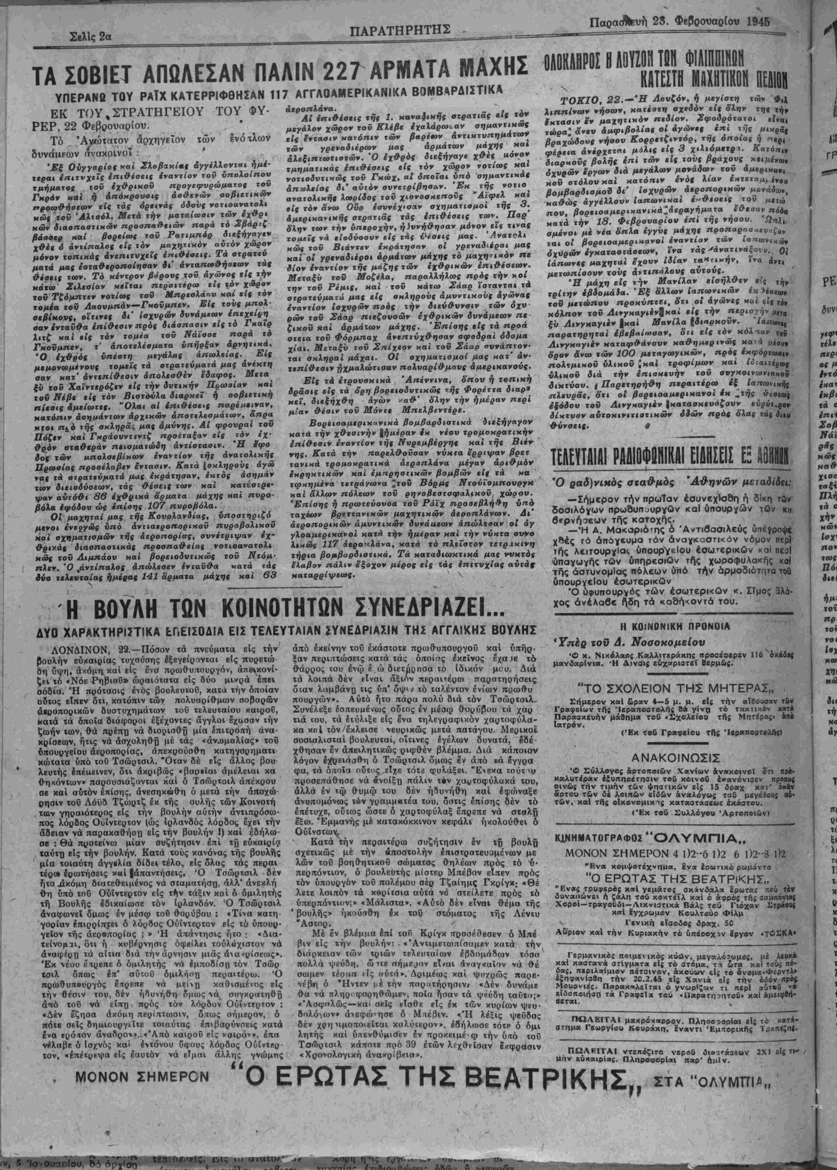«λευράί, ό'ΐι οί /βορειοαμερικανοί <κ .τής ΰεοι«| έξοΑΌυ τοΰ Δινγπαγιβν |κατασκευά(ουν εϋρύχ^(0, δίκτυον αΰτοκινιτιατικ<όν δδών πρός ό'λας τάς ίαν θύνσεις. * ΤΕΛΕΥΤΑΙΑΙ Ρ11Ι0Φ1Κ1 Ό ραδ)νικός σταθμός Αθηνών μεταόιοει.· —Σήμερον την πρωΐαν εσυνεχίσθη ή δΐκη τθν δοσι λόγων πρωθυιτυυργΰν κ αί υπουργόν τΟν κυ βρήεων της κατοχής. —Ή Α. Μακαριότης δ Άντιβασιλεύς ΰπένροψ» χές τώ άπόγευμα τόν αναγκαστικόν νόμον περΙ τής λειτουργΐαι, ύπουρδ/^Ιου εσωτερικώ ν καΐ πεοΙ ιύπαγυγής των ΰπηρεσιθν τής χωροφυλακής κσΙ τής άστυνομΐας πόλεων υπό την άρμοδιότητα τού ΰπουργεΐου εσωτερικήν Ό ύφυπουργός των εσωτερικόν κ. Σίμος 3λά· χος ανέλαβε (δη τα καθή<οντά τού. Η ΚΟΙΝΟΝΙΚΗ ΠΡΟΝΟΙΑ Τπέρ τού Δ. Νοσοκομείον Ό χ. Νικόλαος Καλλιτβράχπί πρβοέφερίν 116 βχάι5«{ μανδαρίνια. Ή Δ)ναις ΐύχκριβτβΐ Ββρμώς. "ΤΟ ΣΧΟΛΕΙΟΝ ΤΗΣ ΜΗΤΕΡΑΣ,, . Σήμεραν καΐ ώραν 4—5 μ. μ. είς την αϊβουβοιν τ&ν Γραφείων τΆ{ Ίεραΐτοατβλής βά γίνη τέ> τκκτικβν χ>τ«
