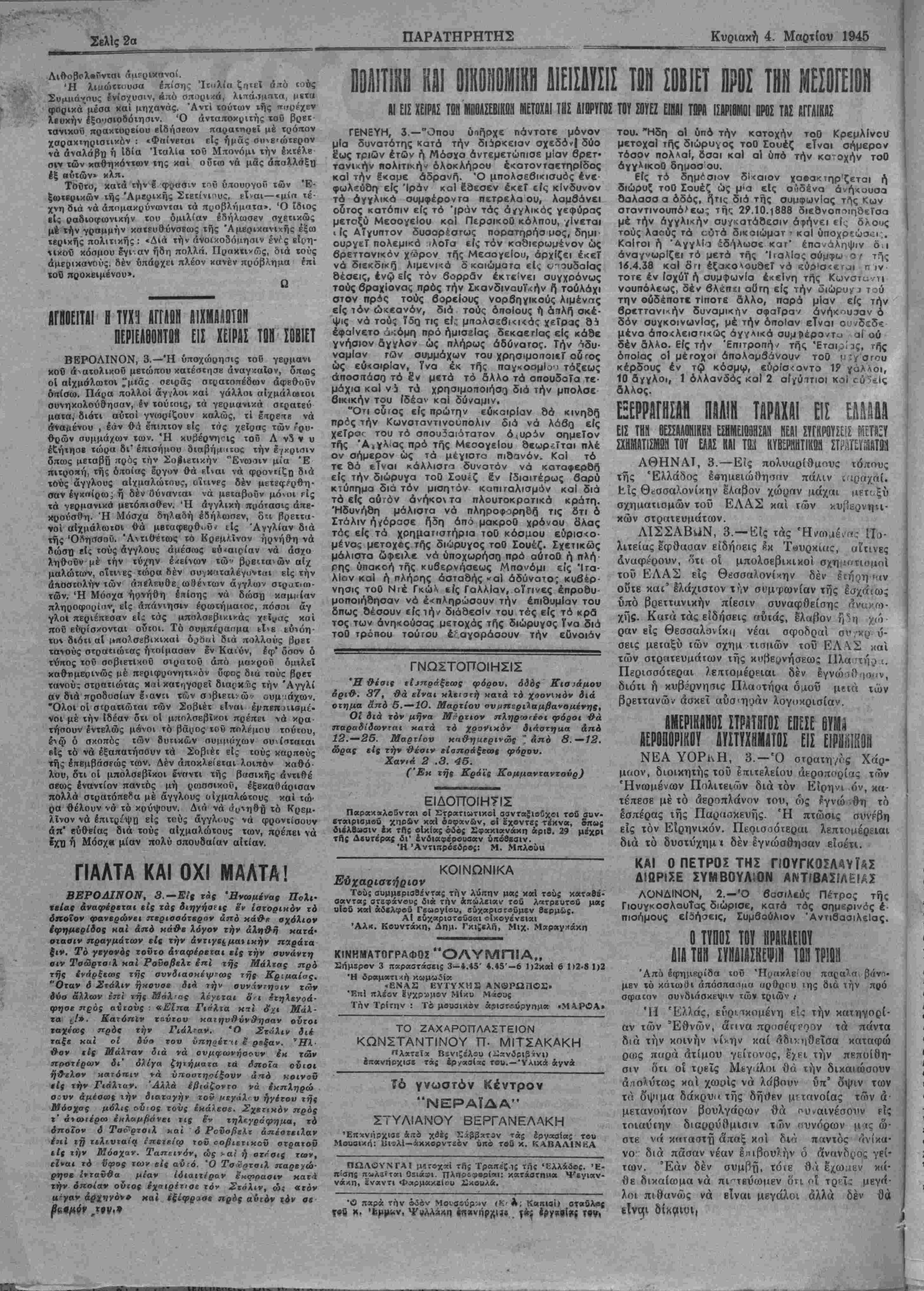 16.4.38 καί δπ έξακο^ουθεΤ νά εΰρ)σ<εΓοι π ιν τοτε έν Ισχύϊ ή συμφωνΐα έκείνη τής Κωνστυ-,ιι νουπόλεως, δέν βλέπ:ι αυτή είς την όιώρυνο τ ;»ύ την ουδέποτε τΐποτε αλλο, παρά μίαν είς την βρεττανΐχήν δαναμικήν σφαΤρα' άνήκηυσαν ά δόν συγκοινωνΐας, μέ την Οποίαν είναι οι./δεδε μενά άπο<λεισπ<ώς άγγΑΐκά συμρέρο/το αί ού δέν δλλο. Είς την Έπιτροπή/ τής 'Εται,;! Ίς, ιής οποίας οί μέτοχοι άπολαμβάνουν τοθ 'ΐ^στου κέρδους έν τφ κόσμφ, εύρ(σ<οντο Ϊ9 γάλλοι, 10 βνγλοι, 1 όλλανδός καί 2 αΐγύιτιοι κοί ού^Ις βλλος. ΕΞΕΡΡΛΓΗΣΑΜ ΠΑΛΙΝ ΤΑΡΑΧΑΙ ΕΙΣ ίλϋϋΔΑ ΕΙΣ ΤΗΐΙ ΟΕΖΣΗΐαΠΙΚΗ» ΕίΗΜΕΙΟίΗΣΙ ΗΕΚΙ ΣΥΓΚΡΟΥΣ£ϊΣ ΒΕΤΙΞΤ ΣΧΗΜλΤΙΣΜΟΝ ΤΟΥ ΕΑΑΣ ΚΑΙ ΤΟ.Ι ΚΥΒ^ΡίΙΗΤΙΚΟ» Π.,ϊΚϊ,ΜΜ ΑΘΗΝΑΤ, 3.—Είς πολυαοίθμους τόπους τής Ελλάδος έβημειώθησαν πάλιν ς ιρηχαί. Είς Θεσσαλονίκην έλαβον χώραν μαχαι σχηαατισμών τού ΕΛΑΣ καί των κών στρμηευμάτων. ΛΙΣΣΑΒ,ίΝ, 3. —Είς τάς Ήνω,ιένη; Πο· λιτείας έφθασαν είδήοεις έκ Τωυρκιας, αΐτινες άναφέρουν, ότι οί μπολοεβιιακοί σχηικίΐιομηϊ τού ΕΛΑΣ είς Θεσσαλονίκην δέν έτήοη ΐαν οίίιε και' ελάχιστον την συμφωνίαν τής εσχάτως υπό βρεττανικήν πίεσιν συναφθείσης (ΐναίτο· χής. Κατά τάς είδησεις αύτάς, έλαβον ι^η χώ ραν είς Θεσσαλονίκιι νέαι σφοδραί σν,·νρ ύ- σεις μειαξύ των σχημ τισμών τοϋ ΕΛΣ καί των σΐρατευμάτων τής κυβερνήσεως Πλα.'τήρ ;. Περισσότεραι λεπτομέρειαι δεν έγνώ-τΐΚιοον, διότι ή κυβέρνησις Πλαοτήρα όαοΰ μβιά των βρεττανών άσκεΐ αύσ<ηίάν λογοκρισίαν. ΑΜΕΡΙΚΑΗΟΣ ΣΤΡΑΤ3Γ0Ι ΕΠΗΕ 6ΥΜα ΑΕΡΟΠΟΡΙΚΟΥ ΔΥΠΥλΗΜΑΤΟΙ ΕΙΣ ΕΙΡϋπΙΟπ* ΝΕΑ ΥΟΡκΗ, Β. —Ό στρατη^ς Χάο- μπον, διοικτιτής τού έιτιτελείου άεροπορί^ς των Ήνωμένων Πολιτειών διά τόν Εϊρηνι όν, κα¬ τέπεσε μέ τό άεροπλάνον τού, ώς εγνώ ·θη τό εσπέρας τής Παρασκευής. Ή πτώσις συνέβη είς τόν Ειρηνικόν. Πεοισσόιεραι λ?πτομέρ£ΐαι διά τό δυστύχημ ι δέν εγνώσθησαν εισέτι. ΚΑΙ ΟΠΕΤΡΟΣΤΗΣ ΠΟΥΓΚΟΣΛΑΥΪΑΣ ΔΙΩΡΙΣΕ ΣΥΜΒΟΥΛίΟΝ ΑΝΤ'ΒΑΣΙΛ&ΙΑΣ ΛΟΝΔΙΝΟΝ, 2.—Ό βασιλεύς Πέτρος της ΓιουγκοολαυΤας διώρισε, κατά τάς σημερινάς Ι- πισήμους εϋήσεις, Συμβούλιον ΆντιβασιλεΙας. Ο Τ ¥ Π Ο Σ ΤΟΥ ΗΡΑΚΛΕΙΟΥ ΔΙΑ ΙΗΙΙ Ϊ1ΜΙΜΧ ΤΟϋ ΤΡ1Ο» Άπ6 εφημερίδα χοϋ "Ηρακλείου παςα'α βάντ μέν ΐ6 κάιωίίι άντόσιταιΐμη ι/ρθρι υ της διά την πρό αφαιον συν8ιάσκε.ψιν των τριών ι Ή Ελλάς, ευρπκομένη είς την κατηγορί¬ αν των Εθνών, άτινα προσίΐίΐ'οον τα πάντα διά την κοινήν νί>ην καί «δινηθεΐσα καταφώ