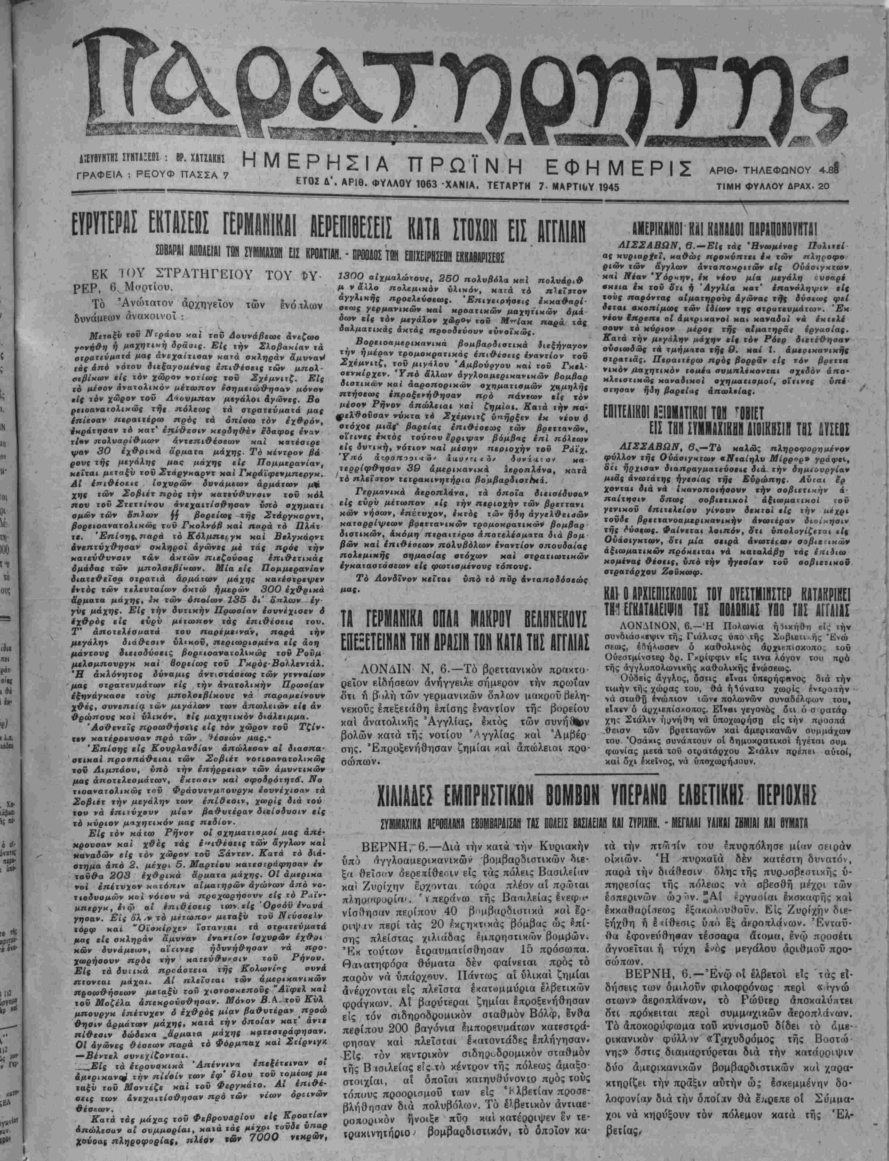 ΕΤΟΣ Δ . ΑΡΙΘ. ΦΥΛΛΟΥ 1063 ΧΑΝΙΑ, ΤΕΤΑΡΤΗ 7- ΜΑΡΤΙυΥ 1945 ΤΙΜΗ ΦΥΛΛΟΥ ΔΡΑΧ. 20