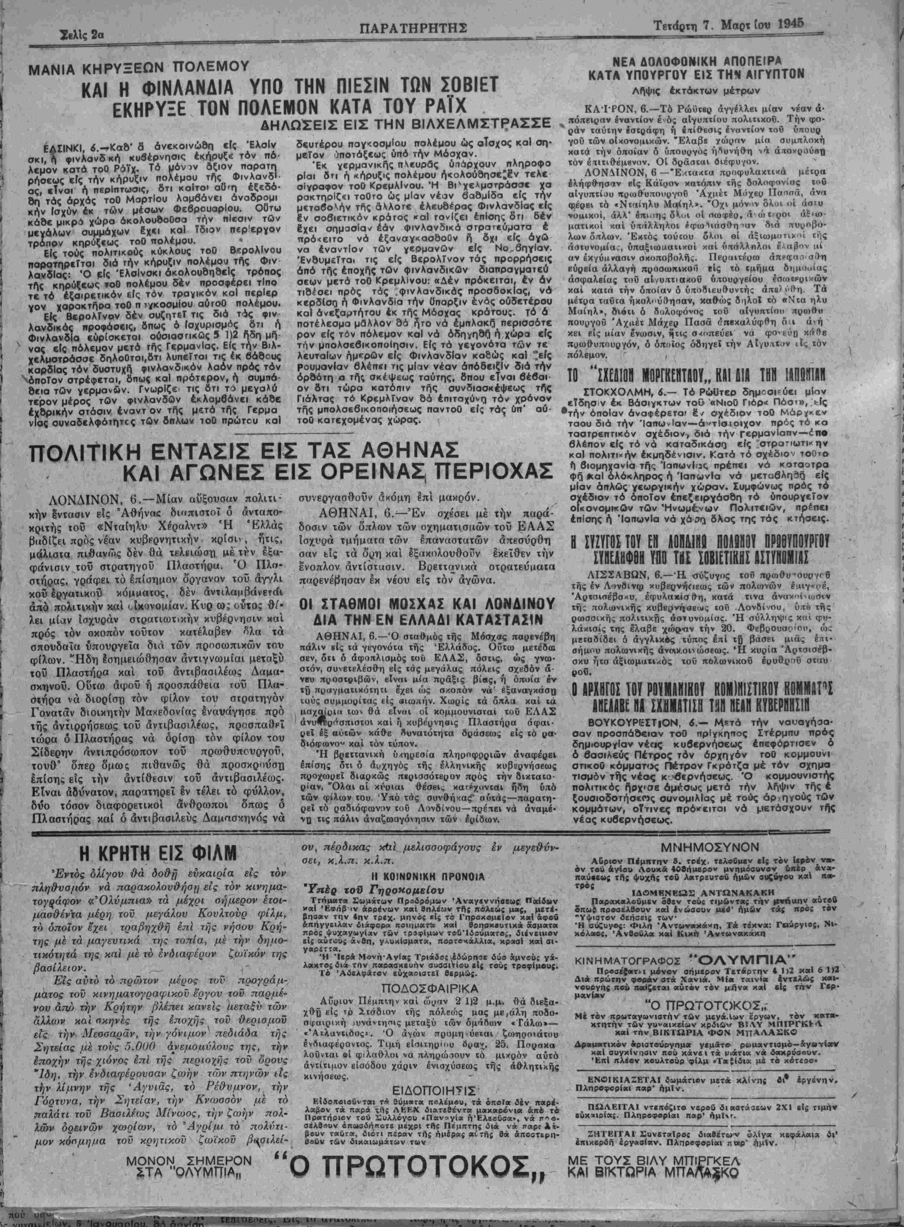 τής πολα)νικής κυβερνήβεως ΐοΰ Λονδίνου, ΰ;τ<9 τής ρωσσικής πολιτικής όστυνομίος. Ή σύλληψις καί φυ· λάκιοίς της έλαβε -χώρον την 20. Φεβρουάριον, ώί μεΐαοίδει ό άγγλικάς τύπος επί τβ βάσει μιάς επι¬ σήμου πολωνικής άναιν.οιι ώσεως. Ή κυρία Άρτσισέβ- σκυ ήτο άξιωματΐχός τοΰ πολωνικοϋ έυυθραϋ σταυ ροθ. Ο ΑΡΧΗΤΟΙ ΤΟΥ Ρ0ΥΜΑΜ1Κ0Υ ΗΟΜΐΗΙΠΙΚΟΥ ΚΟΜΜαΤΪ ΑΗΕΑΑΒε ΠΑ ΙΟΜΑΤΙΙΗ ΤΗΝ ΝΕΑΙ! ΚΥΒΕΡΝΗΣΙΝ ΒΟΥΚΟΥΡΕΣΤΙΟΝ, 6.— Μ«τά την ναυαγήσα- σαν προσπάθειαν τοθ πρΐγκηττος Στέρμπυ πρός δημιουργίαν νέας κυβερνήσεως έπεφόρτισεν ό ό βασιλεύς Πέτρος τόν αρχηγόν τοθ κομμουνι στικοθ κόμματος Πέτρον Γκρότζα μέ τόν σχημα τισμό ν τής νέοις κυβερνήσεως. Ό κομμουνιστής πολιτικάς ήρχισε άμίσως μετά την λήψιν τής έ ξουσιοδοτήσεης συνομιλίας μέ τούς άρ,ηγοΰς τΩν κομμάτων, οΤτινες πρόχειται νά μιετάσχου/ τής νέας κυβερνήσεως. Η ΚΡΗΤΗ ΕΙΣ ΦΙΛΜ Έντύς ολίγον &ά δο&η ενκαιρία είς χον πληθυσμόν νά παρακολουθήση εις χον κινημα- χογςάφον «Όλύμπία» τα μέχρι σήμερον έτοι- μαθ'&έντα μέρη χον μεγάλον Κονλχονρ φίλμ, τό οποίον εχει τραβηχ&ή επί τής νήαου Κρή¬ της με χά μαγευηκά χης τοπία, μέ χην δημο- τικόχητά χης καί μέ τό ενδιαφέρον ζωϊκόν της βασίλειον. Είς αϋχό τό πρώχυν μέρος χον προγράμ- μαχος χοΰ κινημαχογραφικοϋ έργον τοϋ παρμέ- νον άπχ> την Κρήχην βλέπει κανεις ΐιεχαξν των