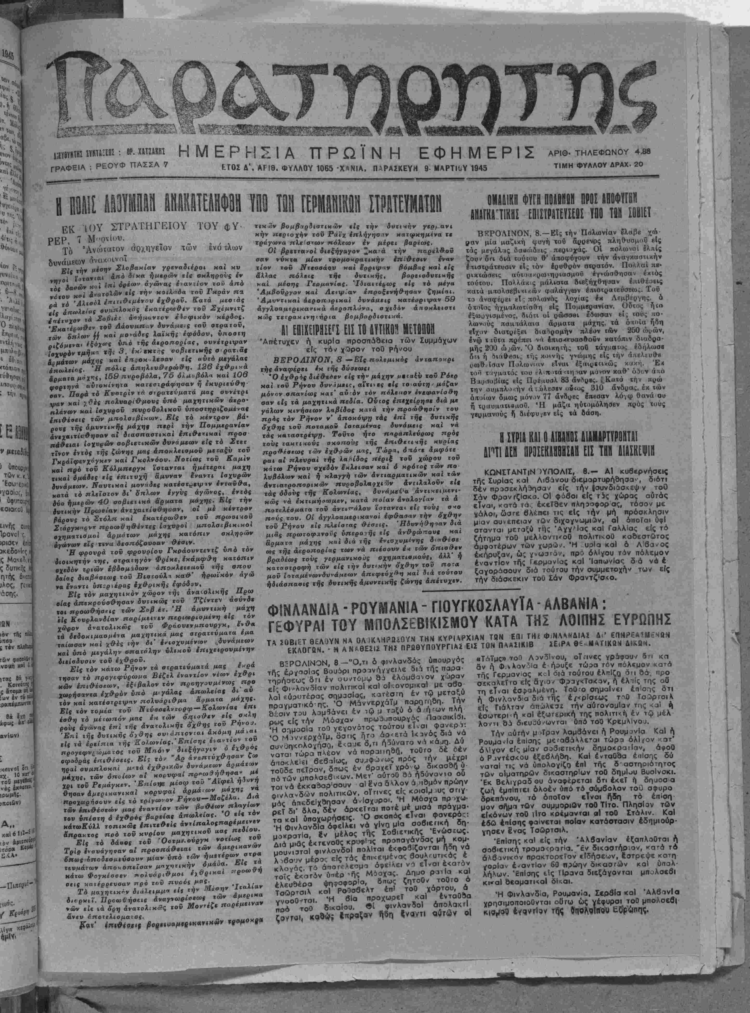 νηνοί ί'ΐιτανΐαι από <5ίκα ημερών εί« οχληρονς εν τος δαοών χ«ΐ ϊ"ϊ δρέων αγώνας έιαντίον τοΰ άπό νβτου κ"ΐ ά<ατοΧών είς την χοιληδα τοΰ Γχράν πά ρά τό 'ΔΙιοόΙ ίΐίτι&ιμίνου εχθρόν. ΒΓαΐά μεσΐάς είς απωλείας ονμηΐοκας εκατέρωθεν τοΰ Σχέμνιτζ ίηέινχον χά Σοβιετ ασήμαντον εοφιχον κέρδος. Έκατέρω&ί" τοΰ Δ,άουμπΐ-ν δυνάμεις τοϋ στραΐοϋ, το3ν δπλωΐ' ^ καΐ μθναδες λαίκηί ίφάδου, υποστή ριζόμεναι ίξόχας ΰηό τής άεροπορίας , ουνέτριψαν ίοχυρόν τμή«<5 τί;; 3, (χ* επι ής σοβιετικής α ρατ.ας ομμάτων μάχης Χα' έπ^οχ λεσαν είς πΰτό μεγάλας άηοιλείκς. 'Β πόλις άπηλεν&ιρώ&η. 126 έχ&μιχά α'ρματα μ»χ 1$, 159 ηνροβόλα, 75 όλαοβόλα χαΐ 206 φορτηνά αϋΓοκίνητα κατεοιράφησαν ή εκυριεύθη σαν. Παρά τό Κναχρΐν τη ατρατεΰματά μας οννέτρι ψαν »αϊ }/*'ί παλυαριθμους υπό μαχητικόον άερο- ηΐάναν καΐ ίοχυροΰ πυροβολικοΰ ΰποστηριζομένας έηιθέβεις των μπολσεβίκων. Είς τό κέντρον βά· ρονς τής άμνντιχής μάχης πεοΐ την ϋομμερανίαν ανεχαιτίυθηοαν αί διασπαστικαΐ έπιθεΐικαΐ προσ πάθειαι ίοχυμών οοβιετικαϊν δυνάμεων είς τό Στετ τΐνον έντός τής ζώνης μας άποκλεισμοΰ μεταξυ τοϋ ΐνραίφενχϋγκεν καΐ Γκολνόου. Νοτίοος τον Καμΐν καΐ πρό ΐοΰ Κάλμπεργχ ίστανται ήμέτεραι μαχη τικαί δμάδες είς έτειτυχή άμυναν έναντι ίσχυρων δυνάμεωκ. Ναυτικαι μονηδες κοτέσΓ^εν ·ν (νταν&α, κατά ΐό πλείστον δι' ό'πλων ενγνς αγώνος, έντός ού ο ημερών 40 σοβιετ ιχά α'ρματα μαχης. Είς την δυτικήν ΙΙρωαίαν άνεχαιτίο&ηυαν, οί με κέντρον βάρους τό Στόλπ καΐ εκατέρωθεν τοΰ ηρωοι-ιοϋ ΣτάργΗ"ρντ προω^ηθέντες ίοχνροϊ μπολοεβικικοί οχημαχιομοι άρμαχων μάχης κατόπιν αχληουην άγο>να>ν εις τίνα δεοπόζουοαν θέσιν.