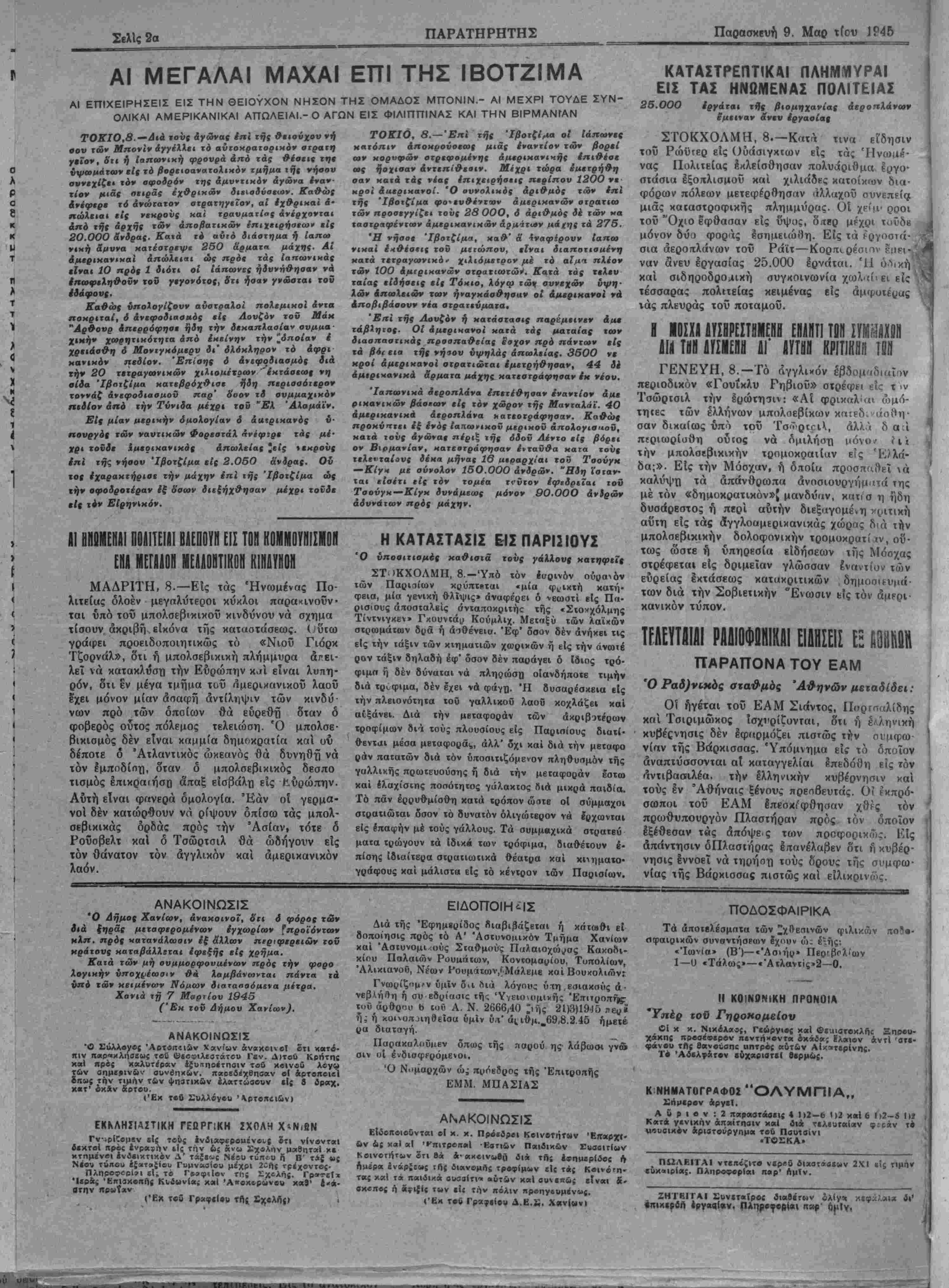 των προοεγγίζει τοΰς 2<3 ΟΟΟ, δ άριθμός δέ των «ο ταστραφέντων αμερικανικόν άρμίτονν μάζης τα 275. Ή νήοοι Ίβοτζίμα, καθ' α Ίναφίρουν ίαπω νικαΐ έ*θέσεις τοΰ μειώπου, είναι διαποτισιιένη κατά τετοαγωνικό» χιλιόμετρον μέ τό αίμα πλέον των 200 αμερικανόν στοαΐιωτών. Κατά τάς ΐελευ ΐαίας είδήσεις είς Γόχιο, λόγω των συνεχών δν"?' λαόν απώλειαι* των ηναγκάσθησαν οί αμερικανόν νά άποβιβάσονν νέα στραΐεύματα. Επι τής Αουζόν ή κατάστασις παρέμεινεν άαε τάβΐηιος. Οί άμερικανοϊ κατά τάς ματαίας των διασπαστικάς προσπαθείας εαχον πρό πάντων είς τα βόίΜΐα τής νήιου υψηλάς απωλείας. 3500 νέ κροί άμερικανοϊ στρατιώται έμετρήθησαν, 44 δέ άμιρικανικά άρματα μάχης χατιστράφησαν έκ νέον. Ίαπωνιχά άεροπλάνα επετεθησαν εναντίον άκε ρικανικών βάοεαιν είς τόν χώρον τής Αίανΐαλάί'. 40 άμερικανικά άεροπλάνα χατεοτράφησαν. Ιίαθώς προκύπτει έξ ενός ίαΐιωκικοΰ μερικοΰ άπολογισαοϋ, κατά ΐούς άγώναΐ πέριξ τής οδόν Δέντο είς βόρει όν Βιρμανίαν, κατε·τράφησαν ίνταν&α κατα τοΰε τελε·>ταίους δέκα μήνας 16 μιραρχ/αι τοΰ Το ουγκ