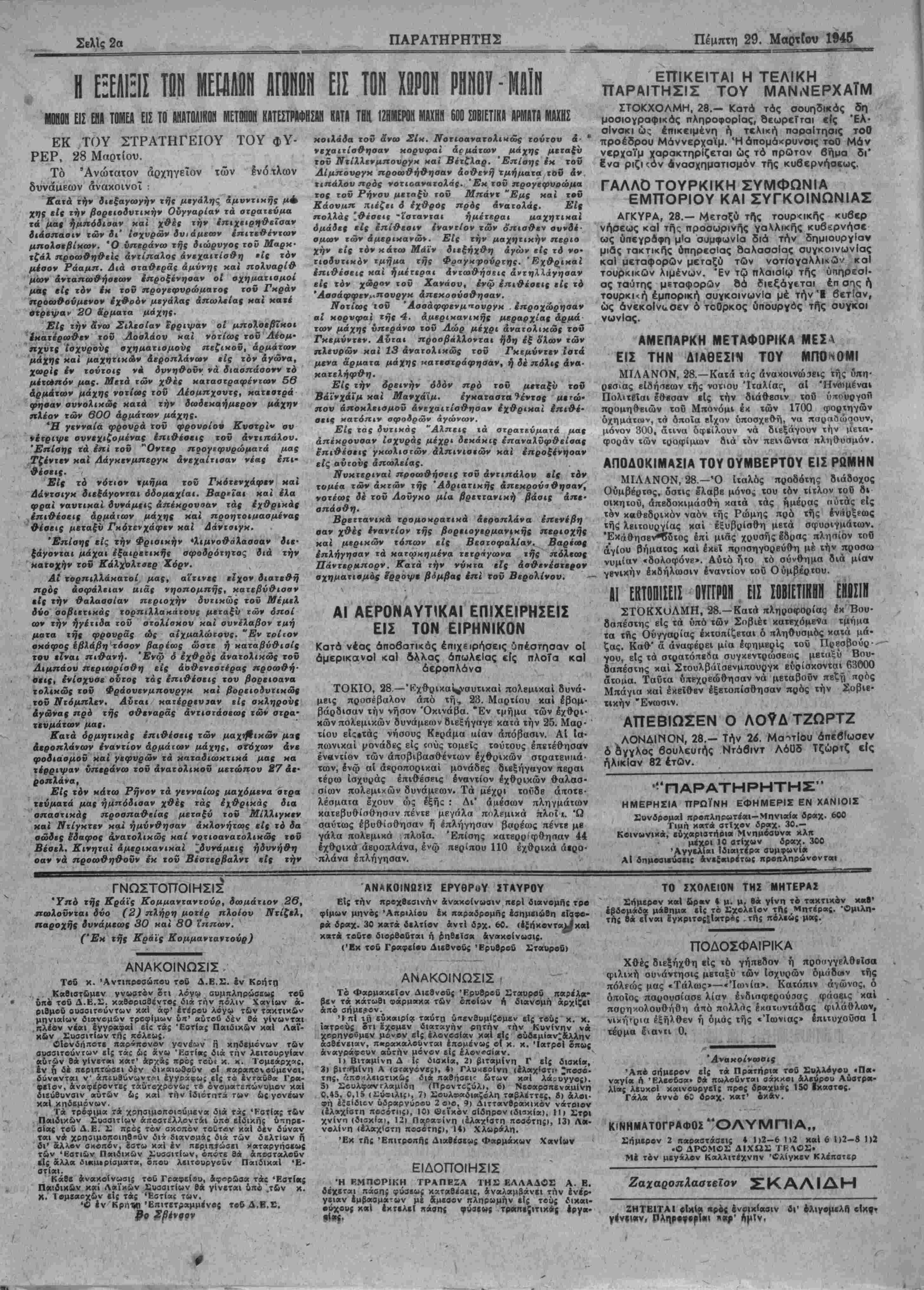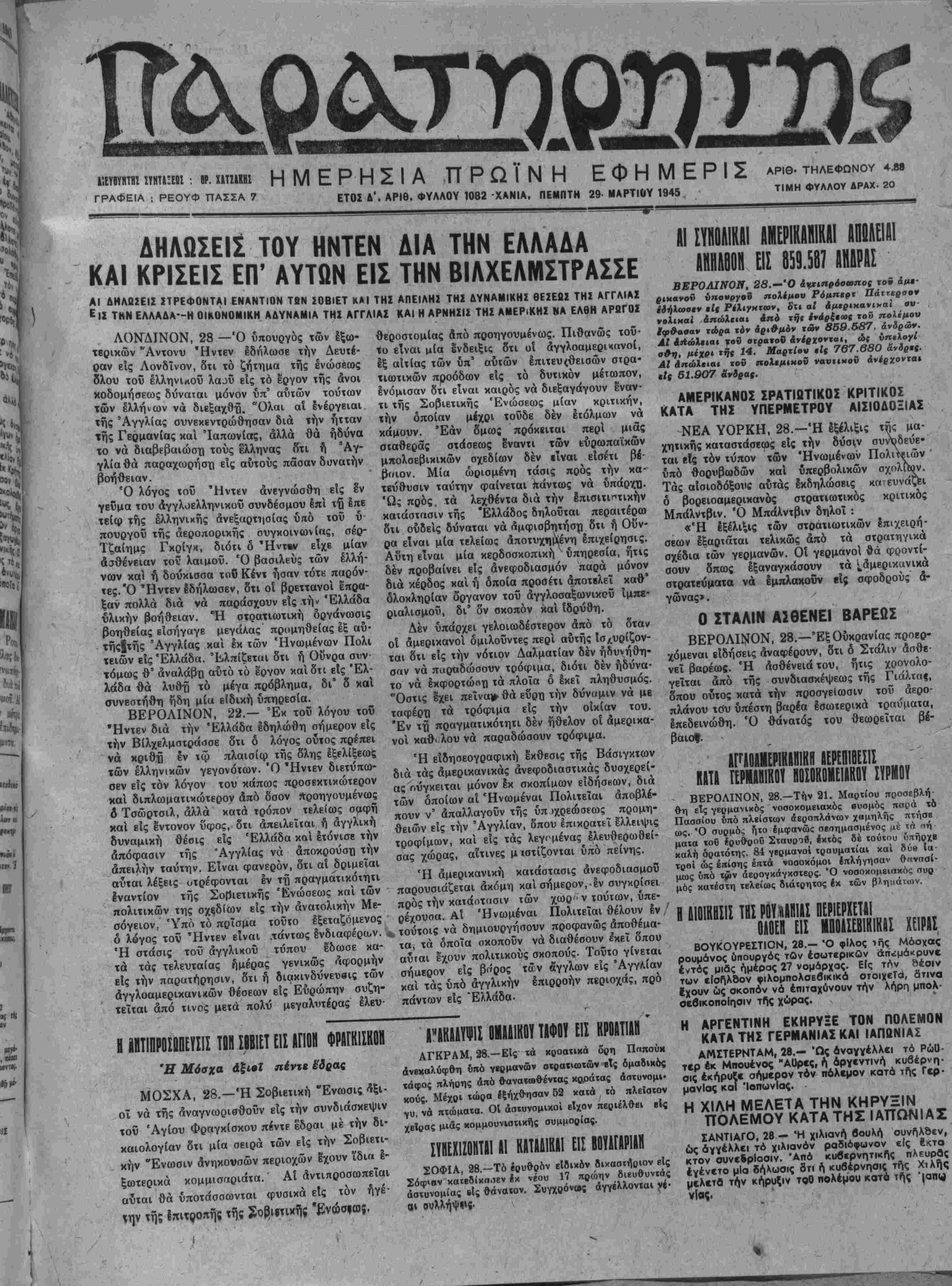 ΓΡΑΦΕΙΑ ; ΡΕΟΥΦ ΠΑΣΣΑ 7 ΕΤ0Σ Λ', Αρ,θ- φγΑΑΟγ «82 ΧΑΝΙΑ, ΠΕΜΠΤΗ 29 ΜΑΡΤΙΟΥ 1945 ΤΙΜΗ ΦΥΑΛΟΥ ΑΡΑΧ. 20