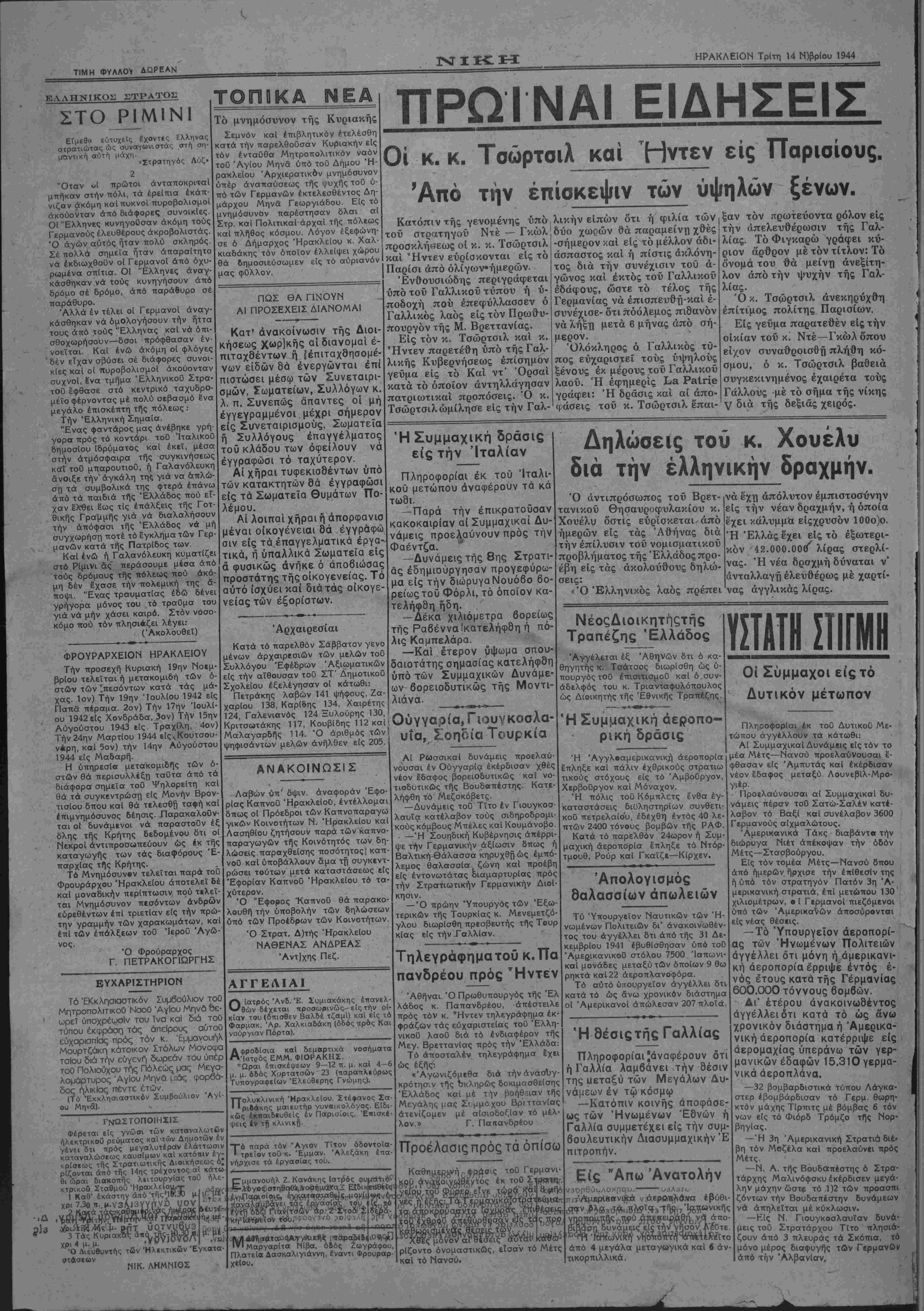 λ_ ζ£ν*...«>,'·#%ΜΜ/τη# πη<-»νΒ·«νιΊηω- Βΐλ-η ρ.ίί- τατ ήν,ηληύθΌυο δτΐλΐθ- άς εδημιούργησαν προγεφύρω- μα είς την διώρυγαΝουόβο βο- ρείωςτοϋ Φόρλι, τό οποίον κα- τελήφδη ήδη. — Δέκα χιλιόμετρα βορείως τής Ραβένναϊκατελήφδη η πό¬ λις Καμπελάρα. —Καί έτερον νψωμα σπου¬ δαιοτάτης σημασίας κατελήφθη υπό των Συμμαχικών Δυνάμε- ών βορειοδυτικώς τής Μοντι- λιάνα. σεις: ΑΝΑΚΟΙΝΩΣΙΣ Λαβών ύπ' όψιν. αναφοράν Έφο ρίας Καπνοΰ Ηρακλείου, έντέλλομαι δπως οί Πρόεδροι των Καπνοπαραγω γικών Κοινοτήτων Ν. Ηρακλείου καί Λασηθίου ζητήσουν παρά των καπνο- παραγωγών τής Κοινότητος των δη· λώσεις παραχθείσης ποσότητος! καπ νοΰ καί ύποβάλλουν δμα τή συγκεντ- ρώσει τούτων μετά καταστάσεως είς Έφορίαν Καπνοΰ Ηρακλείου τό τα χύτερον. Ό "Εφορος 'ΚαπνοΟ θά παρακο¬ λουθή την υποβολήν των δηλώσεων υπό των Προέορων των Κοινοτήτων Ό Στρατ. Δ)τής Ηρακλείου ΝΑΘΕΝΑΣ ΑΝΔΡΕΑΣ Άντ]χης Πεζ. ΑΓΓΕΛΙΑΙ ΟΙατρός Ανδ. Έ ϊυμιακάκης έπανελ θών δέχεται προσωρινώς-είς την οί κίαν τού (δπισθεν Βαλδέ τζαμί) καϊ είς τί Φαρμακ. Άρ. Χαλκιαδάκη (όδός πρός Κα νούργιαν Πόρτα). ου ΓνΩΣΤΟΠΟΙΗΣΙΣ Φέρεται είς γνώσι των καταναλωτών ήλεκτρικοθ ρεύματος καί των Δημοτών έν γένει δτι πρός μεγαλυτέραν ελάττωσιν καταναλώσεως καυσΐμων καί κατόπιν έγ- κρίσεως τής Στρατιωτικής Διοικήσεως ό; ρίζονται άπό της 14ης τρέχοντος αί κάτω θι ώραι διακοτιής λβαουργίας τού ήλε¬ κτρικοθ ΣταθμοΟ Ηρακλείου.— 1 Καθ" εκάστην άπό 'τής'Ιβ'.Λ ΧΡΐ7.3θπ..μ·ν3^3 .------- .ίζ'μ· ΡΠΤ 3 Τάς Κυριακάς α χρι 4 μ. μ. Ό Διευθυντής των Ήλΐκτικων Εγκατα- στσσεων ΝΙΚ. ΛΗΜΝΙΟΣ ΨΚ«__ιια καί δεμσρτικά νοσήματα -Ίατρός ΕΜΜ. ΦΙΟΡΑΚΗΣ. ΤΩραι έπισκέψεων 9—12 π. μ. καί 4— μ. μ. όδός Χορτατσών 23 (παραπλεύρω Τυπογραφείων Έλεόθερης Γνώμης). ΤΤολοκλινική "Ηρακλείου. Στέφανος Σα ' 'ριοάκης μαιευτήρ γυνβικολόγος. Είδι κώς έκπαιδΐυθείς έν Παρισίοις. Έπισκέ ψεις εν τη κλινικη. Τ ό παρα τόν "Αγιον Τίτον όδοντοια τρεϊον τού κ. Έμμαν. Άλεξάκη έπα νήρχισε τα εργασίας τού. μμανουήλ Ζ. Κανάκης Ιατρός Λ*ίσΐηθο({ϊϋασήμ«ίθ(2 Β Α9η(!»αΐαίίίς ΐροφίδίι^ '*' Μαργαρίτα Νίβα, όδός Ζωγράψου Πλατεία Δασκ»αλιγιάννη, Εναντι Φρουραρ χείου έβη είς τάς Ό Έλληνικός λαός πρέπει ίνα έχη απόλυτον εμπιστοσύνην είς την νέαν δραχμήν, ή όποία έχει κάλυμμ'α είςχρυσόν 100ο)ο. Ή Ελλάς εχει είς τό εξωτερι¬ κόν 42.000.00(/ λίρας στερλί- νας. Ή νέα δρσχμή δύναται ν* άνταλλαγχί έλευθέρως μέ χαρτί- νας άγγλικάς λίρας. » ~ | ] —-(—------, - - - - ,- υΐα, Σοηοία Τουρκία Αί ΡωσσικαΙ δυνάμεις προελαύ- ■ουσαι έν Ούγγαρία εκέρδισαν χθές έον εδαφος βορειοδυτικώς καί νο- ιοδυτικώς τής Βουδαπέστης. Κατε¬ λήφθη τό Μεζοκόβετς. —Δυνάμεις τοθ Τΐτο έν Γιουγκοσ¬ λαυία κατέλαβον τούς σιδηροδρομι· κούς κόμβους Μπέλες καί Κουμάνοβο. —Ή Σουηδική Κυβέρνησις απερρι¬ ψε την Γερμανικήν αξίωσιν δπως ή Βαλτική Θάλασσα κηρυχθή ώς έμπό- λεμος θαλασσία ζώνη καί προέβη είς έντονωτάτας οιαμαρτυρίας πρός την Στρατιωτικήν Γερμανικήν Διοί¬ κησιν. — Ό πρώην Ύπουργός των "Εξω¬ τερικών τής Τουρκίας κ. Μενεμετζό- γλου διωρίσθη πρεσβευτής τής Τουρ κίας είς την Γαλλίαν. ---------------------■ ι — ι . .. ■ Τηλεγράφηματοΰ κ.Πά πανδρέου πρός τΗντεν Αθήναι Ό Πρωθυπουργός τής Έλ λάδος κ. Παπανδρέου, απέστειλε ΝέοςΔιοικητήςτής Τραπέζης Ελλάδος Αγγέλεται έξ "Αθηνών δτι ό κα- θηγητής κ. Τσάτσος διωρίσθη ώς ύ- πουργός τοΰ έπισιτισμοΰ καί ό συν- αδελφάς τού κ. Τριανταφυλόπουλος ώς Διοικητής τής Έθνικής Τραπέζης. Ή Συμμαχικη άεροπο- ρική δράσις Ή Άγγλοαμερικανική άεροπορία έπληξε καί πάλιν έχθρ