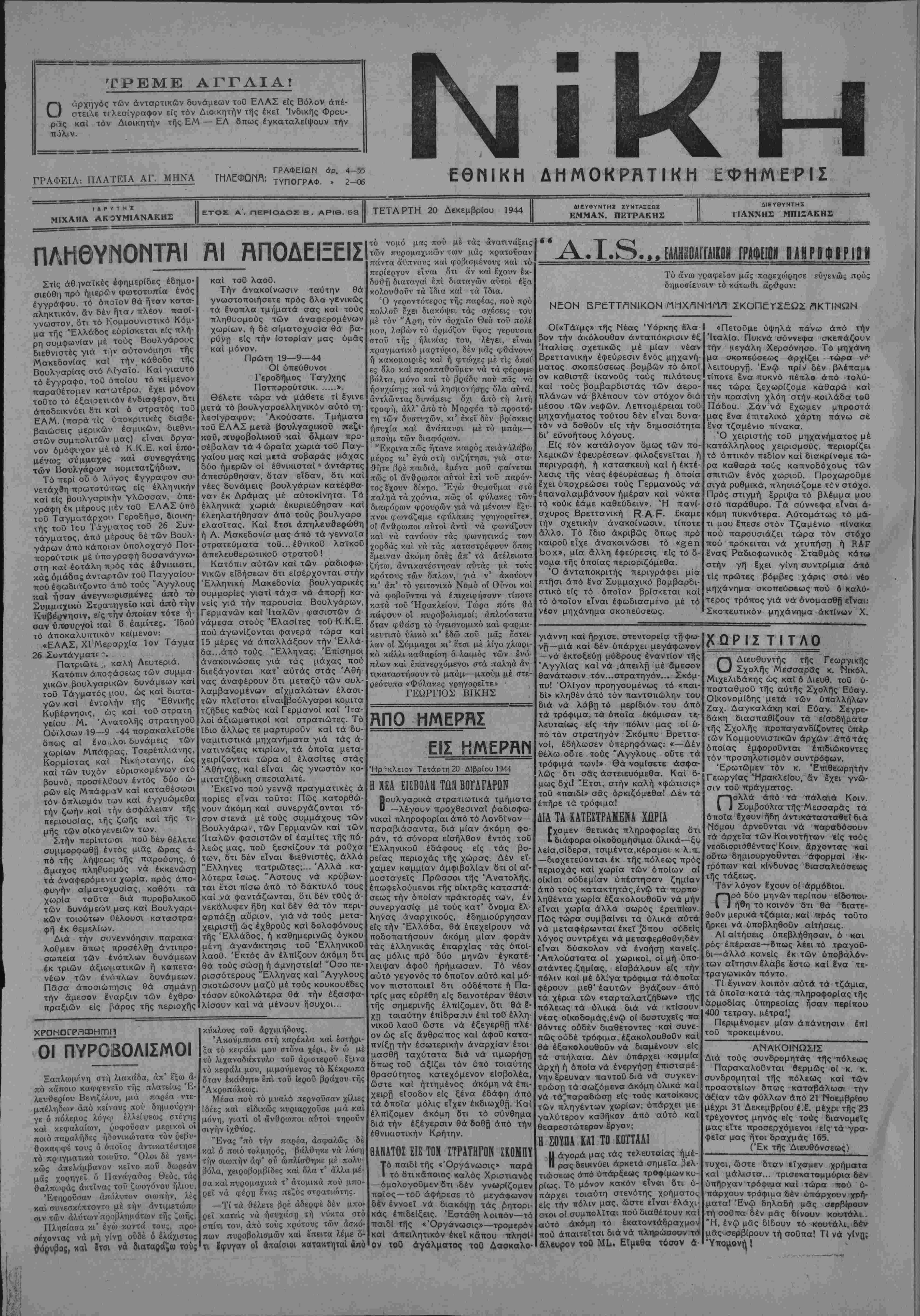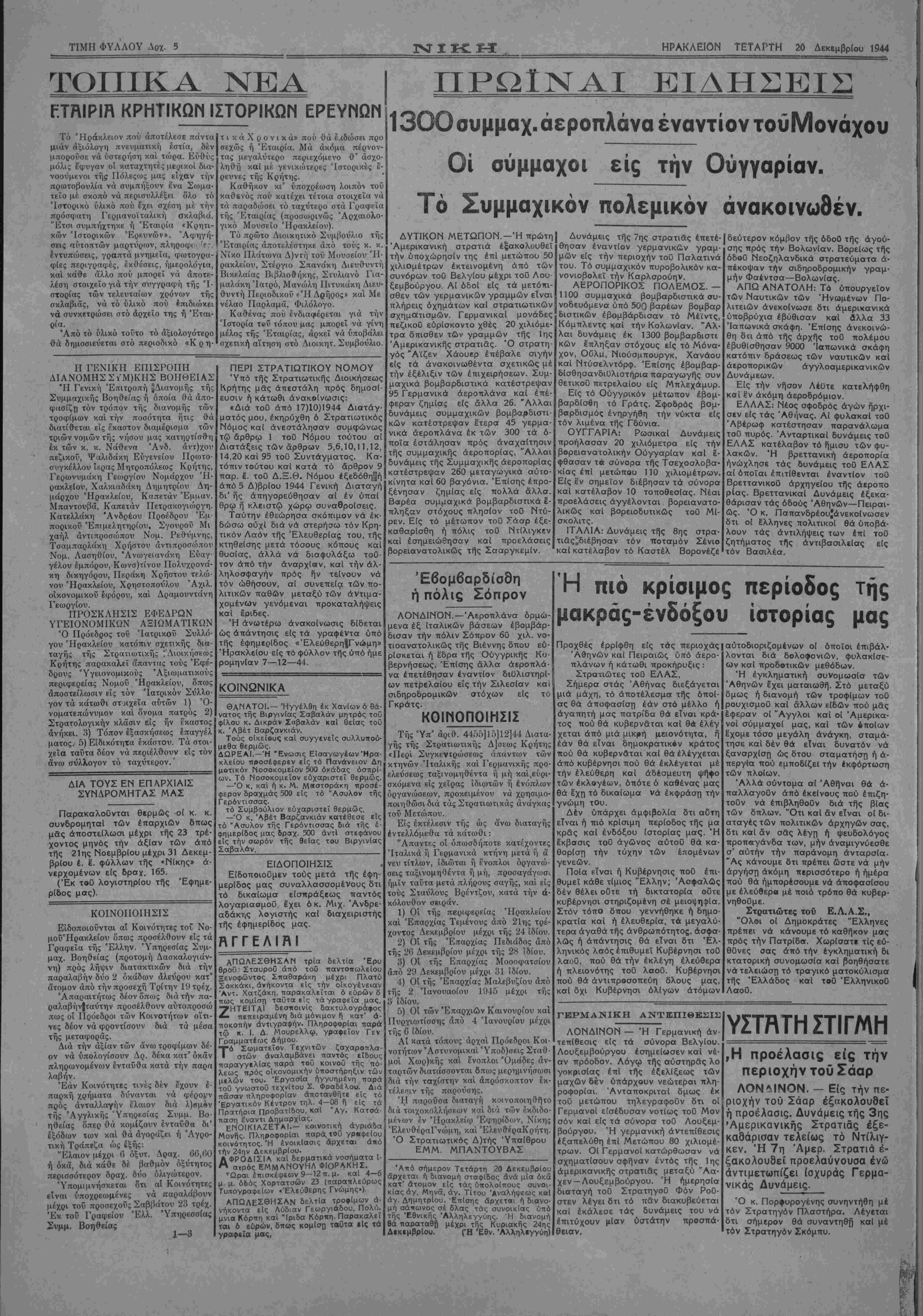 ΤΕΤΑΡΤΗ 20 Δεκεμβριού 1944