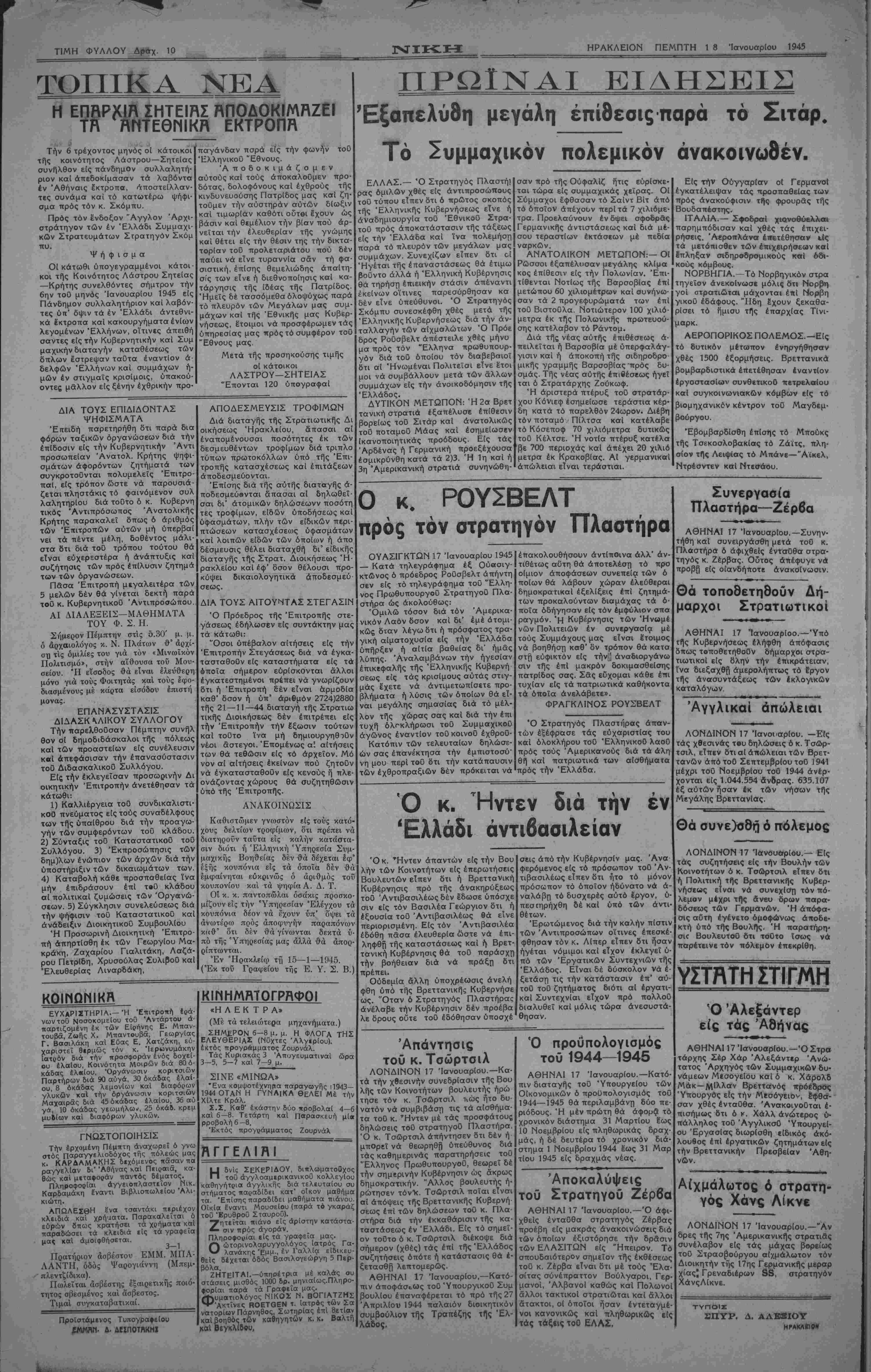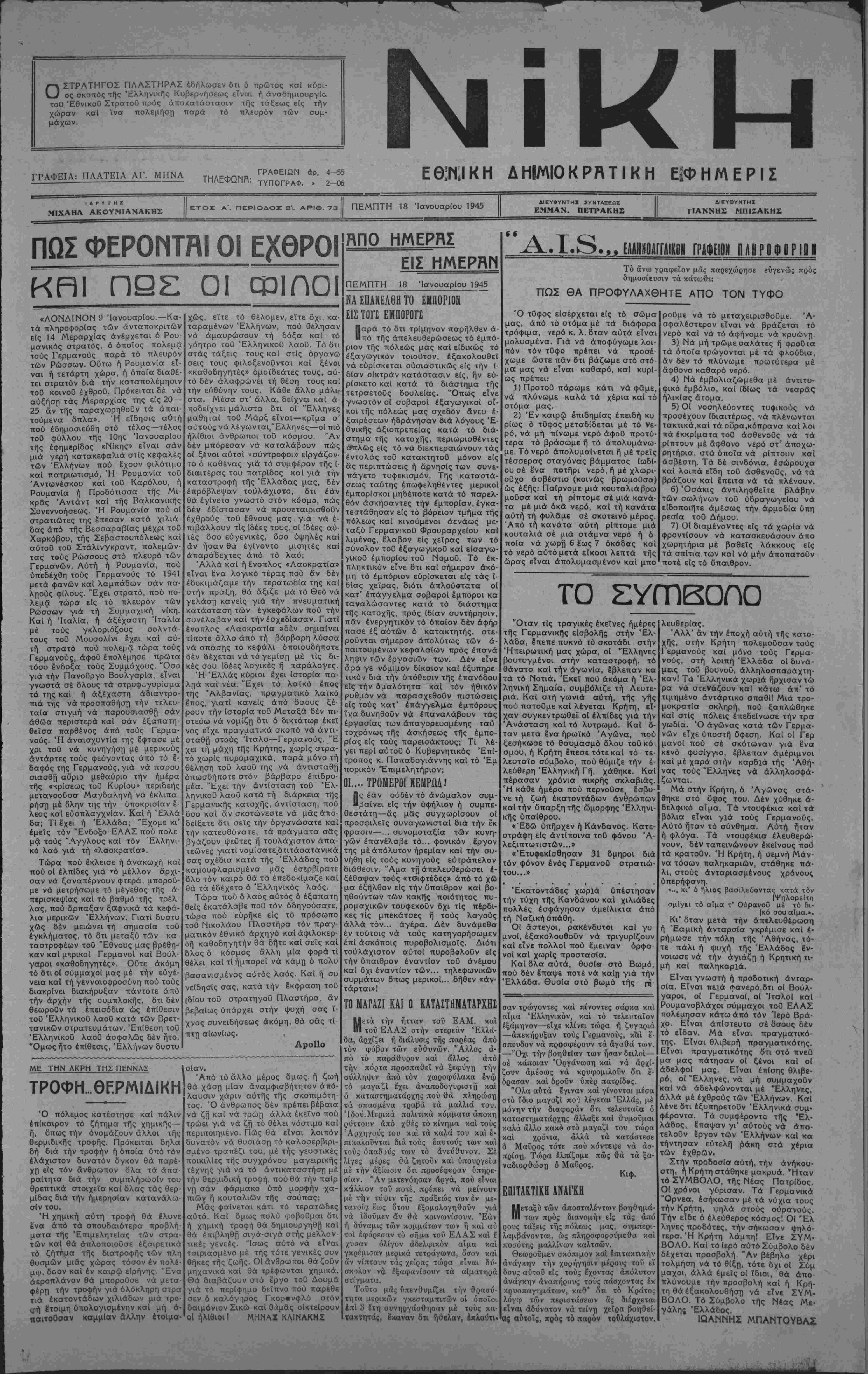 τοθ ΈθνικοΟ ΣτρατοΟ πρός άπο<ατάστασιν τής τάξεως είς την χώραν καί ίνα πολεμήση πσρά τό πλευρόν των συμ- μάχων. ΓΡΑΦΕΙΑ: ΠΛΑΤΕΙΑ ΑΓ. ΜΗΝΑ ΓΡΑΦΕΙΩΝ άρ. 4—55 ΤΗΛΕΦΩΠΜ: ΤΥΠογραφ. » 2-06 ΕΘΚΙΚΗ ΔΗΙΜΙΟΚΡΛΤΙΚΗ ΕΦΗΜΕΡΙΣ Ι Δ Ρ Υ Τ Η Σ ΜΙΧΑΗΛ ΑΚΟΥΜΙΑΝΑΚΗΣ ΕΤΟΣ Α'. ΠΕΡΙΟΔΟΝ Β ΑΡΙΘ. 73 ΠΕΜΠΤΗ 18 Ίσνουαρίου 1945 ΔΙΕΥβΥΝΤΗΧ ΙΥΝΤΑΕΕΟΙ ΕΜΜΑΝ. ΠΕΤΡΑΚΗΣ ΑΙΕΥΘΥΝΤΗΧ ΓΙΑΝΝΗΣ ΜΠΙΖΑΚΗΣ ΠΩΣ ΦΕΡΟΜΤΗΙ ΟΙ Ε}(ΘΡΟΙ ΚΡ1Ι ΠΒΣ ΟΙ ΟθΙίΊΟΙ «ΛΟΝΔΙΝΟΝ 9 Ίανουαρίου.— Κα- τα πληροφορίας των ανταποκριτήν είς 14 ΜερσρχΙας άνέρχετσι ό Ρου- μανικός στρατός, ό οποίος πολεμδ τούς Γερμανούς παρά τό πλευρόν των Ρώσσων. Ούτω ή Ρουμανία εί¬ ναι ή τετάρτη χώρα, ή όποία διαθέ- τει στρατόν διά την καταπολέμησιν τοθ κοινοϋ έχθροϋ. Πρόκειται δέ νά αυξήση τάς Μεραρχίας της είς 20— 25 αντής παραχωρηθούν τα άπαι- τούμενα δπλα». Η είδησις αυτή πού εδημοσιεύθη στό τέλος— τέλος τοθ φύλλου τής 10ης Ίανουαρίου τής έφημβρίδος «Νίκης» είναι σάν μιά γερή κατακεφαλιά στΐς κεφαλές των Έλλήνων ποΰ έχουν φιλότιμο καί πατριωτισμό, Ή Ρουμανία τοθ Άντωνέσκου καί τοϋ Καρόλου, ή Ρουμανία ή Προδότισσα τής Μι¬ κράς Άντάντ καί τής Βαλκανικής Συνεννοήσεως. Ή Ρουμανία πού οί στρατιωτες της επεσαν κστά χιλιά¬ δας άπό τής Βεσσαραβίας μέχρι τοΰ Χαρκόβου, της Σεβαστουπόλεως καί αυτού τοθ Στάλινγκραντ, πολεμών- τας τούς Ρώσσους στό πλευρό των Γερμανών. Αυτή ή Ρουμανία, πού ύπεδέχθη τούς Γερμανούς τό 1941 μετά φανών καί λαμπάδων σάν πα- ληούς φΐλους. "Εχει στρατό, πού πο¬ λεμδ τώρα είς τό πλευρόν των Ρώσσων γιά τή Συμμαχική νίκη. Καί ή Ιταλία, ή άξέχαστη Ιταλία μέ τούς γκλοριόζους σολντά- τους τοϋ Μουσολίνι έ'χει καί αυ¬ τή στρατό ποΰ πολεμα τώρα τούς Γερμανούς, άφοθ έπολέμησε πρώτα τόσο ε'νδοξα τούς Συμμάχους. Όσο γιά την Πανοϋργο Βουλγαρία, είναι γνωστά σέ δλους τα στρυφ^γυρίσμα τα της καί ή άξέχαστη άδιαντρο- πιά της νά προσπαθήση, την τελευ¬ ταία στιγμή νά παρουσιασθή σάν άθώα περιστερά καί σάν έξαπατη θεΐσα παρθένος άπό τούς Γερμα¬ νούς. Ή άναισχυντία της Ιφτασε μέ χρι τοθ νά κυνηγήση μέ μερικούς άντάρτες τούς φεύγοντας άπό τό ε- δαφός της Γερμανούς, γιά νά παρου σιασθή αυριο μεθαύριο την ήμέρα τής «κρίσεως τοΰ Κυρίου» περιδεής μετανοοθσσ Μαγδαληνή νά έκλιπα ρήση μέ όλην της την ύποκρισΐαν έ· λεος καί εύσπλαγχνίαν. Καί ή Έλλά δα; Τί έ"χει ή Έλλάδα; "Εχομε κι' εμείς τόν Ένδοξο ΕΛΑΣ πού πολε μδ τούς "Αγγλους καί τόν Έλληνι- κό λαό γιά τή «λαοκρατία». Τώρα πού έκλεισε ή άνακωχή καΐ πού οί έλπίδες γιά ^5 μέλλον άρχι- σαν νά ξσναπέρνουν φτερά, μποροϋ- με νά μετρήσωμε τό μέγεθος της ά- περισκεψίας καί τό βαθμό τής τρέλ λας, πού αρπαξαν ξαφνικά τα κεφά- λια μερικων Έλλήνων. Γιατί δυστυ χως δέν μειώνει τή σημασία τοθ έγκλήματος, τό δτι μεταξύ των κα ταστροφέων τοθ 'Έθνους μας βρέθη¬ καν καί μςρικοί ΓερμανοΙ καί Βούλ· γαροι «καθοδηγητές». Οϋτε άκόμη τό δτι οί σΰμμαχοί μας μέ την εύγε- νεια καί τή γενναιοφροσύνη πού τούς διακρίνει διακήρυξαν πάντοτε άπό την αρχήν τής ουμπλοκής, δτι δέν θεωροθν τα έπεισόδια ώς επίθεσιν τοϋ ΈλληνικοΟ λαοθ κατά των Βρετ- τανικών στρατευμάτων. Έπίθεση τοθ ΈλληνικοΟ λαοθ ασφαλώς δέν ήτο. Όμωςήτο επίθεσις, Έλλήνων δυστυ ΜΕ ΤΗΝ ΑΚΡΗ ΤΗΣ ΠΕΝΝΑΣ ΤΡΟΦΗ...ΘΡ.ΡΜΙΔ1ΚΗ Ό πόλεμος κατέστησε καί πάλιν επίκαιρον τό ζήτημα τής χημικάς— ή, δπως την όνομάζουν άλλοι τής θερμιδικής τροφής. Πρόκειται δηλα δή διά την τροφήν ή όποία υπό τόν ελάχιστον δυνατόν όγκον θά παρέ¬ χη, είς τόν άνθρωπον δλα τα άπα· ραΐτητα διά την συμπλήρωσιν τού θρεπτικά σ