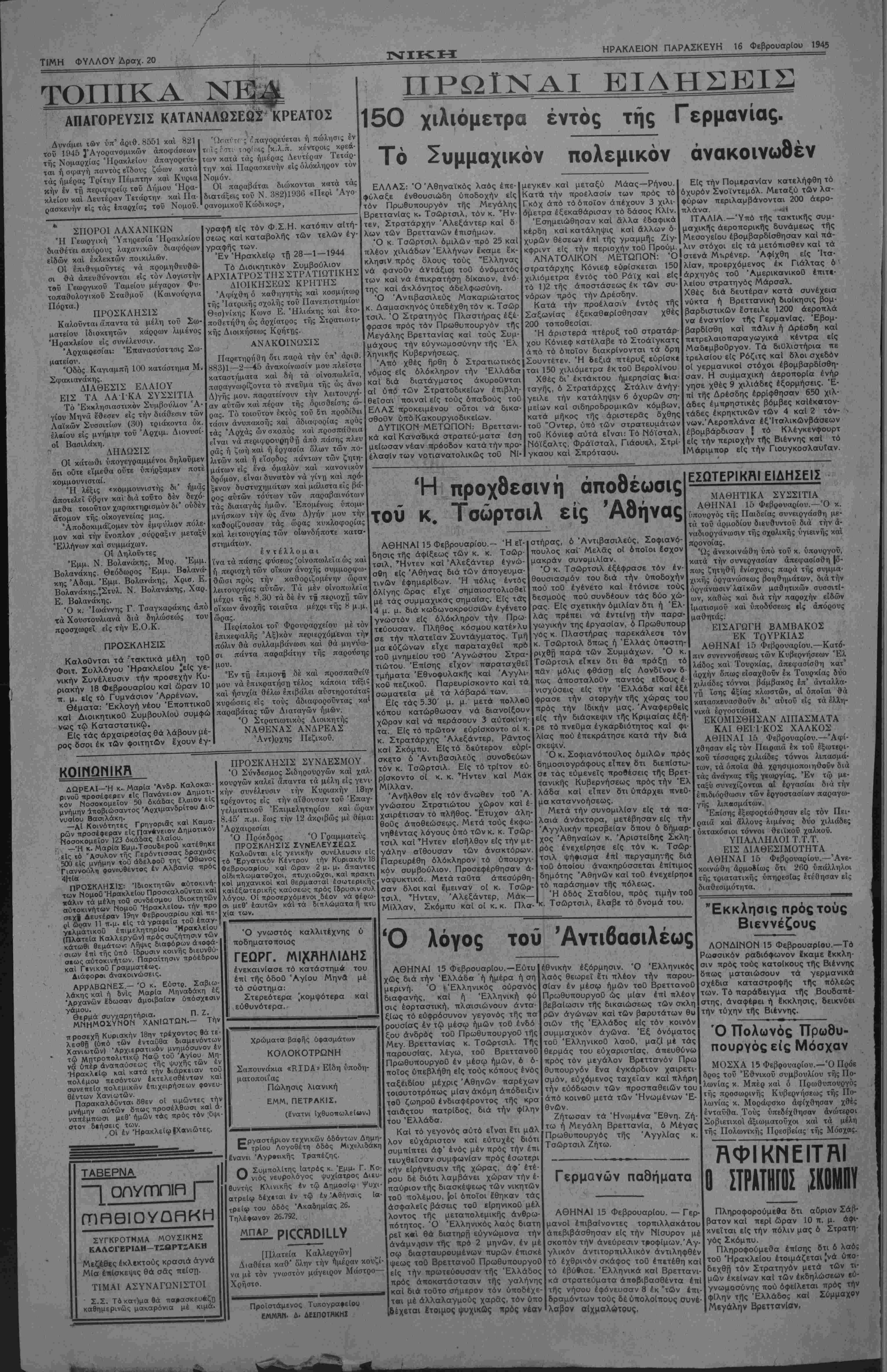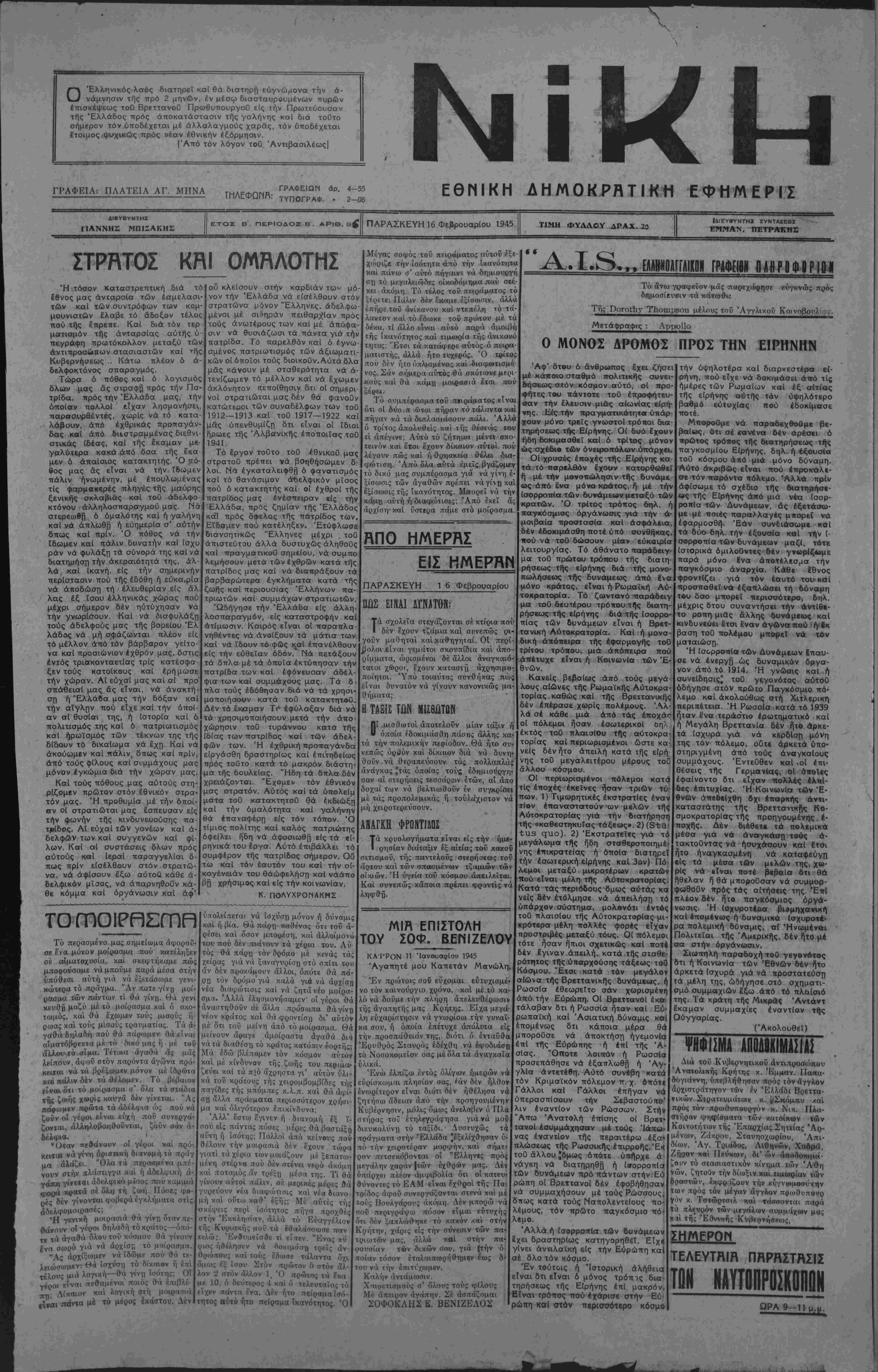 ΠΑΡΑΣΚΕΥΗ 16 ΦεβρουαρΙου 1945 ΤΙΜΗ ΦΥΛΛΟΥ ΔΡΑΧ. 2ο