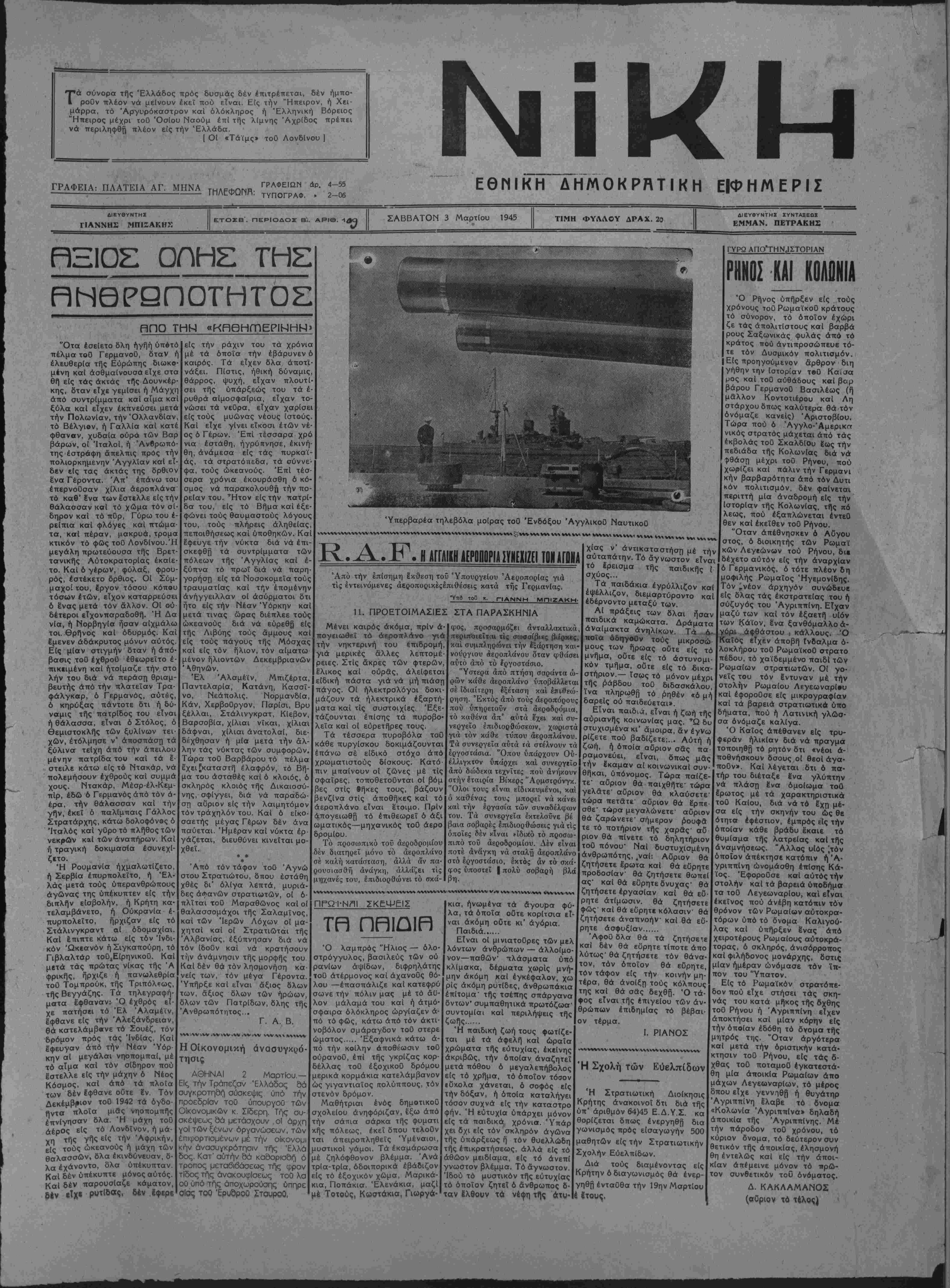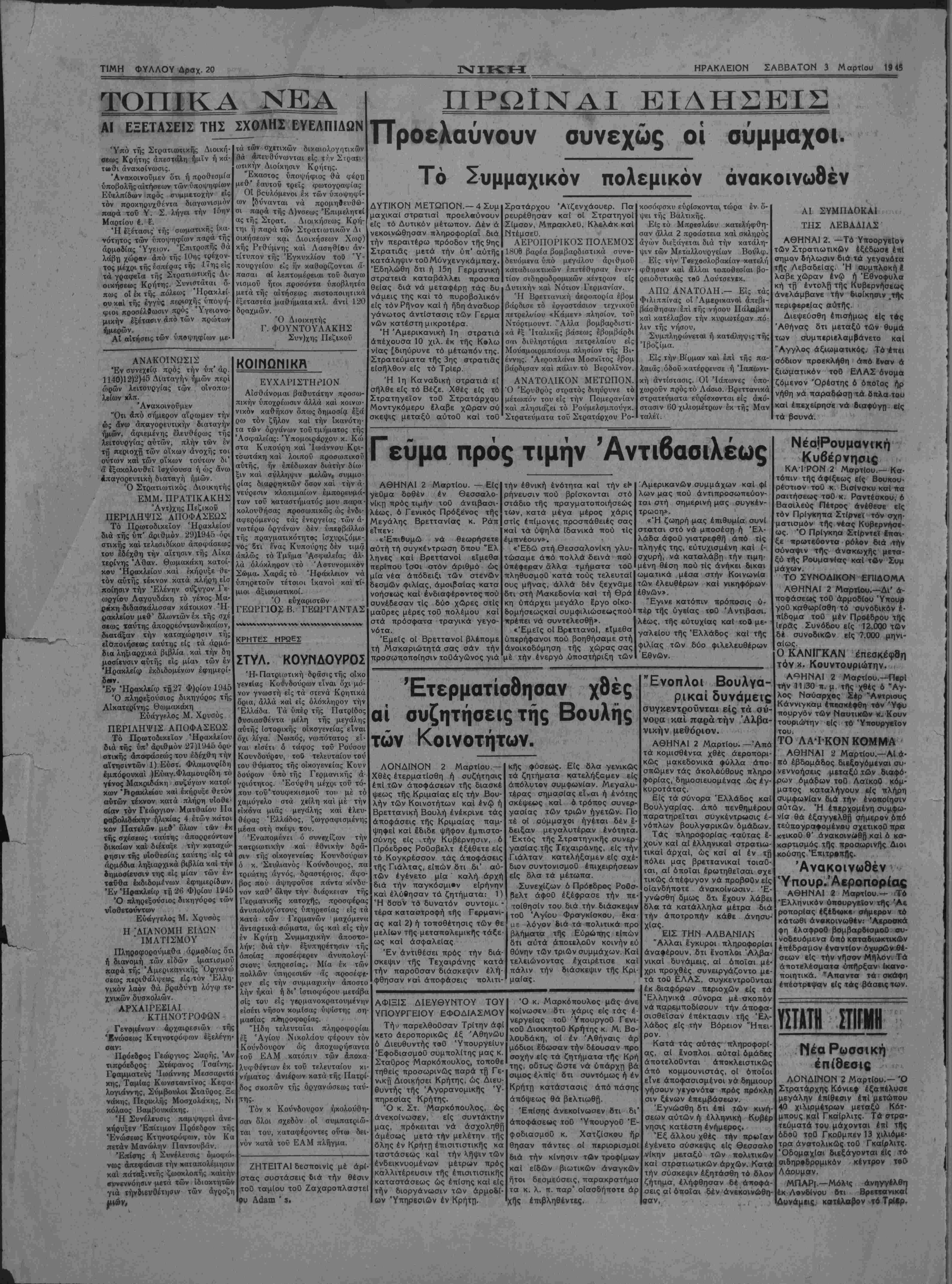 , Γενομένων αρχαιρεσιών τή< Ενώσεως Κτηνοτρόφων εξελέγη «αν: Πρόεδοος Γεώργιος Σαρής, Άν τιπρόεδρος Στέφανος Τσαΐνης. Γραμματεύς Ιωάννης Μεσσαριτά κης, Ταμίας Κωνσταντίνος Κεφα- λογιάννης, Σύμβουλοι Σταύρος Ξε νάκης, Περικλής Μοσχολάκης, Νι κόλαος Βαμβουκάκης. "Η Συνέλευσις παμψηφεί άνε- κήρυξεν Επίτιμον Πρόεδρον τής Ενώσεως Κτηνοτρόφων, τόν Κα πετάν Μανώλην Παντουβάν. Έπίσης ή Συνέλευσις ομοφώ¬ νως απεφάσισε την καταπολέμησιν καί πάταξιντής ζωοκλοπής καίτήν συνεννόησιν μετά των ϊδιοκτητών γιά τήνδΐενθέτΐ|σιν των άγροζη ΚΟΙΝΩΝΙΚΑΙ ΕΥΧΑΡΙΣΤΗΡΙΟΝ Αίσθάνομαι βαθυτάτην προσω¬ πικήν υποχρέωσιν άλλά καί κοινω¬ νικόν καθήκον όπως δημοσία έξά ρω τόν ζήλον καί την ίκανότη· τα των όργάνων τού τμήματος τής Ασφαλείας: Ύπομοιράρχου κ. Κώ στα Κυπούρη καί Ιωάννου Κρι¬ τσωτάκη καί λοιπού προσωπικού αυτής, ήν επέδωκαν διάτήν δίω ξιν καί σύλληψιν μελών, συμμο- ρίας διαρρηκτών όσον καί την α¬ νεύρεσιν κλοπιμαίων έμπορευμά- των τού καταστήματός μου παρα· κολουθήσας προσωπικώς ώς ένδι- αφερόμενος τάς ενεργείας των α¬ νωτέρω όργάνων δέν ύπερβάλλω τής πραγματικότητος ίσχυριζόμε- νος δτι έ'νας Κυποΰρης δέν τιμφ απλώς τό Τμήμα Ασφαλείας άλ¬ λά ολόκληρον τό Αστυνομικόν Σώμα. Χαράς τό Ηράκλειον νά ύπηρετοϋν τέτοιοι ίκανοί καί τί- μιοι άξιωματικοί. Ό ευχαριστών ΓΕΩΡΓΙΟΣ Β. ΓΕΩΡΓΑΝΤΑΣ <ΡΗΤΕΣ ΗΡΩΕΣ ΠΡΩΪΝΑΙ ΕΙΔΗΣΕΙΣ ΤΤροελαύνουν συνεχώς οί σύμμαχοι. Συμμαχικόν πολεμικόν ανακοινωθέν ΔΥΤΙΚΟΝ ΜΕΤΩΠΟΝ.—4 Συμ μαχικαί στρατιαΐ προελβύνουν είς τό Δυτικόν μέτωπον. Δέν ά νεκοινώθησαν πληροφορίαι διά την περαιτέρω προοδον τής 9ης Στρατιάς μετά την ύπ' αυτής κατάληψιν τοΟΜΰνχενγκάμπαχ. Εδηλώθη δτι ή 15η Γερμανική στρατειά καταβάλλει προσπα θείας διά νά μεταφέρη τάς δυ νάμεις της καί τό πυροβολικόν είς τόν Ρήνον καί ή ήδη άναδιορ γάνωτος άντίστασις των Γερμα νών κατέστη μικροτέρα. Ή Άμερικανική 1η στρατιά απέχουσα 10 χιλ. έκ τής Κολω νίας Εδιηΰρυνε τό μέτωπον της. Στρατεύματα τής 3ης στρατιάς εισήλθον είς τό ΤρΙερ. Ή 1η Καναδική στρατιά εί σήλθε είς τό Βέζε. Χθές είς τό Στρατηγεΐον τοθ Στρατάρχου Μοντγκόμερυ έ'λαβε χώραν ου σκέψις μεταξύ αϋτοΰ καί τοϋ Σρατάρχου Άϊζενχάουερ. Πά ρευρέθησσν κσΐ οί ΣτρατηγοΙ Σίμσον, Μπρακλεϋ, Κλελάκ κσί Ντέμσεϋ. ΑΕΡΟΠΟΡΙΚΟΣ ΠΟΛΕΜΟΣ 180Θ βαρέα βομβαρδιστικά συνθ- δευόμενα υπό μεγάλου άριθμοΰ καταδιωκτικών επετεθησαν εναν¬ τίον σιδηροδρομικώς κέντρων είς Δυτικήν καί Νότιον Γερμανίαν. Ή Βρεττανική άεροπορία έβομ βάρδισε τό εργοστάσιον τεχνικοΰ πετρελι/ίου «Κάμεν» πλησίον, τού Ντόρτμουντ. "Αλλα βομβαρδιστι¬ κά έξ Ίταλικής βάσεως έβομβάρδι σαν διύληστήρια πετρελαίου είς Μούσμοιρμπάουμ πλησίον τής Βι¬ έννης. Άεροπλάνα Μοσκΐτος έβομ βάρδισαν καί πάλιν τό Βερολίνον. ΑΝΑΤΟΑΙΚΟΝ ΜΕΤΩΠΟΝ. Ό Έρυθρός στρατός διηύρυνε τό μέτωπον τού είς την Πομερανίαν καί πλησιάζει τό Ρούμελσμπούγκ. Στρατεύματα τού Στρατάρχου Ρο- κοσόφσκυ ευρίσκονται, τώρα έν ό¬ ψει τής Βαλτικής. Είς τό Μπρεσλάου κατελήφθη- σαν άλλα 2 προάστεια καί σκληρος αγών διεξάγεται διά την κατάλη¬ ψιν των Μεταλλουργείων Βονλφ. Είς την Τβεχοσλοβακίαν κατελή φθησαν καί άλλαι τοποθεσίαι βο- ρειοδυτικώς τβθ Λούτσενεκ. ΑΠΩ ΑΝΑΤΟΛΗ.— Είς τάς Φιλιππίνας οί Άμερικανοί απεβι¬ βάσθησαν επί τής νήσου Πάλαβαν καί κατέλαβον την κυριώτερον πό¬ λιν τής νήσου. Συμπληρώνεται ή κατάληψις τής Ίβοζίμα. Είς την Βίρμαν καί επί τής πα¬ λαιάς όδοΰ κατέρρευσε ή Ίαπωνι- κή άντίστασις. Οί Ίάπωνες υπο- χωροΰν πρ