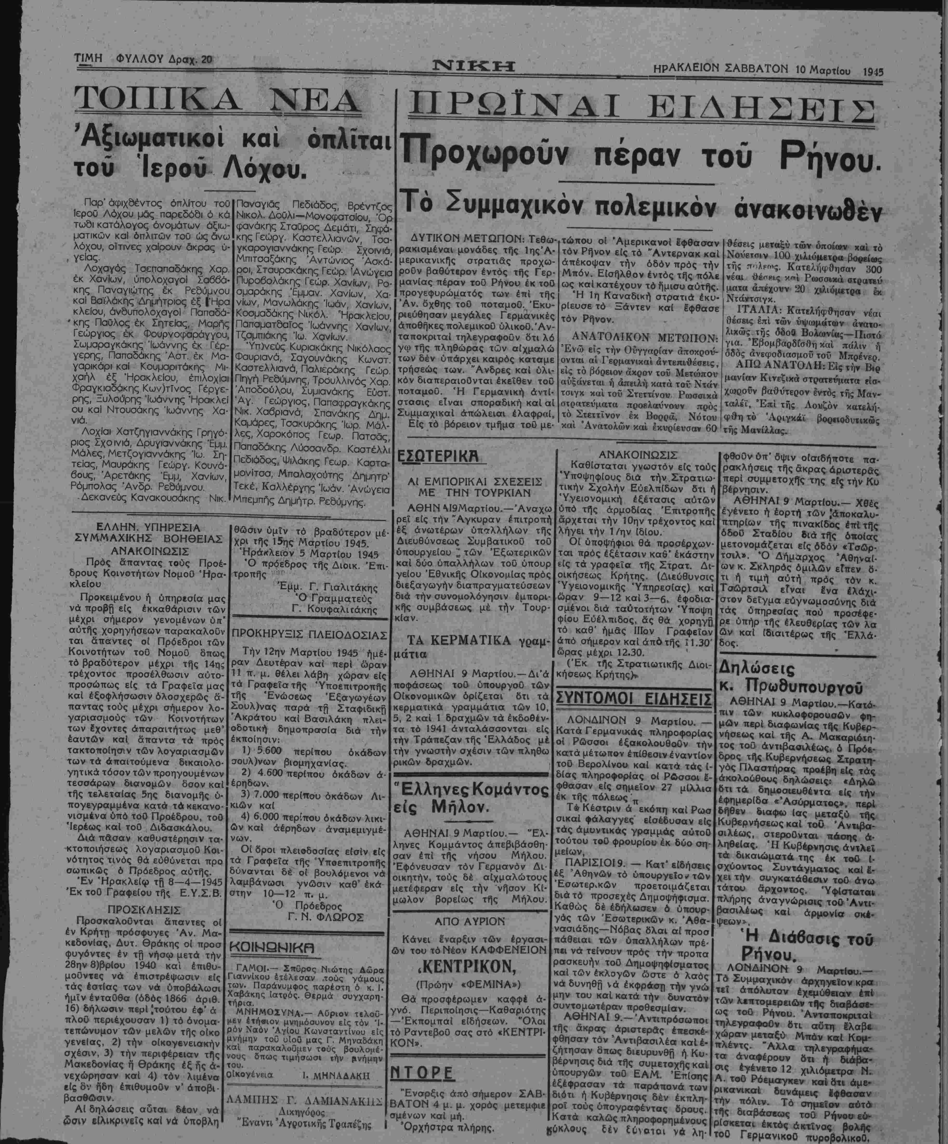 νέαι θέπης κ<η Ρωσσικά στοα—ύ- ματα άπέχουν 20 χιλιόμετρα έκ Ντάγτσιγκ. ΙΤΑΛΙΑ: Κατελήφθησαν νέαι θέσεις επί των ύψωμάτων ανατο¬ λικώς τής οδοΟ Βολωνίας—Πιοτό, για. Έβομβαρδίσθη καί πάλιν ή όδός άνεφοδιασμοϋ τού Μπρένεο ΑΠΩ ΑΝΑΤΟΛΗ: Είς την Βιρ μανίαν Κινεζιχά στρατβνματα εισ- χωρούν βαθύτερον έντός τής Μαν- ταλίϊ, Επί τής Λουζόν κατελή¬ φθη τό Άριγκάϊ βοο«οδυτικώς τής Μανίλλας. ΕΣΩΤΕΡΙΚΑ ΕΛΛΗΝ. ΥΠΗΡΕΣ1Α ΣΥΜΜΑΧΙΚΗΣ ΒΟΗΘΕΙΑΣ ΑΝΑΚΟΙΝΩΣΙΣ Πρός άπαντας τούς Προέ- δρους Κοινοτήτων ΝομοΟ Ηρα¬ κλείου Προκειμένου ή ύπηρισία μας νά προβή είς εκκαθάρισιν των μέχρι σήμερον γενομένων ύπ' αυτής χορηγήσεων παρακαλοθν ται άπαντες οί Πρόεδροι των Κοινοτήτων τοθ ΝομοΟ δπως τό βραδύτερον μέχρι τής 14ης τρέχοντοο προσέλθωσιν αυτο¬ προσώπως είς τα Γραφεϊσ μας καί έξοφλήσωσιν όλοσχερώς ά¬ παντας τούς μέχρι σήμερον λο- γαριασμούς των Κοινοτήτων των έχοντες απαραιτήτως μεθ' έαυτών καί άπαντα τα πρός τακτοποΐησιν των λογαριασμόν των τα άπαιτούμενα δικαιολο- γητικά τόσον των προηγούμενον τεσσάρων διανομων δσον καί τής τελεταίας 5ης διανομής ύ πογεγραμμένα κατά τα κεκανο νισμβνα υπό τοθ Προέδρου, τοθ €Ιερέως καί τοθ Διδασκάλου. Διά πάσαν καθυστέρησιν τα •κτοποιήσεως λογαριασμοθ Κοι νότητος τινός θά εύθύνεται προ σωπικώς 6 ΓΤρόεδρος αυτής. Έν ΉρακλεΙφ τή 8—4—1945 Έκ τοθ ΓραφεΙου τής Ε.Υ.Σ.Β. ΠΡΟΣΚΛΗΣΙΣ Προσκαλοθνται άπαντες οί έν Κρήττ) πρόσφυγες Άν. Μα- κίδονίας, Δυτ. Θράκης οί προσ φυγόντες έν τή νήσφ μετά την 28ην 8)βρ(ου 1940 καί επιθυ¬ μούντες νά έπιστρέψωσιν είς τάς έστίας των νά υποβάλωσι ημίν ένταθθα (όδός 1866 αριθ. 16) δήλωσιν περί Ιτούτου έφ' ά πλοθ περιέχουσαν 1) τό ονομα¬ τεπώνυμον των μελών τής ο(κο γενεΐας, 2) την οικογενειακήν σχέσιν, 3) την περιφέρειαν τής Μακεδονίας ή Θράκης έξ ής α¬ νεχώρησαν καί 4) τόν λιμένα είς δν ήδη έπιθυμοθν ν" άποβι- βασθωσιν. Αί δηλώσεις αυται δέον νά ώσιν είλικρινεϊς καί νά ύποβλη θώσιν υμίν τό βραδύτερον μέ χρι της 15ης Μαρτίου 1945. Ηράκλειον 5 Μαρτίου 1945 Ό πρόεδρος τής Διοικ. Έπι- τροπής Έμμ. Γ. Γιαλιτάκης Ό Γραμματεύς Γ. Κουφαλιτάκης ΠΡΟΚΗΡΥΞΙΣ ΠΛΕΙΟΔΟΣΙΑΣ Την 12ην Μαρτίου 1945 ημέ¬ ραν Δευτέραν καί περί ώραν 11 π. μ. θέλει λάβη χώραν είς τα Γραφεΐα της Ύποεπιτροπης της Ενώσεως 'Εξαγωγέων Σουλ)νας παρά τή Σταφιδική Άκρατου καί Βασιλάκη πλει- οδοτική δημοπρσσία διά την εκποίησιν: 1) 5.60Ό περίπου οκάδων ςτουλ)νων βιομηχανίας. 2) 4 600 περίπου οκάδων ά· έρηδων. 3) 7.000 περίπου οκάδων Λι- κιών καί 4) 6.000 περίπου οκάδων λικι- ών καί άέρηδων άναμεμιγμέ- νων. Οί δροι πλειοδοσίας είσίν είς τα Γραφεΐα της Ύποεπιτροπης δύνανται δέ οί βουλόμενοι νά λαμβάνωσι γνώσιν καθ" έκά στην 10—12 π. μ. Ό Πρόεδρος Γ. Ν. ΦΛΩΡΟΣ Αί ΕΜΠΟΡ1ΚΑΙ ΣΧΕΣΕΙΣ ΜΕ ΤΗΝ ΤΟΥΡΚΙΑΝ ΑΘΗΝ Μ9Μαρτ(ου.—Άναχω ρεϊ είς την "Αγκυραν ίπιτροπή έξ ανωτέρων ύπαλλήλων τής Διευθύνσεως Συμβατικοϋ τοΰ ύπουργείου ~ των Εξωτερικών καί δύο ύπαλλήλων τοθ υπουρ γείου 'Εθνικης Οίκονομίας πρός διεξαγωγήν διαπραγματευσεων διά την συνομολόγησιν έμπορι- κης συμβάσεως μέ την Τουρ¬ κίαν. ΤΑ ΚΕΡΜΑΤΙΚΑ γραμ- μάτια ΑΘΗΝΑΙ 9 Μαρτίου.-Δι'ά ποφάσεως τοΰ ύπουργοθ των Οίκονομικών όρίζεται δτι τα κερματικά γραμμάτια των 10, 5, 2 καί 1 δραχμών τα έκδοθίν- τα τό 1941 άνταλάσσονται είς την Τράπεζαν τής Ελλάδος μέ την γνωστήν σχέσιν των πληθω ρικών δραχμών. Ελληνες Κομάντος είς Μήλον. ΑΘΗΝΑΙ 9 Μαρτίου.— Έλ ληνες Κομμάντος απεβιβάσθη¬ σαν επί τής νήσου Μήλου. "Εφόνευσαν τόν Γερμανόν Δι¬ οικητήν, τούς δέ αίχμαλώτους μετέφερον είς την νησον Κί- 