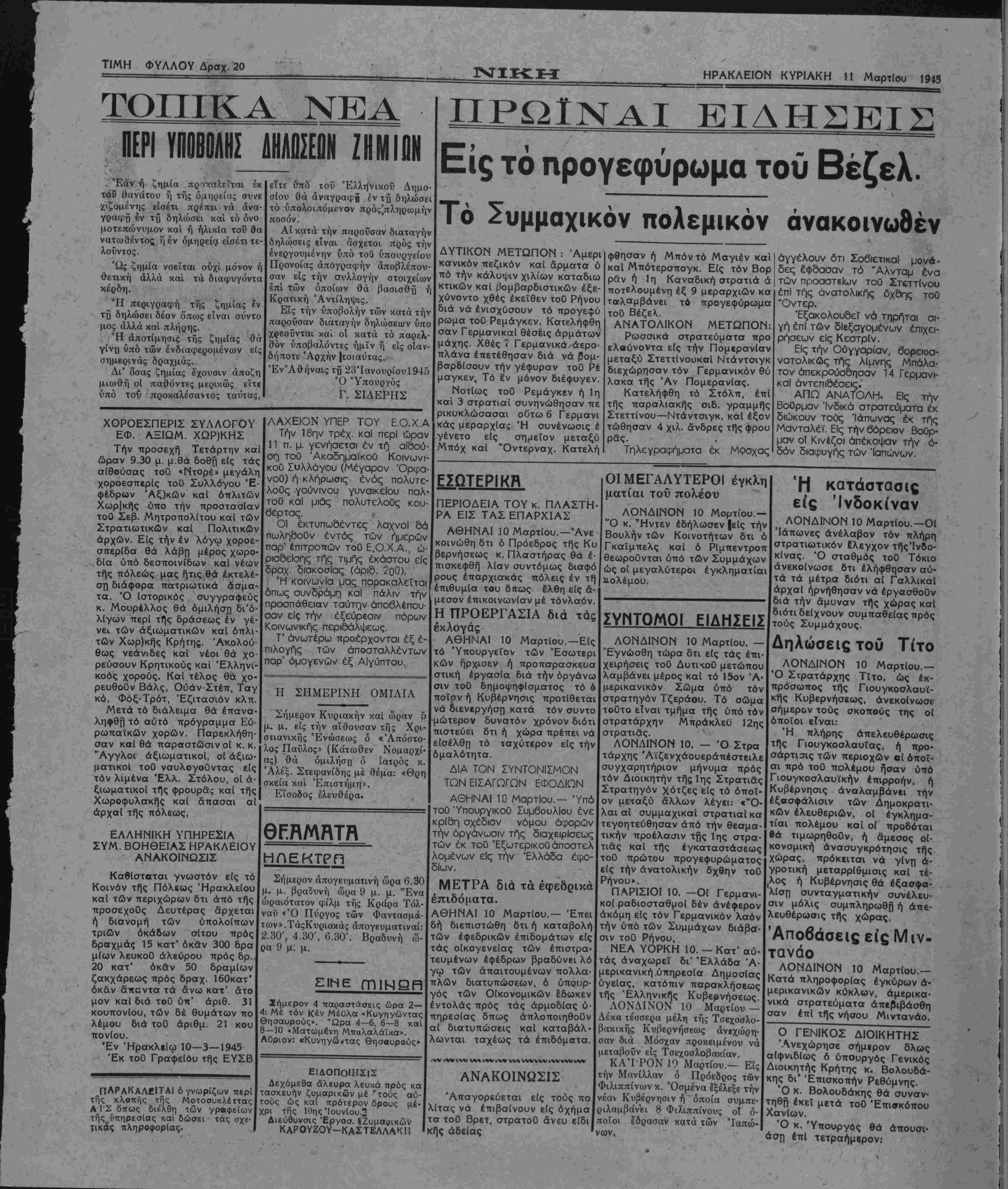 διώκουν τους Ίάπωνας έ< τής Μανταλέϊ. Είς την βόρειον Βοθρ¬ μαν οί Κινέζοι άπέκοψαν την ο¬ δόν διαφυγής των 'Ιαπώνων. ΕΣΩΤΕΡΙΚΗ ΠΕΡΙΟΔΕΙΑ ΤΟΥ κ. ΠΛΑΣΤΗ- ΡΑ ΕΙΣ ΤΑΣ ΕΠΑΡΧΙΑΣ ΑΘΗΝΑΙ 10 Μαρτίου.—Άνε κοινώθη δτι ό Πρόεδρος τής Κυ βερνήσεως κ. Πλαστήρας θά ε¬ πισκεφθή λίαν συντόμως διαφό ρους επαρχιακάς πόλεις έν τή έπιθυμία τού δπως Ιλθη είς ά¬ μεσον επικοινωνίαν μέ τόνλαόν. Η ΠΡΟΕΡΓΑΣΙΑ διά τάς εκλογάς ΑΘΗΝΑΙ 10 Μσρτίου. —Είς τό Υπουργείον των Έσωτερι κων ήρχισεν ή προπαρασκευα στική έργασία διά την όργάνω σιν τοθ δημοψηφίσματος τό 6 ποίον ή Κυβέρνησις προτίθεται νά διενεργηθή κατά τόν συντο μώτερον δυνατόν χρόνον διότι πιστεΰει δτι ή χώρα πρέπει νά εισέλθη τό ταχύτερον είς την όμαλότητα. ΔΙΑ ΤΟΝ ΣΥΝΤΟΝΙΣΜΟΝ ΤΩΝΕΙΣΑΓΩΓΩΝ ΕΦΟΔΙΩΝ ΑΘΗΝΑΙ 10 Μαρτίου.— Υπό τού 'Υπουργικοϋ Συμβουλίου ένε κρίδή σχέδιον νόμου αφορών την οργάνωσιν τής διαχειρίσεως των έκ τοϋ 'Εξωτερικοϋ άποστελ λομένων είς την 'Ελλάδα έφο- δΐων. ΜΕΤΡΑ διά τα έφεδρικά επιδόματα. ΑΘΗΝΑΙ 10 Μαρτίου.— 'Επει δή διεπιστώθη δτι ή καταβολή των έφεδρικών έπιδομάτων είς τάς οικογενείας των έπιστρα- τευμένων εφέδρων βραδΰνει λό γφ των απαιτουμένων πολλα- πλών διατυπώσεων, ό ύπουρ¬ γός των Οίκονομικών έδωκεν έντολάς πρός τάς αρμοδίας υ¬ πηρεσίας δπως άπλοποιηθοϋν αί διατυπώσεις καί καταβάλ¬ λονται ταχέως τα έπιδόμοτα. ΑΝΑΚΟΙΝΩΣΙΣ Άπαγορεΰεται είς τούς πό λιτάς νά έπιβαίνουν είς όχήμα τα τοθ Βρετ, στρατοΟ άνευ ίίδι κης αδείας ' ΟΙΜΕΓΑΛΥΤΕΡΟΙ έγκλη ματίαι τοΰ πολέου ΛΟΝΔΙΝΟΝ 10 Μομτίου,— Ό κ. ΤΗντεν εδήλωσεν |ε(ς την Βουλήν των Κοινοτήτων δτι ό Γκαϊμπελς καΐ δ Ρίμπεντροπ θεωροΰνται υπό των Συμμάχων ώς οί μεγαλΰτεροι έγκληματίαι Πολέμου. ΣΥΜΤΟΜΟΙ ΕΙΔΗΣΕΙΣ ΛΟΝΔΙΝΟΝ 10 Μαρτίου. — Εγνώσθη τώρα δτι είς τάς έπι- χειρήσεις τοθ ΔυτιχοΟ μετώπου λαμβάνει μέρος καί τό 15ον Α¬ μερικανικόν Σώμα υπό τόν στρατηγόν Τζεράου. Τό σώμα τουτο είναι τμήμα τής υπό τόν στρατάρχην Μπράκλεϋ 12ης στρατιδς. ΛΟΝΔΙΝΟΝ 10. — Ό Στρα τάμχης Άϊζενχάουεράπέστειλε συγχαρητήριον μήνυμα πρός τόν Διοικητήν τής 1ης Στρστιάς Στρατηγόν χότζες είς τό όποΓ- ον μεταξύ άλλων λέγει: «"Ο¬ λαι αί συμμαχικαί στρατιαί κα τεγοητεύθησαν άπό την θεαμα- τικήν προέλασιν τής 1ης στρα- τιάς καί τής εγκαταστάσεως τοθ πρώτου προγεφυρώματος είς την ανατολικήν δχθην τοϋ Ρήνου». ΠΑΡΙΣΙΟΙ 10. —Οί Γερμανι- κοί ραδιοσταθμοί δέν άνέφερον άκόμη είς τόν Γερμανικόν λαόν την υπό των Συμμάχων διάβα¬ σιν τοϋ Ρήνου, ΝΕΑ ΥΟΡΚΗ 10. — Κατ' αύ¬ τάς αναχωρεί δι' Έλλάδα Ά- μερικανική ύπηρεοία Δημοσίας ύγείας, κατόπιν παρακλήσεως τής Ελληνικάς Κυβερνήσεως. ΛΟΝΔΙΝΟΝ 10 Μαρτίου — Δέκα τέσσερα μέλη τής Τσεχοσλο- βακικής Κυβερνήσεως ανεχώρη¬ σαν διά Μόσχαν προκειμένου νά μεταβοϋν είς Τσεχοσλοβακίαν. ΚΑΤΡΟΝ 10 Μαρτίου.— Είς την Μανίλλαν ό Πρόεδρος των Φιλιππίνων κ. Όσμένα εξέλεξε την νέαν Κυβέρνησιν ή όποία συμπε- ριλαμβάν'ει 8 Φιλιππίνους οί ό- ποΐοι έδρασαν κατά των Ίαπώ· νων. Ή κατάστασις είς Ίνδοκίναν ΛΟΝΔΙΝΟΝ 10 Μαρτίου.—Οί Ίάπωνες ανέλαβον τόν πλήρη στρατιωτικόν έλεγχον τής'Ινδο- κίνας. Ό σταθμός τοθ Τόκιο ανεκοίνωσε δτι ελήφθησαν αύ- τά τα μέτρα διότι αί Γαλλικαί αρχαί ηρνήθησαν νά έργασθοθν διά την άμυναν τής χώρας καί διότι δείχνουν συμπαθείας πρός τοΰς Συμμάχους. Δηλώσεις τού Τίτο ΛΟΝΔΙΝΟΝ 10 Μαρτΐου.— Ό Στρατάρχης Τϊτο, ώς έκ- πρόσωπος τής Γιουγκοσλαυί- κής Κυβερνήσεως, ανεκοίνωσε σήμερον τούς σκοπούς της οί όποΐοι είναι: Ή πλήρης άπελευθέρωσις τής Γιουγκοσλαυΐας, ή προ- σά
