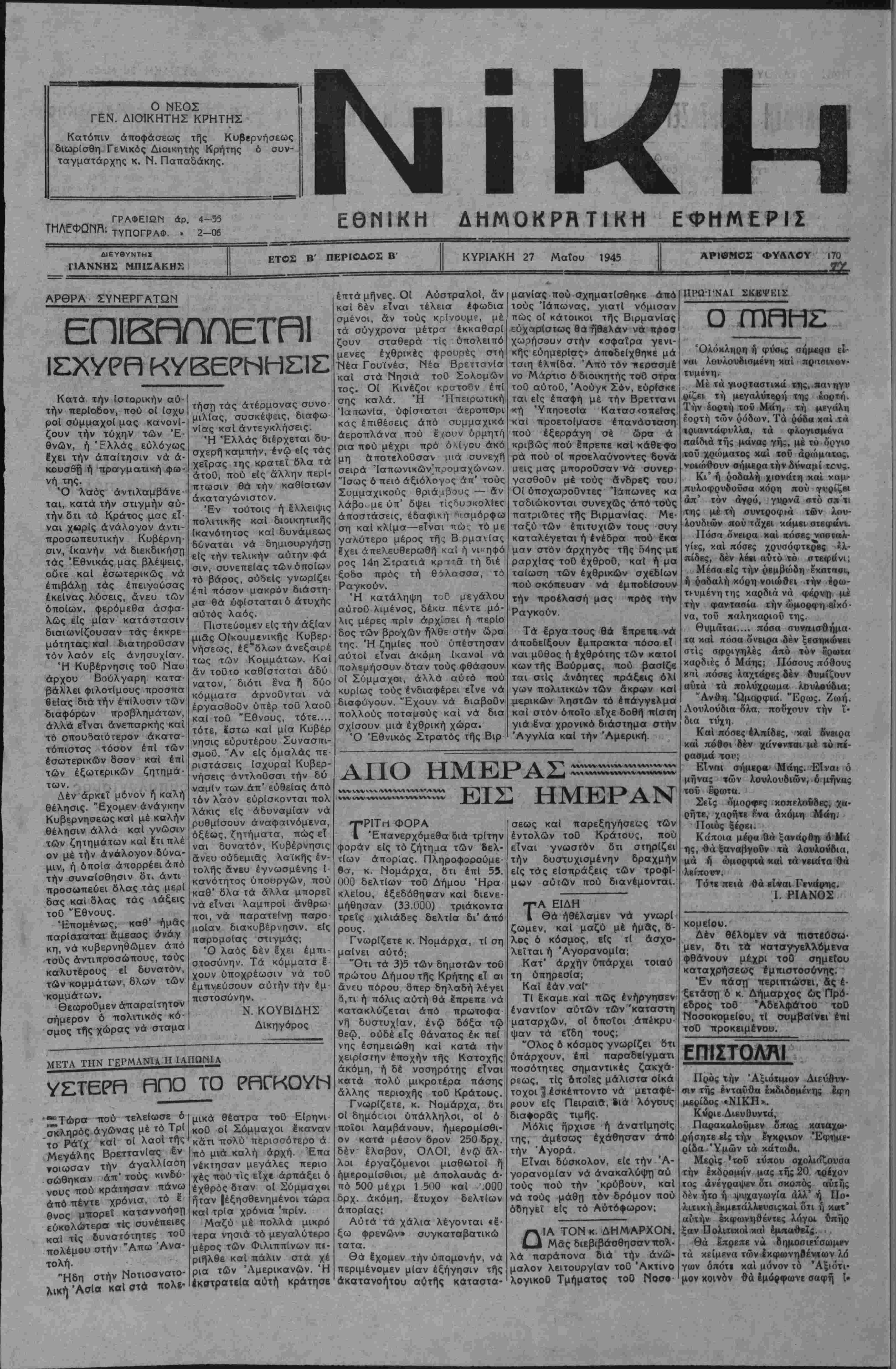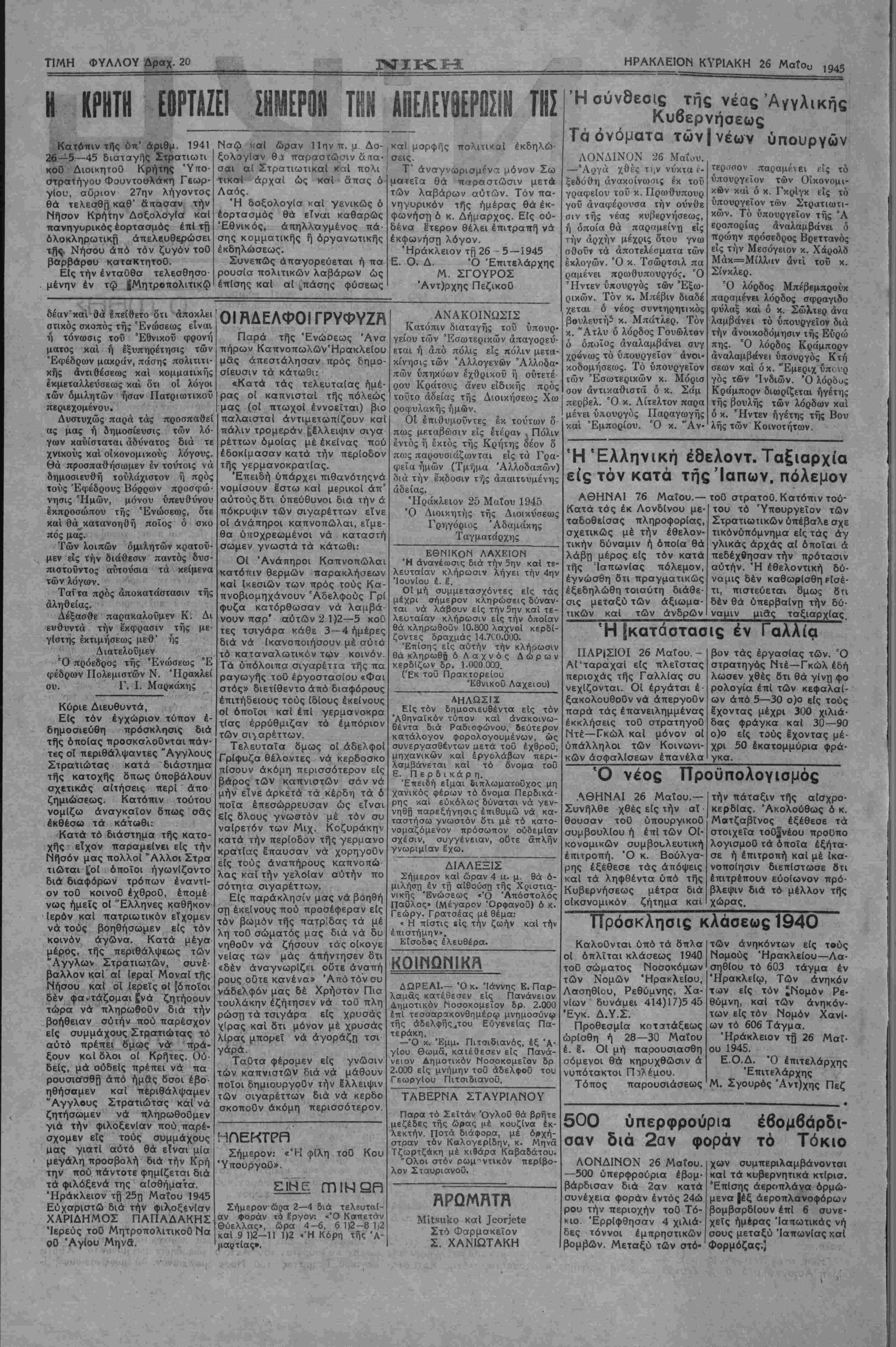 σεων καί ό κ. Έμεριχ ύπ< 'ρ γός των Ίνδιών. Ό λόρόυς Κράμπορν διωρίζεται ήγέτης τής βουλής των λορδων καί ό κ. Ήντεν ήγέτης τής Βου λής των Κοινοτήτων. ΉΈλληνική έθελοντ. Ταξιαρχία είς τόν κατά τής Ιαπων, πόλεμον ΑΘΗΝΑΙ 76 Μαΐου.— Κατά τάς έκ Λονδίνου με- ταδοθείσας πληροφορίας, σχετικώς μέ την έθελον- τικήν δύναμιν ή όποία θά λάβτ) μέρος είς τόν κατά τής Ίαπωνίας πόλεμον, εγνώσθη δτι πραγματικώς εξεδηλώθη τοιαύτη διάθε¬ σις μεταξύ των αξιωμα¬ τικών καί των άνδρων τού στρατοθ. Κατόπιν τού¬ του τό Υπουργείον των Στρατιωτικών υπέβαλε σχε τικόνύπόμνημα είς τάς αγ γλικάς αρχάς αί οποίαι ά πεδέχθησαν την πρότασιν αυτήν. Ή έθελοντική δύ¬ ναμις δέν καθωρίσθη εισέ¬ τι, πιστεύεται δμως δτι δέν θά ύπερβαΐνη την δύ- ναμιν μιας ταξιαρχίας. Ή[καταστασίς έν Γαλλία ΠΑΡΙΣΙΟΙ 26 Μαΐου. - ΑΙ "ταραχαί είς πλείστας περιοχάς τής ΓαλλΙας συ νεχΐζονται. Οί εργάται έ- ξακολουθοθν νά άπεργοθν παρά τάς επανειλημμένας έκκλήσεις τοθ στρατηγοθ Ντέ—Γκώλ καί μόνον οί ύπάλληλοι των Κοινωνι- κών άσφαλΐσεων έπανέλα βον τάς εργασίας των. Ό στρατηγός Ντέ—Γκώλ έδή λωσεν χθές 8τι θά γίνη φο ρολογία επί των κεφαλαί¬ ων άπό 5—30 ο)ο είς τούς εχοντας μέχρι 300 χιλιά¬ δας φράγκα καί 30—90 ο)ο είς τούς εχοντας μέ· χρι 50 έκατομμύρια φρά¬ γκα. Ό νέος Προϋπολογισμός ΑΘΗΝΑΙ 26 Μαΐου.— Συνήλθε χθές είς την αϊ ■ θουσαν τοθ ύπουργικοϋ συμβουλΐου ή επί των ΟΙ· κονομικών συμβουλευτική έπιτροπή. Ό κ. Βούλγα- ρης εξέθεσε τάς άπόψεις καί τα ληφθέντα υπό τής Κυβερνήσεως μέτρα διά οικονομικόν ζήτημα καί την πάταξιν τής αΐσχρο- κερδίας. Ακολούθως ό κ. Μβτζαβΐνος εξέθεσε τα στοιχεΐα το0|νέου προϋπο λογισμοθ τα όποία εξήτα¬ σε ή έπιτροπή καί μέ Ικα¬ νοποίησιν διεπίστωσε δτι έπιτρέπουν εύοίωνον πρό- βλεψιν διά τό μέλλον τή"ς χώρας. Πρόσκλησις κλάσεως 1940 Καλοθνται υπό τα δττλα οί οπλίται κλάσεως 1940 τοθ σώματος Νοσοκόμων των Νομών Ηρακλείου, Λασηθίου, Ρεθύμνης, Χα¬ νίων δυνάμει 414)17)5 45 'Εγκ. Δ.Υ.Σ. ΠροθεσμΙα κοταιτάξεως ωρίσθη ή 28—30 Μαΐου έ. ί. ΟΙ μή παρουσιασθή σόμενοι θά κηρυχθώσιν ά νυπότακτοι Π5λέμου. Τόπος παρουσιάσεως των ανηκόντων είς τ·ύς Νομούς Ηρακλείου—Λα¬ σηθίου τό 603 τάγμα έν Ηρακλείω, Των άνηκόν τιον είς τόν £Νομόν Ρε- θύμνη, καί των ανηκόν¬ των είς τόν Νομόν Χανί¬ ων τό 606 Τάγμα. Ηράκλειον τή 26 Μαΐ¬ ου 1945. Ε.Ο.Δ. Ό επιτελάρχης Έπιτϊλάρχης Μ. Σγουρός Άντ)χης Πεζ 500 ύπερφρούρια έβομβάρδο σαν διά 2αν φοράν τό Τόκιο ΛΟΝΔΙΝΟΝ 26 Μαΐου. —500 ύπερφρούρια έβομ· βάρδισαν διά 2αν κατά συνέχεια φοράν έντός 24ώ ρου την περιοχήν τοθ Τό¬ κιο Έρρίφθησαν 4 χιλιά- δες τόννοι έμπρηστικών βομβών. Μεταξύ των στό- χων συμπεριλαμβάνονται καί τα κυβερνητικά κτίρια. Έπίσης άεροπλάνα όρμώ· μενά |έξ άεροπλανοψόρω/ βομβαρδίουν επί 6 συνε- χεΐς ημέρας Ίαπωτικάς νή σους μεταξύ Ίαπωνίας χαί Φορμόζας.)