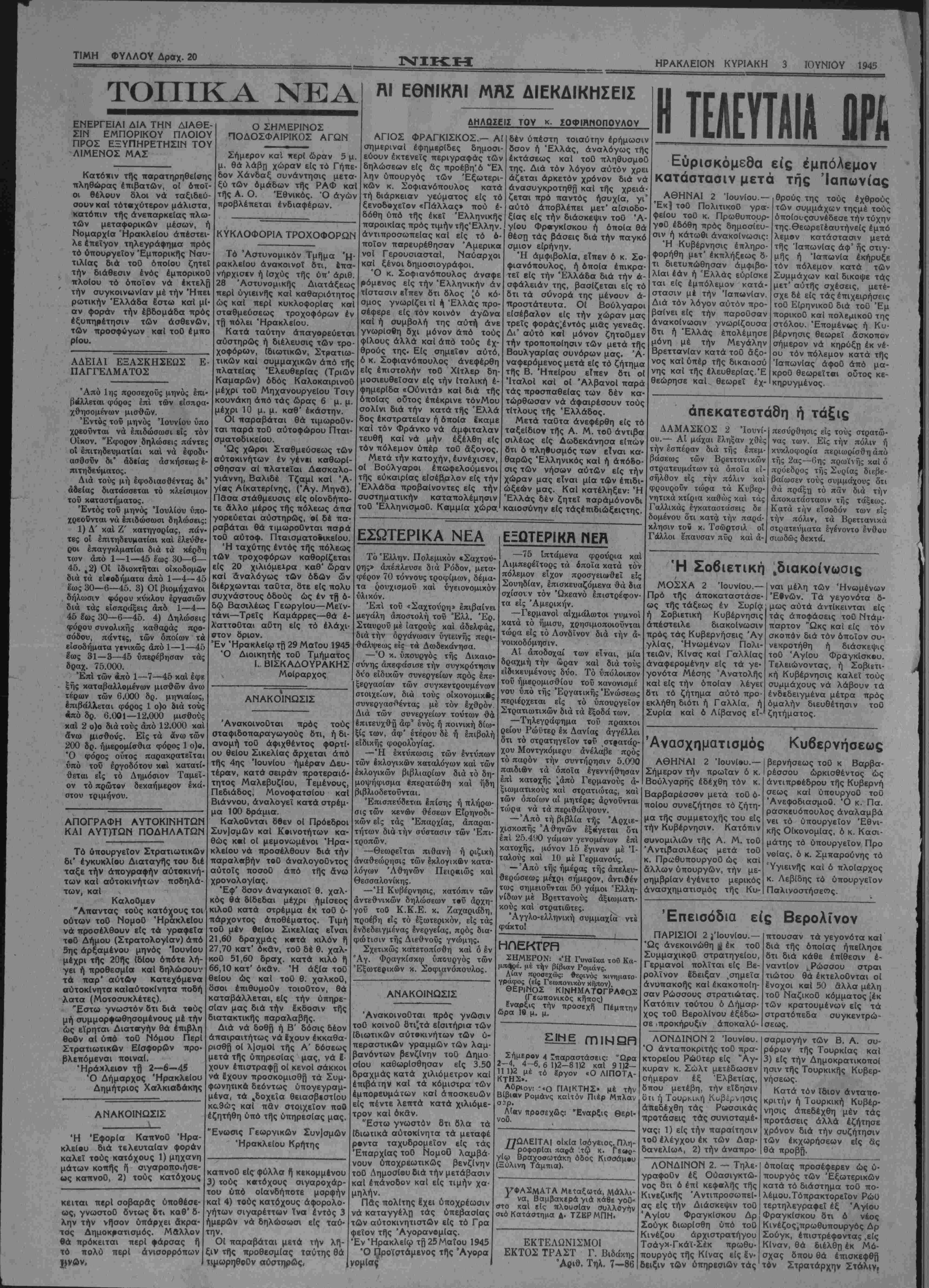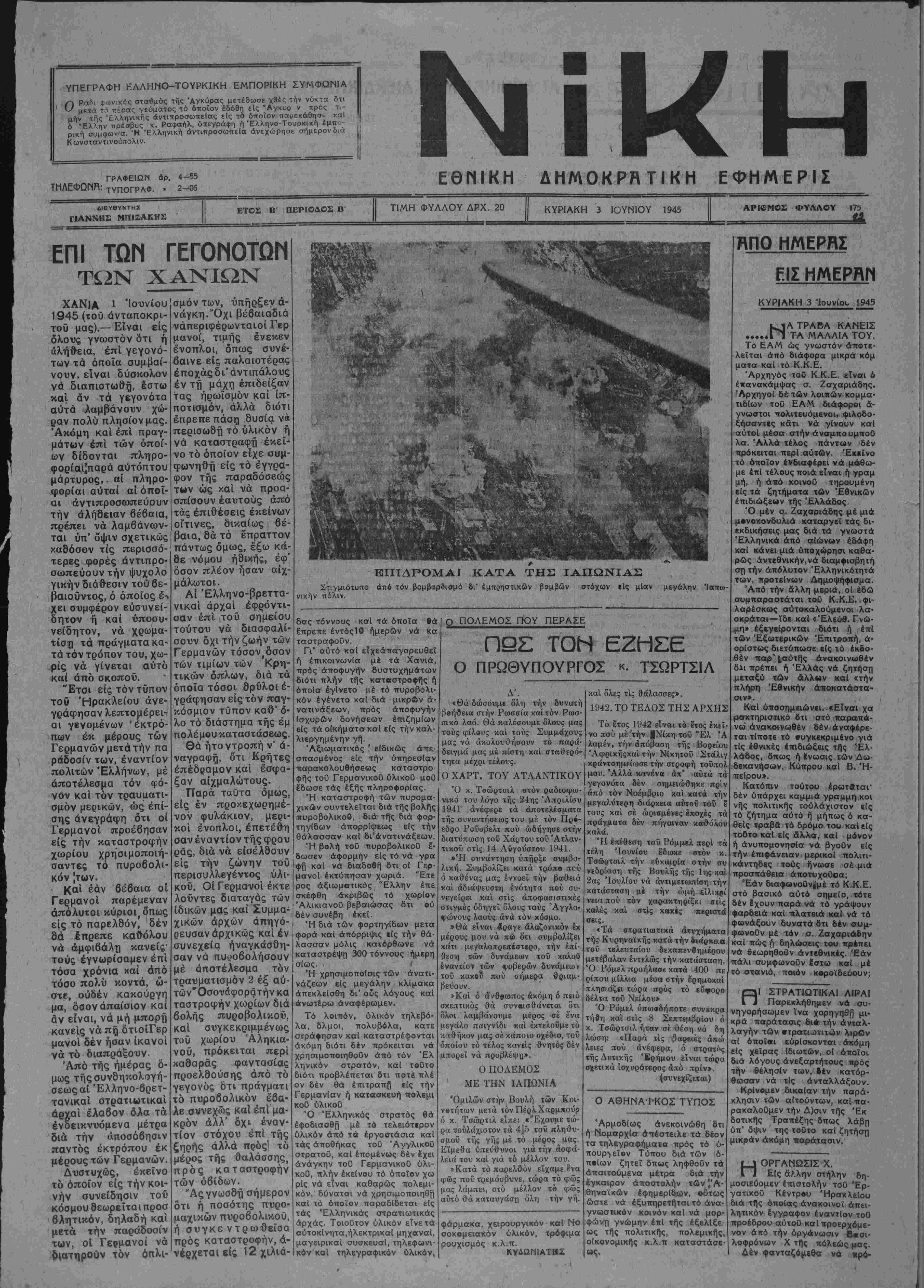 ό "Ελλην πρέσβυς κ. Ραφαήλ, υπεγράφη ή Έλληνο-Τουρκική έμττ< - ρική συμφωνα "Η Ελληνική άντιπροσωπεία ανεχώρησε σήμερον δια Κ ωνσταντινούπολιν. ΓΡΑΦΕΙΩΝ άρ. 4—55 ΤΗΛΕΦΩΠΟ: τυπογραφ. · 2-06 ΕΘΠΙΚΗ ΔΗΜΟΚΡΑΤΙΚΑΙ ΕΦΗΜΕΡΙΣ ΔΙΕΥβΥΝΤΗΧ ΓΙΑΝΝΗΣ ΜΠΙΖΑΚΗΣ ΕΤΟΣ Β' ΠΕΡΙΟΔΟΣ Β ΤΙΜΗ ΦΥΛΛΟΥ ΔΡΧ. 20 ΚΥΡΙΑΚΗ 3 1ΟΥΝΙΟΥ 1945 ΕΠΙ ΤΩΜ ΓΕΓΟΝΟΤΩΓ. ΤΩΝ ΧΑΝΙΩΝ ΧΑΝΙΑ 1 Ίουνίου' 1945 (τού άνταποκρι- τού μας).— Είναι είς δλους γνωστόν ότι ή άλήθεια, επί γεγονό- των τα όποϊα συμβαί- νουν, είναι δύσκολον νά διαπιστωθη, έστω καί άν τα γεγονότα αύτά λαμβάνουν χώ¬ ραν πολύ πλησίον μας. Άκόμη καί επί πραγ- μάτων επι των οποί¬ ων δίδονται πληρο- φορίαιΐπαρά αύτόπτου μάρτυρος,. αί πληρο¬ φορίαι αύται αί οποί¬ αι άντιπροσωπεύουν την αλήθειαν βεβαία, πρέπει νά λαμβάνων- ται ύπ' όψιν σχετικώς καθόσον τίς περισσό- τερες φορές άντιπρο- σωπεύουν την ψυχολο γικήν διάθεσιν τού 6ε- βαιοΰντος, ό οποίος έ-, χει συμφέρον ευσυνεί¬ δητον ή καί ύποσυ- νείδητον, νά χρωμα- τίση τα πράγματακα- τά τόν τρόπον τού, χω- ,ρίς νά γίνεται αΰτό καϊ άπό σκοποΰ. "Ετσι είς τόν τύπον τοϋ Ηρακλείου άνε- γράφησαν λεπτομερείς αι γενομένων 'έκτρό- πων έκ μέρους των Γερμανώνμετάτήν πά ράδοσίν των, εναντίον πολιτών Έλλήνων, μέ άποτέλεσμα τόν φό- νόν καί τόν τραυυατι- σμόν μερικών, ώς έπί- σης ανεγράφη ότι οί Γερμανοί προέβησαν είς την καταστροφήν χωρίου χρησιμοποιή- σαντες τό πυροβολι- κόν [των. Καί εάν βεβαία οί Γερμανοί παρέμεναν άπόλυτοι κύριοι,δπως είς τό παρελθόν) δέν θά έπρεπε καθόλου νά άμφιβάλη κανείς' τούς έγνωρίσαμεν επί τόσα χρόνια καϊ άπό τόσο πολύ κοντά, ώ- στε, ουδέν κακούργη μα, δσον απαίσιον καί άν είναι, νά μή μπορή κανείς νά πή ότιοίΓερ μανοί δέν ήσαν Ικανοί νά τό διαπράξουν. Άπό τής ημέρας ό- μως τήςσυνδηκολογή- σεωςαί 'Ελληνο-βρετ- τανικαί στρατιωτικαί αρχαί έλαβον δλα τα ενδεικνυόμενα μέτρα διά την αποσόβησιν παντός έκτρόπου έκ μέρους των Γερμανών. Δυστυχώς, έκεΐνο τό οποίον είς την κοι¬ νήν συνείδησιν τοΰ κόσμου θεωρεΐται προσ βλητικόν, δηλαδή καί μετά την παράδοσίν των, οί Γερμανοί νά διατηροϋν τόν οπλι¬ σμόν των, υπήρξεν ά- νάγκη.Όχι βέβαιαδιά νάπεριφέρωνταιοί Γερ μανοί, τιμής ένεκεν ένοπλοι, όπως συνέ- βαινε είς παλαιοτέρας εποχάς δι* άντιπάλους έν τη μάχη έπιδείξαν τας ηρωϊσμόν καί ίι· ποτισμόν, άλλά διότι έπρεπε πάση θυσΐα ν« περισωοχ) τό υλικόν ή νά καταστραφη έκεί- νο τό οποίον εϊχε συμ- φωνηθή είς τό έγγρα¬ φον τής παραδόσεως των ώς καί νά προα- σπίσουν εαυτούς άπό τάς έπιθέσεις έκείνων οΓτινες, δικαίως βε¬ βαία, Θά τό επραττον πάντως δμως, έξω κά- θε νόμου ήδικής, έφ' όσον πλέον ήσαν αίχ- μάλωτοι. Αί "Ελληνο-βρεττα- νικαί αρχαί εφρόντι¬ σαν επί τού σημείου τούτου νά διασφαλί- σουν δχι τήνζωήν των Γερμανών τόσον^σον των τιμίων των Κρη- τικών δπλων, διά τα όποΐα τόσοι θρΰλοι ε¬ γράφησαν είς τόν παγ¬ κόσμιον τύπον καθ" δ· λο τό διάστημα τής έμ πολέμου καταστάσεως. Θά ήτοντροπή ν' ά- ναγραφή, ότι Κρήτες έπέδραμον καί έσφα- ξαν αίχμαλώτους. Παρά ταύτα δμως, είς έν προκεχωρημέ- νον φυλάκιον, μερι- κοί ένοπλοι, επετέθη σαν εναντίον τής φρου ράς, διά νά εισέλθουν είς την ζώνην τοΰ περισυλλεγέντος ύλι- κοΰ. Οί Γερμανοί έκτε λοΰντες διαταγάς των ιδικών μας καί Συμμα- χικών άρχών άπηγό- ρευσαν αρχικώς καί έν συνεχεία ηναγκάσθη¬ σαν νά πυυοβολήσουν μέ άποτέλεσμα τόν τραυματισμόν 2 έξ αύ- τών'Οσονάφοράτήν κα ταστροφήν χωρίων διά βολής πυροβολικοϋ, καί συγκεκριμένως τού χωρίου Άληκια- νού, πρόκειται περί χαθαράς φαντασίας προελθούση