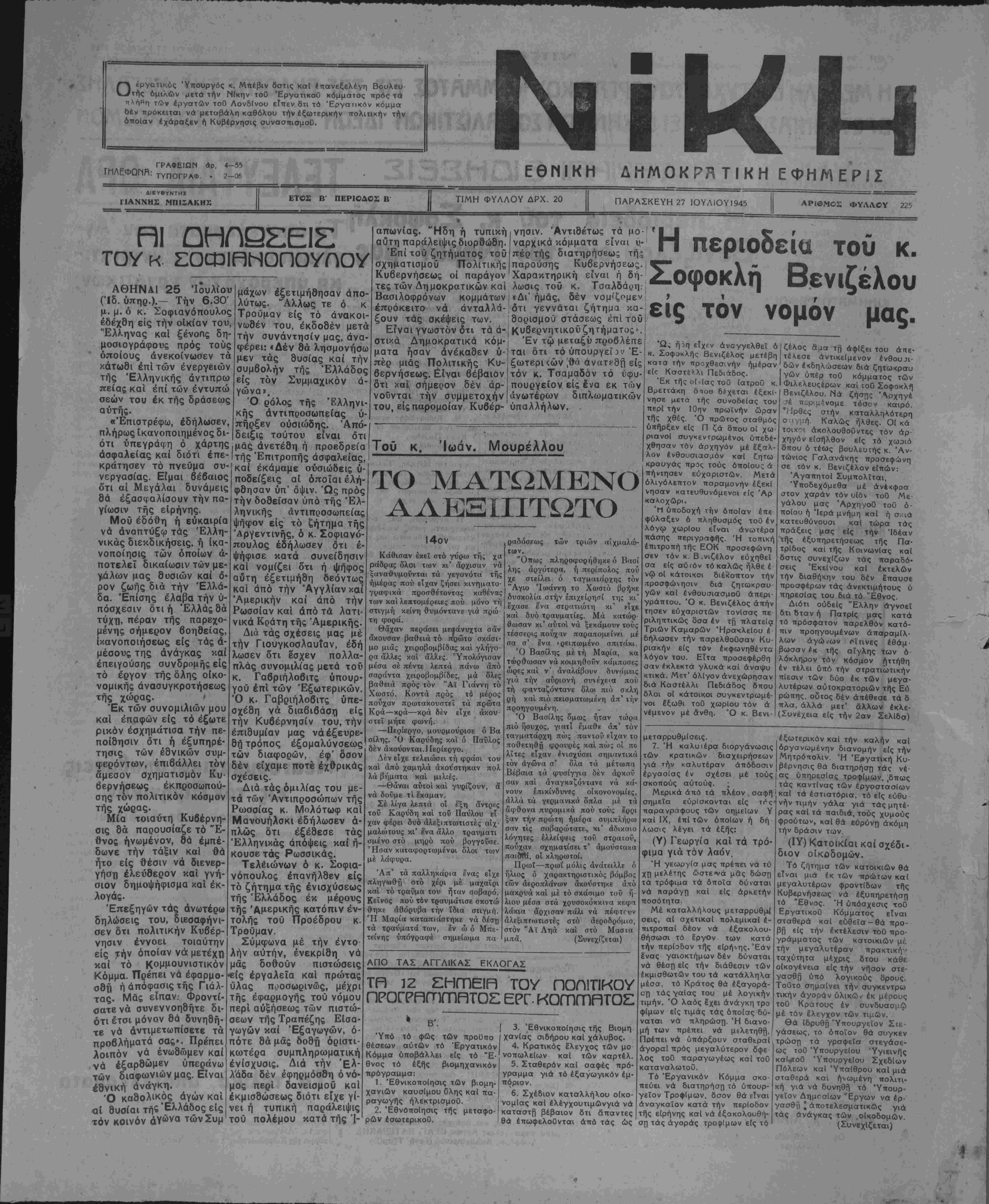 ΓΡΑΦΕΙΩΝ <*ρ. 4-55 ΤΜΛΕΦΟ.ΜΚ: ΤΥΠΟΓΡΑΦ. . 2_06 ΕΘΜΙΚΗ ΔιΊΜΟΚΡλΤΙΚΗ ΕΦΗΜΕΡΙΣ ΔΙΕΥβΥΝΤΗΙ ΓΙΑΝΝΗΣ ΜΠΙΖΑΚΗΧ ΕΤΟΣ Β ΠΕΡΙΟΔΟΣ Β ΤΙΜΗ ΦΥΛΛΟΥ ΔΡΧ. 20 ΠΑΡΑΣΚΕΥΗ 27 1ΟΥΛ1ΟΥ1945 ΑΡΙΟΜΟΣ ΦΥΛΛΟΥ 225 οι πηποσεισ: ΤΟΥ κ. ΣΟΦΙλΝΟΠΟΥΠΟΥ ΑΘΗΝΑΙ 25 Ιουλίου (Ίδ. ύπηρ.).— Την 6.30' μ. μ. ό κ. Σοφιανόπουλος εδέχθη είς την οίκίαν τού, Έλληνας καΐ ξένοης δη- μοσιογράφους πρός τούς όποίους ανεκοίνωσεν τα κάτωθι επί των ένεργειών τής Έλληνικής άντιπρω πείας καί έπϊ των έντυπώ σεών τού έκ τής δράσεώς αυτής. «Έπιστρέφω, εδήλωσεν, πλήρως ίκανοποιημένος δι¬ ότι υπεγράφη ό χάρτης ασφαλείας καΐ διότι έπε- κράτησεν τό πνεΰμα συ- νεργασίας. Εΐμαι βέβαιος δτι αί Μεγάλαι δυνάμεις θά έξασφαλίσουν την πα¬ γίωσιν τής είρήνης. Μοΰ εδόθη ή εύκαιρία νά άναπτύξω τάς Ελλη¬ νικάς διεκδικήσεις, ή ίκα- νοποίησις των οποίων α¬ ποτελεί δικαίωσιν των με- γϋλων μας Θυσιών καΐ ό¬ ρον ζωής διά την Έλλά- δα. Έπίσης έλαβα την υ¬ πόσχεσιν δτιή Ελλάς θά τύχτι, πέραν τής παρεχο- μένης σήμερον βοηθείας, ικανοποιήσεως είς τάς ά- μέσους της ανάγκας «αί επειγούσης συνδρομής είς τό έργον τής δλης οίκο- νομικής ανασυγκροτήσεως τής χώρας. » Έκ των συνομιλιών μου καί έπαφών είς τό έξωτε ρΐκόν έσχημάτΐσα την πε¬ ποίθησιν ότι ή εξυπηρέ¬ τησις των έθνικών συμ- φερόντων, επιβάλλει τόν άμεσον σχηματισμόν Κυ¬ βερνήσεως έκπροσωπού- σης τόν πολιτικόν κόσμον τής χώρας. Μία τοιαύτη Κυβέρνη¬ σις θά παρουσίαζε τό "Ε- θνος ηνωμένον, Θά έμπέ- δωνε την τάξιν καΐ θά ήτο είς θέσιν νά διενερ¬ γηθή ελεύθερον καί γνή¬ σιον δημοψήφισμα καί εκ¬ λογάς. Έπεξηγών τάς ανωτέρω δηλώσεις τού, διεσαφήνι- σεν δτι πολιτικήν Κυβέρ¬ νησιν έννοει τοιαύτην είς την οποίαν νά μετέχη καΐ τό Κ°μμ°υνιστικόν μάχων εξετιμήθησαν απο¬ λύτως. "Αλλως τε ό κ Τροΰμαν είς τό ανακοι¬ νωθέν τού, εκδοθέν μετά την συνάντησιν μας, άνα- φέρει: «Δέν θά λησμονήσω μέν τάς θυσίας καΐ την συμβολήν τής Ελλάδος είς τόν Συμμαχικόν ά- γώνα». Ό ρόλος τής Έλληνι¬ κής άντιπροσωπείας υ¬ πήρξεν ούσιώδης. Άπό- σθή Π απόφασις τής Γιάλ- τας. Μάς είπαν.· Φροντί- οατενά συνεννοηδήτε δι¬ ότι έτσι μόνον θά δυνηθή- τε νά άντιμετωπίσετε τα προβλήματά σας». Πρέπει λοιπόν νά ένωθώμεν καΐ νά έξαρθώμεν υπεράνω των διαφωνιών μας. Είναι έθνική άνάγκη. Ό καθολικρς αγών καί αί θυσίαι τή£ Ελλάδος είς τόν κοινόν άΥώνατών Συμ δειξις τούτου μάς ανετέθη ή είναι ότι προεδρεία τής Έπιτροπής ασφαλείας, καί έκάμαμε ούσιώδεις ύ- ποδείξεις αί οποίαι ελή¬ φθησαν ύπ' όψιν. Ώς πρός την δοθείσαν υπό τής Έλ¬ ληνικής άντιπροσωπείας ψήφον είς τό ξήτημα τής Άργεντινής, ό κ. Σοφιανό¬ πουλος εδήλωσεν ότι ε¬ ψήφισε κατά συνείδησιν καΐ νομίζει δτι ή ψήφος αύτη έξετψήθη δεόντως και άπό την Αγγλίαν καΐ Αμερικήν καΐ άπό την Ρωσσίαν καΐ άπό τα λατι- νικά Κράτη τής Άμερικής. Διά τάς σχέσεις μας μέ την Γιουγκοσλαυίαν, έδή λωσεν δτι έσχεν πολλα- πλάς συνομιλίας μετά τού κ. Γαβριήλοβιτς ύπουρ- γοϋ επί των Εξωτερικών. Ό κ· Γαβριήλοβιτς υπε¬ σχέθη νά διαβιβάση είς την Κυβέρνησιν τού, την επιθυμίαν μας νά εξευρε¬ θή τρόπος έξομαλύνσεως των διαφόρων, έφ' δσον δέν είχαμε ποτέ έχθρικάς σχέσεις. Διά τάς όμιλίας τού με¬ τά των Άντιπροσώπων τής Ρωσσίας κ. Μολότωφ καί Μανουήλσκι εδήλωσεν α¬ πλώς δτι εξέθεσε τάς Ελληνικάς άπόψεις καί ή¬ κουσε τάς Ρωσσικάς. Τελέιώνων ό κ. Σοφια¬ νόπουλος επανήλθεν είς τό ζήτημα τής ένισχύσεως τής Ελλάδος έκ μέρους τής Άμερικής κατόπιν έν- τολής τού ΤΤροέδρου κ. Τροΰμαν. απωνίας. "Ηδη ή τυπική αύτη παράλειψιςδιορθώθη. Επί τού ζητή