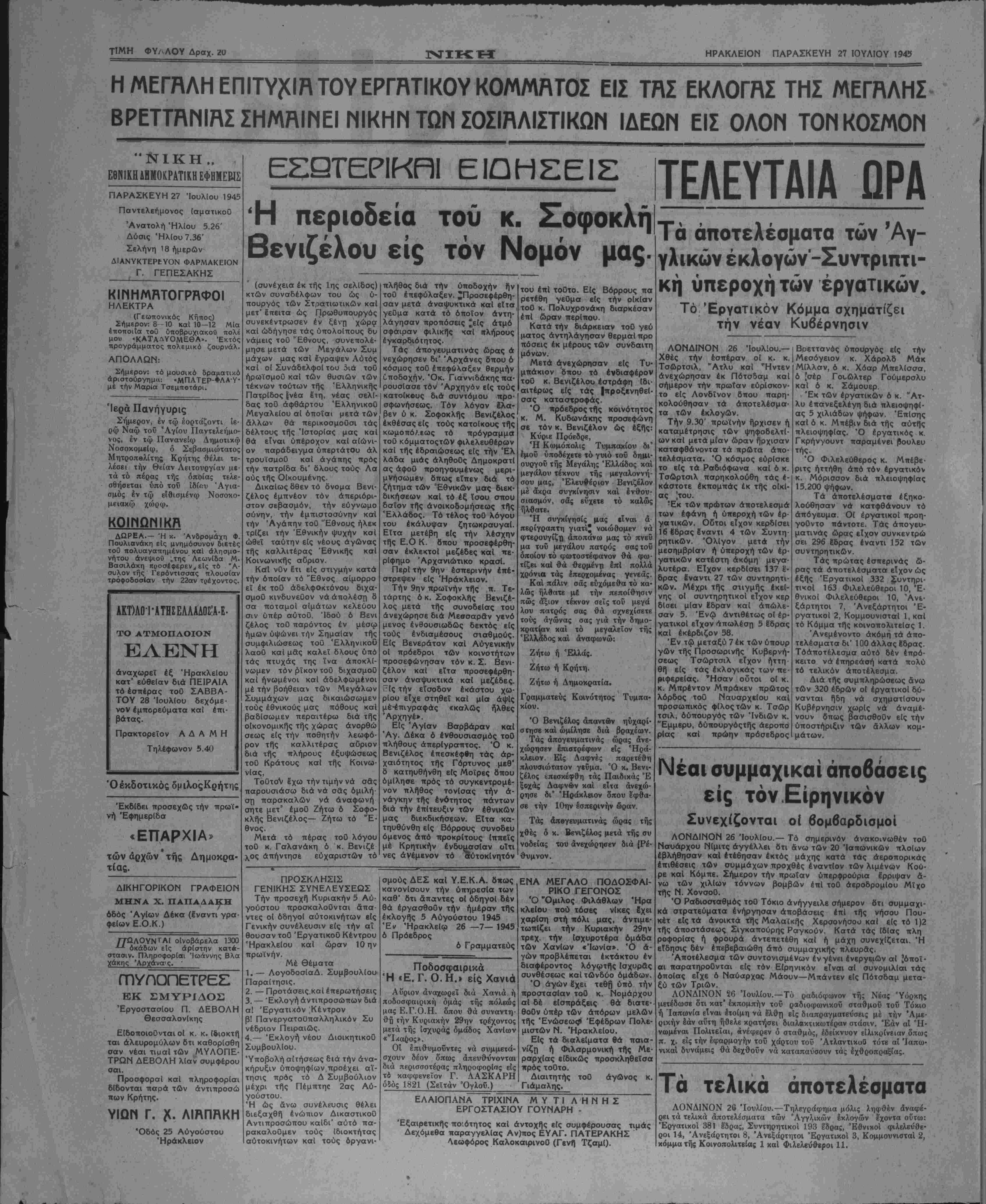 σαν τίς σοβαρώτατε<, κι' άδικαιο λόγητες έλλείψεις τού στρατοΰ, πούχαν σχηματίσει τ' άμούσΐακα παισττί, οί κληρωτοί. Πρωΐ—πρωΐ μόλις άνάτειλλε ό ήλιος ό χαρακτηριστικός βόμβος των άεροπλάνων άκούστηκε άπό μακρυά καί μέ τό σκάσιμο τού η¬ λίου μέσα στά χρυσοκόκκινα κεφα λάκια άρχισαν πάλι νά πέφΤΓυν άλεξιπτιοτιστές στό άεροδρόμιο, στόν Άϊ Ληά καί στό Μαστα μπά. (Συνεχίζεται) ΑΠΟ ΤΑΣ ΑΓΓΛ1ΚΑΣ ΕΚΛΟΓΑΣ Τλ 1Ζ εΗΓΏΕΐΓΐ ΤΟΥ ΠΟΠΙΤΙΚΟΥ ΠΡΟΓΡΠίΊΓΊιΤΐΓΐΤΟΣ: ΕΡΓΛ ΚΟιΤΙΠηΡΙΤθε • Β'. Υπό τό φώς των προϋπο θέσεων αυτών τό Εργατικόν Κόμμα ύποβάλλει είς τό Έ- θνος τό εξής βιομηχανικόν πρόγραμμα: 1. 'ΕθνικοποΙησις των βιομη¬ χανίαν καυσΐμου Ολης καΐ πα¬ ραγωγήν ήλεκτρισμοθ. 2. ΈθνόποΙησις τής μεταφο- ρών έσωτερικοϋ. 3. 'Εθνικοποίησις τής Βιομη χανίας σιδήρου καί χάλυβος. 4. Κρατικάς έ"λεγχος των μο νοπωλεΐων καί των καρτέλ. 5. Σταθεράν καΐ σαφές πρό- γραμμα γιά τό εξαγωγικόν εμ¬ πόριον. 6. Σχέδιον καταλλήλου οίκο- νομΐας καί έλέγχουτιμώνγιά νά καταστή βέβαιον δτι άπαντες θά έπωφελοθντσι άπό τάς ώς Ώς ή 3η είχεν άνσγγελθεϊ ό κ. Σοφοκλής Βενιζέλος μετέβη κατά την προχθεσινήν ημέραν είς Καστέλλι Πεδιάδος. Έκ τής οικίας τοθ (ατροΰ κ. Βμεττάκη διο» δέχεται έξεκί- νησε μετα τής συνοδείας τού περί την ΙΟην πρωϊνήν ώραν τής χθές. Ό πρώτος σταθμός υπήρξεν είς Π ζά δπου οί χω· ριανοί συγκεντρωμένοι ύπεδέ- χθησαν τόν αρχηγόν μέ έξοτλ- λον ενθουσιασμόν καί ίητω κραυγάς πρός τούς όποίου; ά πήντησεν ευχαριστών. Μετά ολιγόλεπτον παραμονήν έξεκί νησαν κατευθυνόμενοι είς Άρ καλοχώρι. Ή ύποδοχή την οποίαν έπε φύλαξεν ό πληθυσμός τοθ έν λόγω χωρίου είναι ανωτέρα πάσης περιγραφάς. Ή τοπική έπιτροπή τής ΕΟΚ προσεφώνη σεν τόν κ. Β.νιζέλον εϋχηθεΐ σα είς αυτόν τό καλώς ήλθε έ· νώ οί κάτοικοι διέκοπτον την προσφώνησιν διά ζητωκραυ- γών καί ένθουσιασμοθ άπερι- γράπτου. Ό κ. Βενιζέλος άπήν τησεν ευχαριστών τονίσας πε ριληπτικως δσα έν τη πλατεία Τριών Καμάρων Ηρακλείου έ δήλωσεν την παρελθοθσαν Κυ¬ ριακήν είς τόν εκφωνηθέντα λόγον τού. Είτα προσεφέρθη σαν έκλεκτά γλυκά καί άναψυ κτικά. Μετ" ολίγον ανεχώρησαν διά Καστέλλι Πεδιάδος δπου δλοι οί κάτοικοι συγκεντρωμέ¬ νοι έξωθι τοθ χωρίου τόν ά νέμενον μέ άνθη. Ό κ. Βενι- ζέλος αμα τή αφίξει τού απε¬ τέλεσε αντικείμενον ένθου,η· δών έκδηλώσεων διά ζητωκραυ [ γών υπέρ τοθ κόμματος των Ι Φιλελευςέρων καί τοΟ Σοφοκλή 1 Βενιζέλου. Νά ζήσης Άρχηγέ ;έ π^ριμένομε τόσον καιρό. Τ1 Ιρθες στήν καταλληλότερη σιγμή. Καλώς ήλθες. Οί κά τοιν?ι άκολουθοΰντες τόν αρ¬ χηγόν εισήλθον είς τό χωοιό δπου ό τέως βουλευτής κ. Αν¬ τώνιος Γαλανάκης προσεφώνη σε τόν κ. Βενιζέλον ειπών: Άγαπητοί Συμπολίται, 'Υποδεχόμεθα μέ άνέκφοα στον χαράν τόν υϊόν τοθ Με- γάλου μας ΆρχηνοΟ τοθ ό- ποίου ή Ίερά μνήμη καί ή σκιά κατευθύνουσι καΐ τώρα τάς πράξεις μας είς την Ιδέαν τής εξυπηρετήσεως τής Πα¬ τρίδος καί τής Κοινωνίας καί δστις συνεχίζων τάς παραδό- σεις 'ΕκεΙνου καΐ έκτελών την διαθήκην τού δέν Επαυσε προσφέρων τάς άνεκτιμήτους ϋ πηρεσίας τού διά τό "Εθνος. Διότι ουδείς Έλλην άγνοεΐ δτι οταν ή Πατρίς μας κατά τό πρόσφατον παρελθόν κατό¬ πιν προηγουμένων άπαραμίλ- λων άγώι>ων οΐτινες έθάμ·